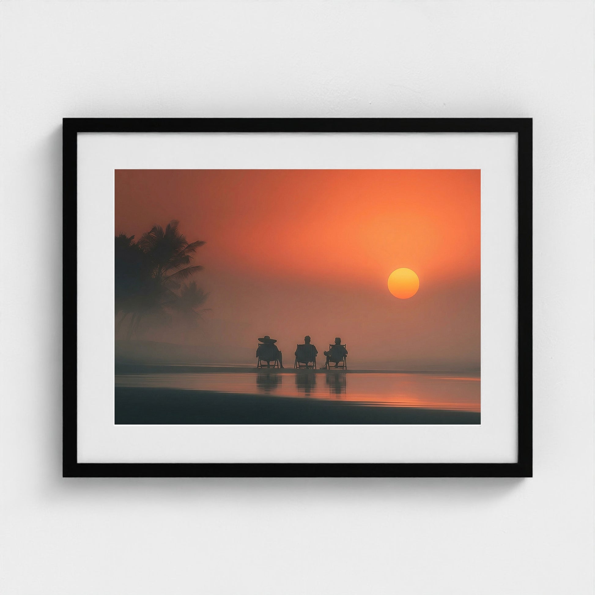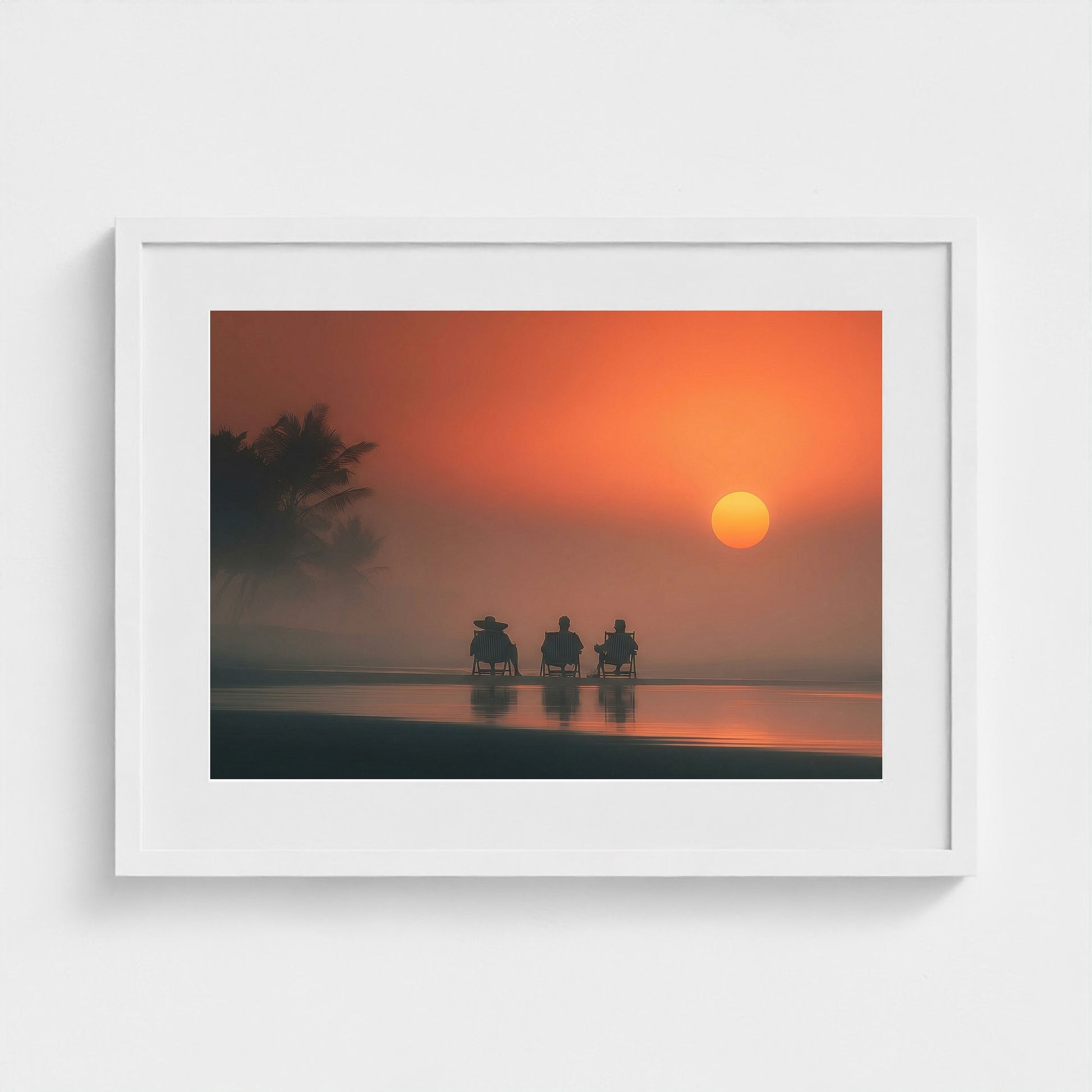 Three figures sit in quiet formation on a sun-washed shore, their backs to the viewer, absorbed in the last warmth of a hazy day. Palm silhouettes drift at the edge of the frame, and wet sand mirrors the sky in a long, unbroken reflection. The composition is symmetrical, meditative — a moment of collective stillness made monumental.