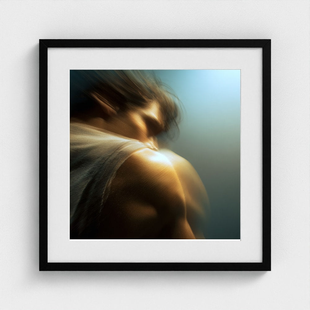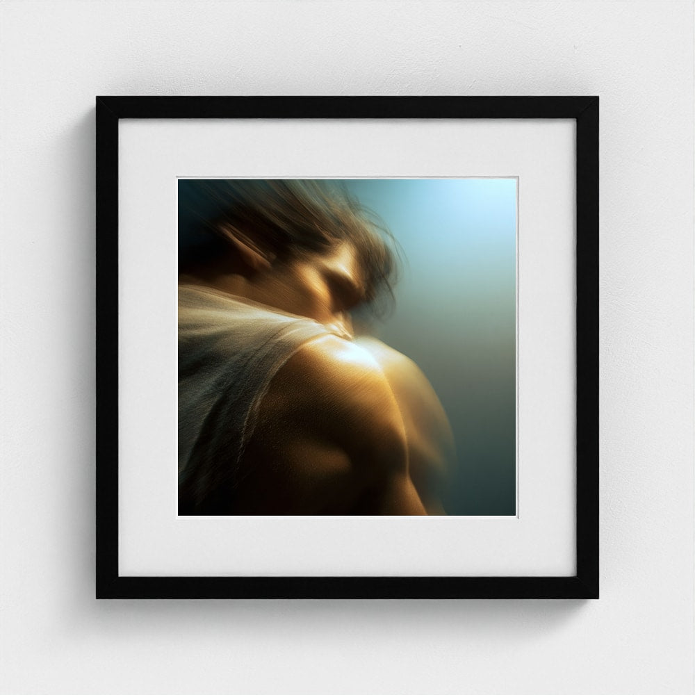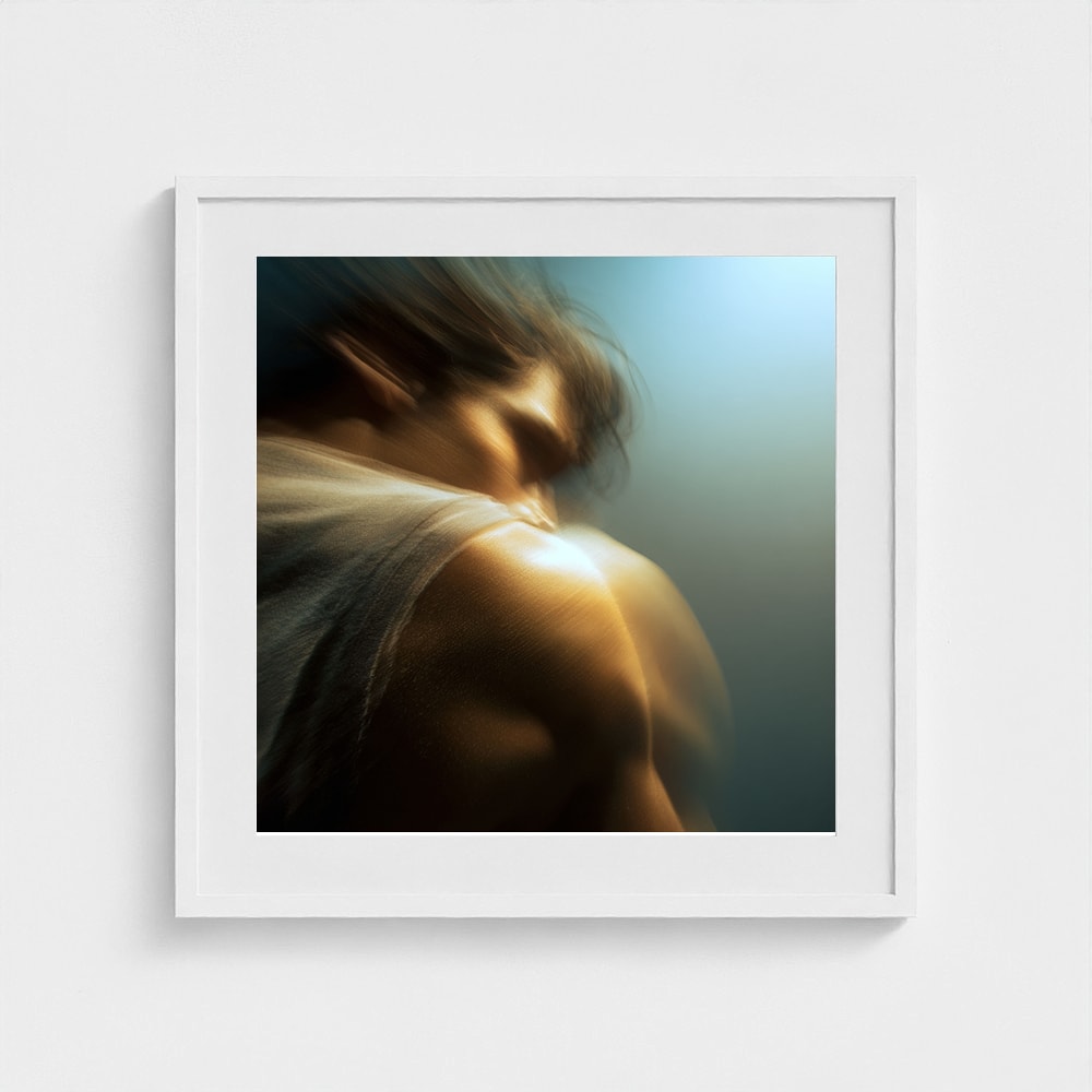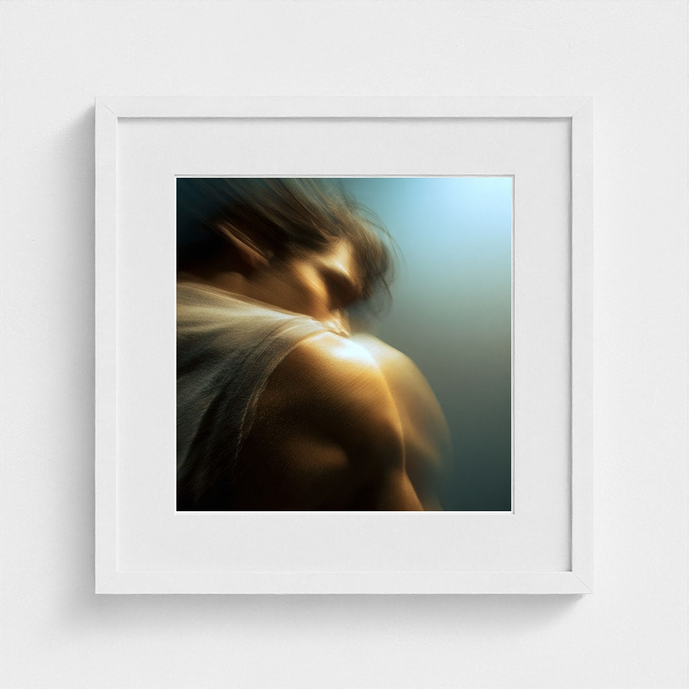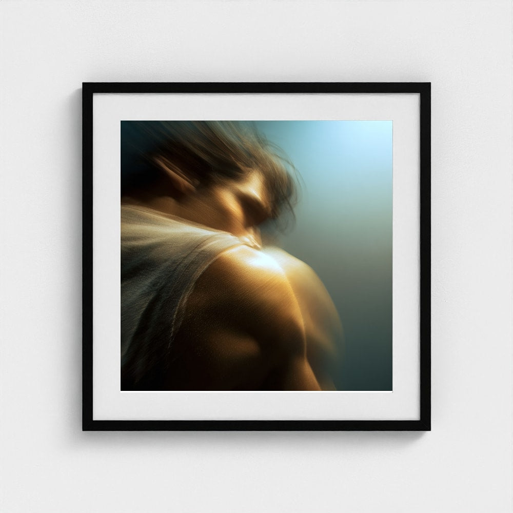 A male figure in motion, the work captures his form partially dissolved by blur and softened light. The image feels suspended between stillness and movement, presence and disappearance. Warm highlights trace shoulder and neck while the face drifts into abstraction, creating a dreamlike atmosphere that feels inward and emotional rather than performative. The work invites prolonged looking, rewarding quiet attention over immediate clarity.