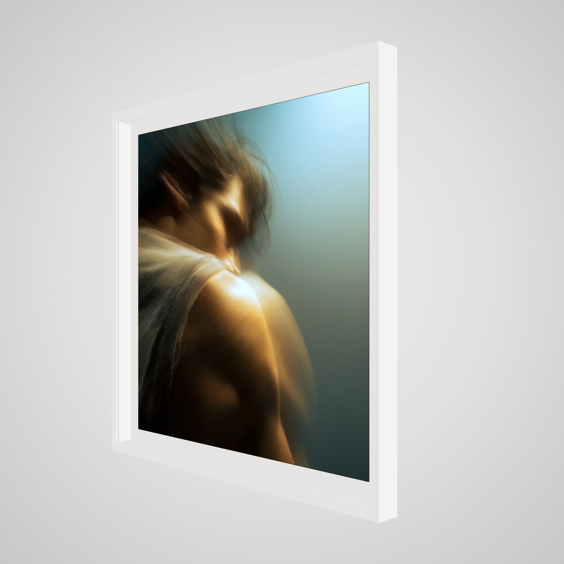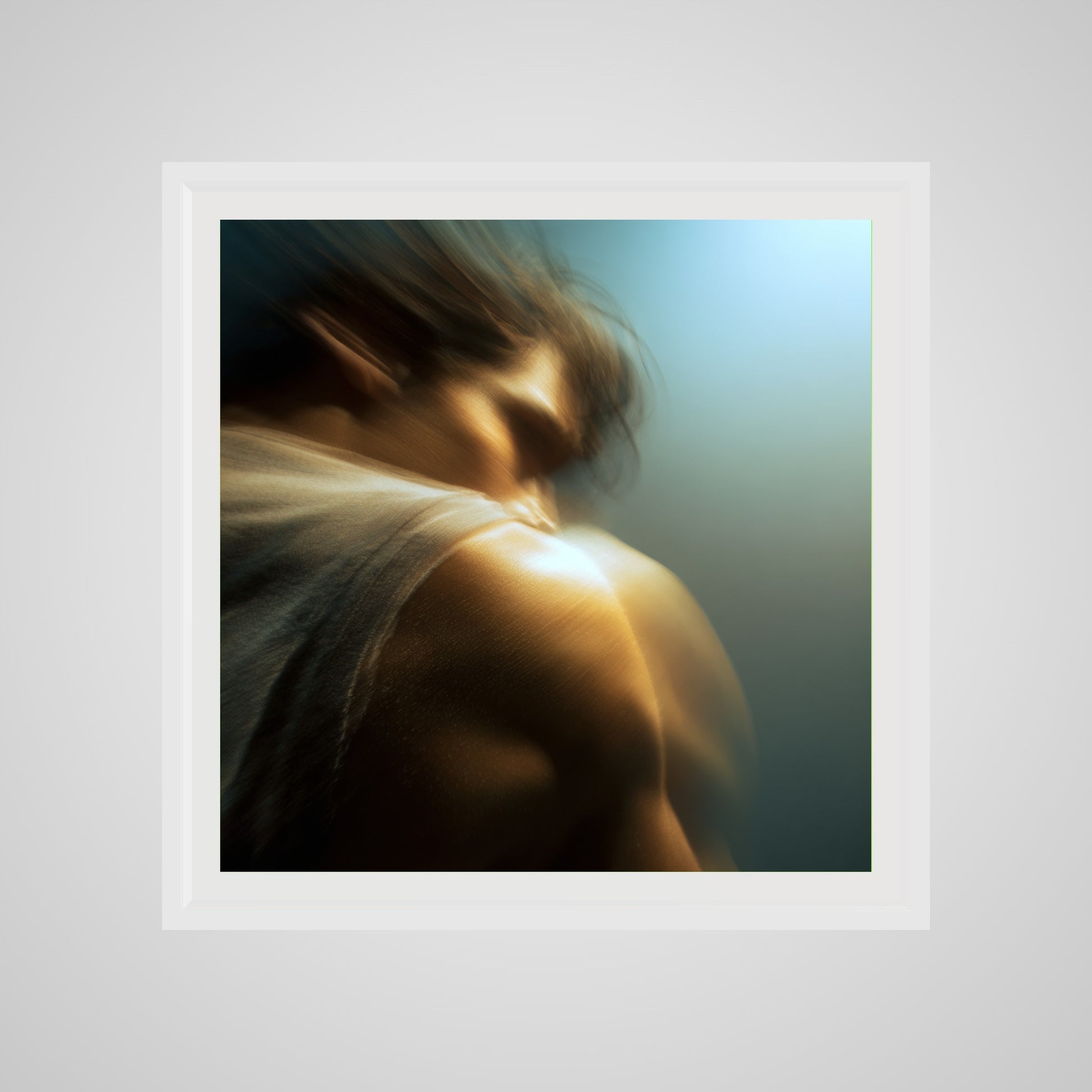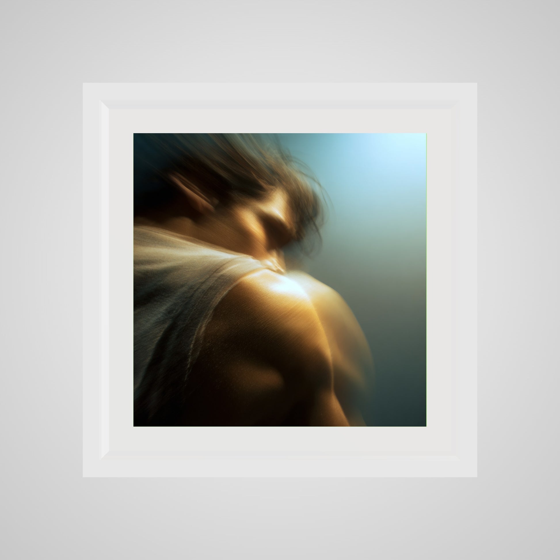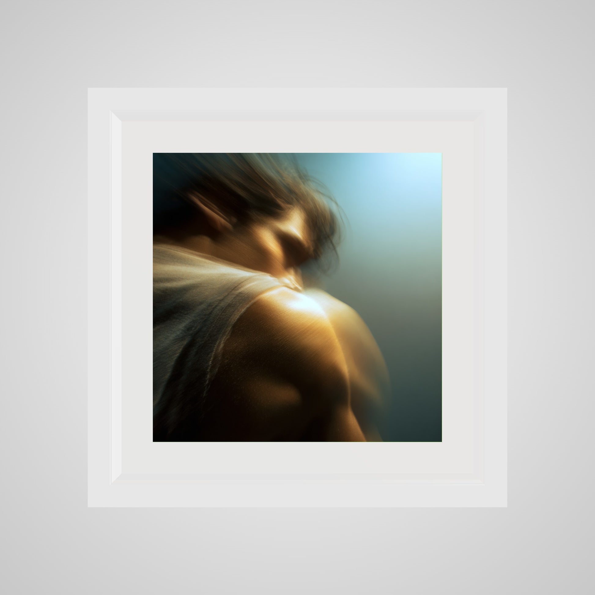 A male figure in motion, the work captures his form partially dissolved by blur and softened light. The image feels suspended between stillness and movement, presence and disappearance. Warm highlights trace shoulder and neck while the face drifts into abstraction, creating a dreamlike atmosphere that feels inward and emotional rather than performative. The work invites prolonged looking, rewarding quiet attention over immediate clarity.