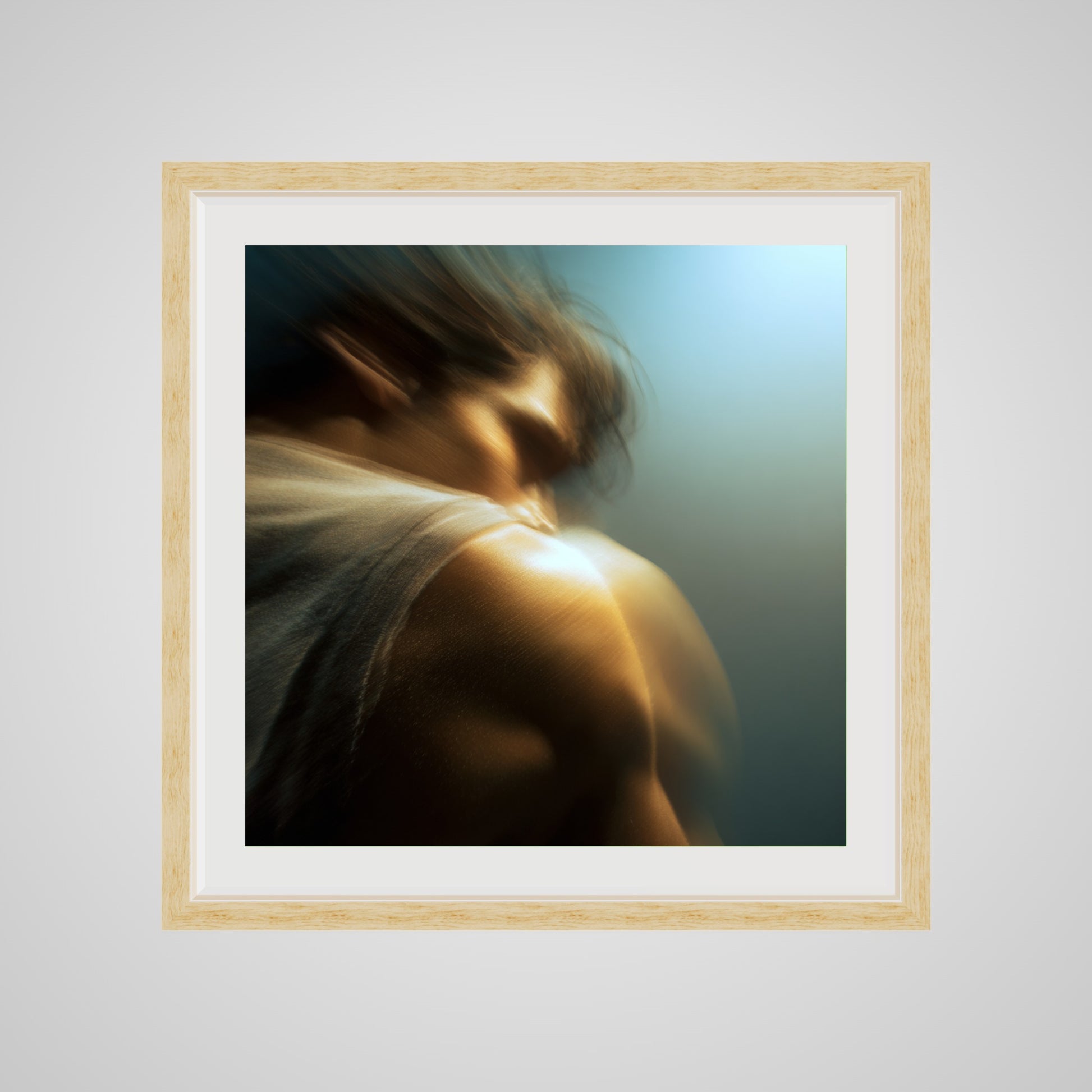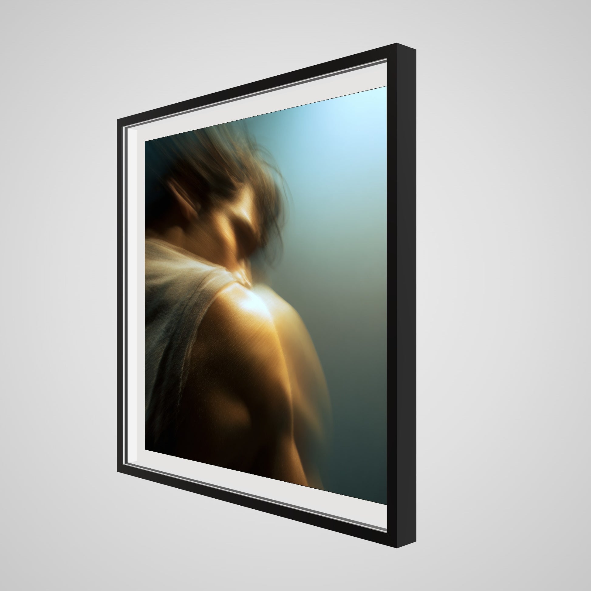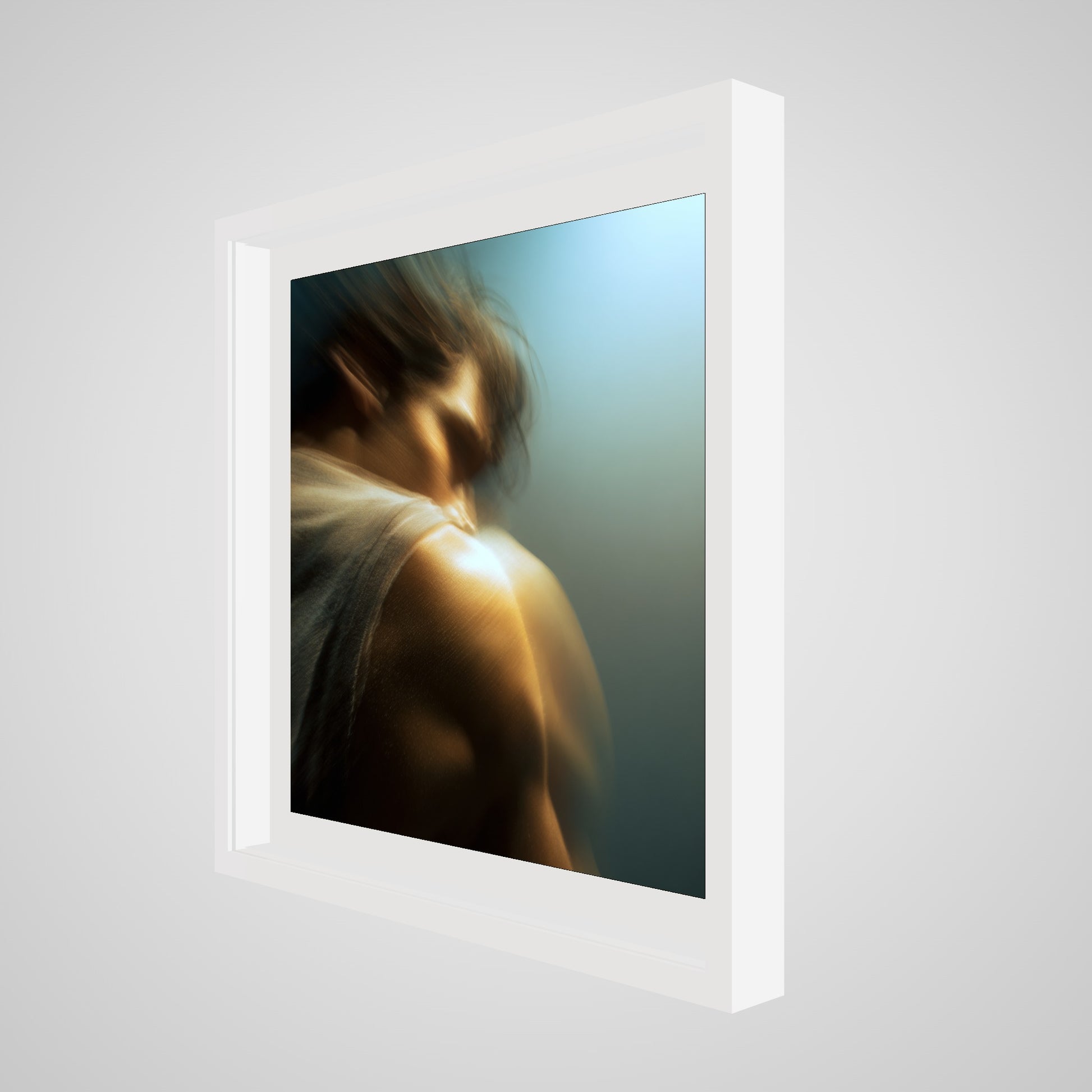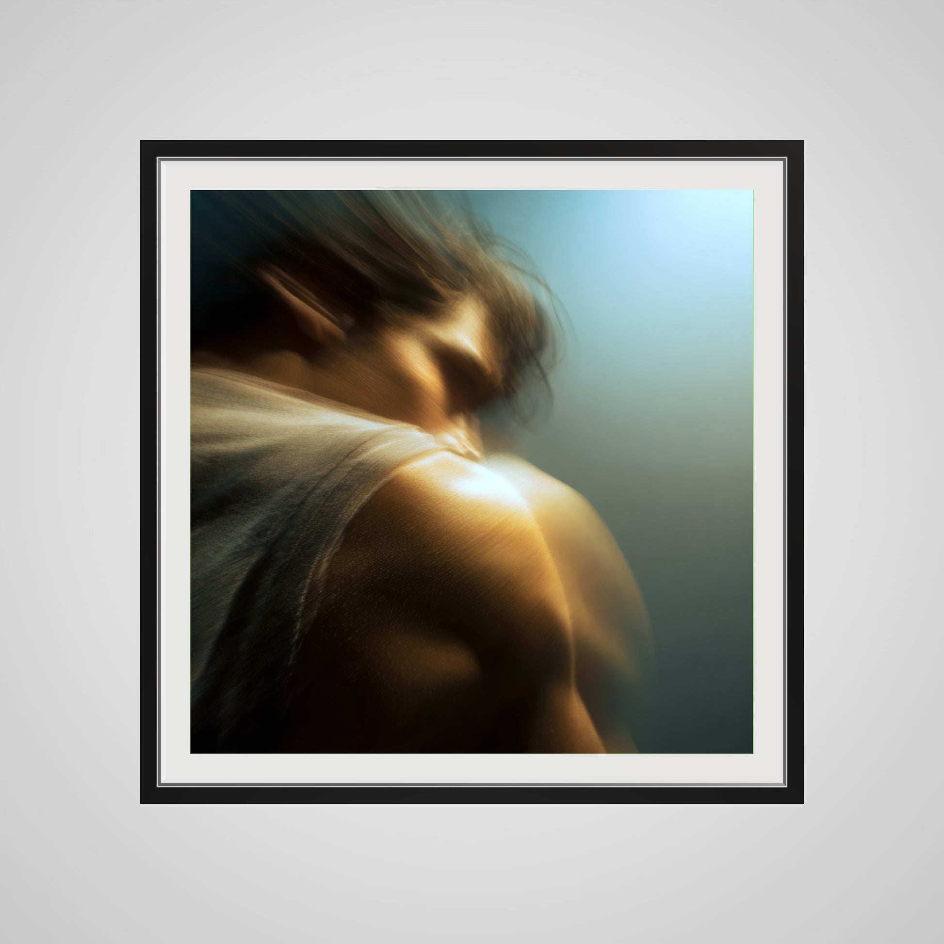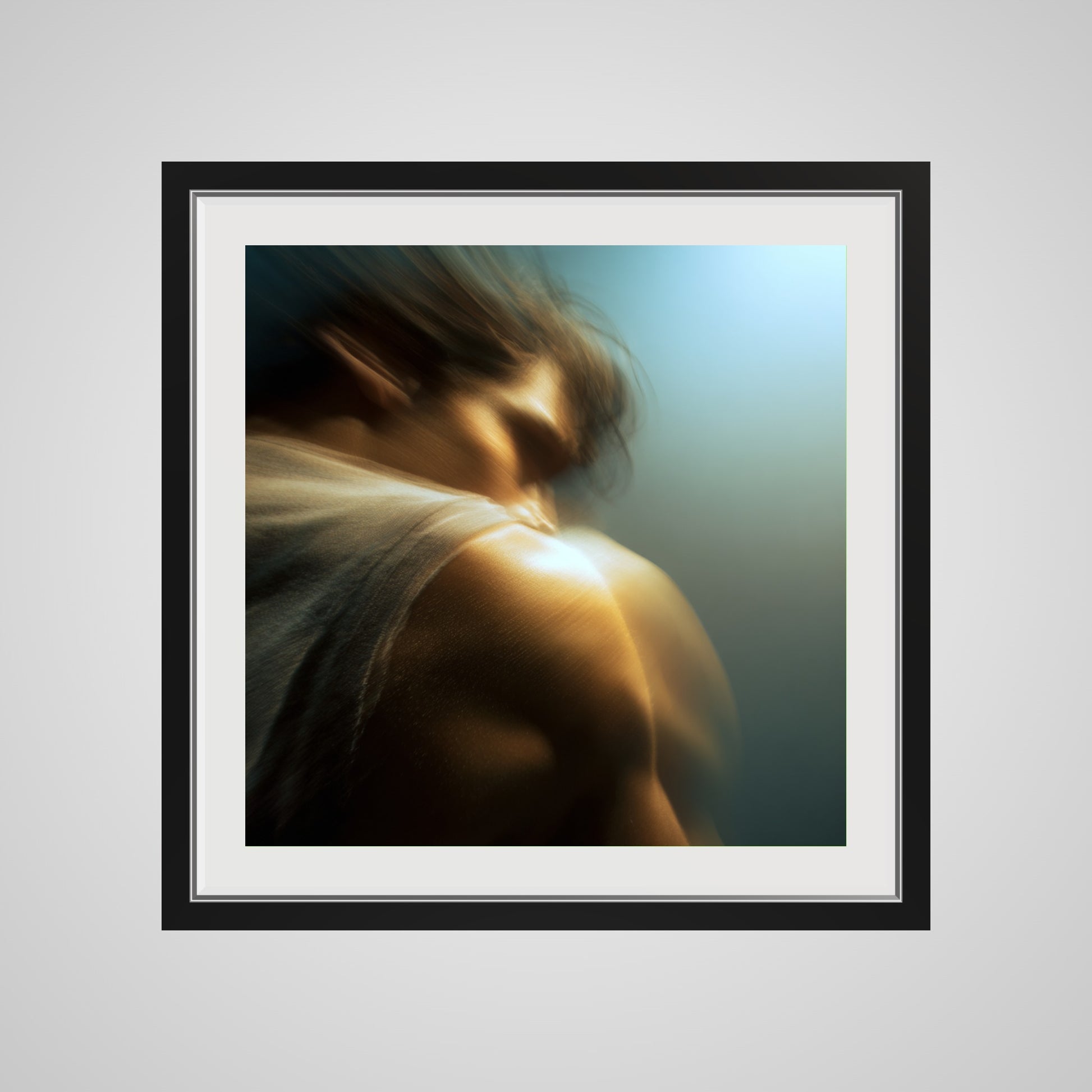 A male figure in motion, the work captures his form partially dissolved by blur and softened light. The image feels suspended between stillness and movement, presence and disappearance. Warm highlights trace shoulder and neck while the face drifts into abstraction, creating a dreamlike atmosphere that feels inward and emotional rather than performative. The work invites prolonged looking, rewarding quiet attention over immediate clarity.