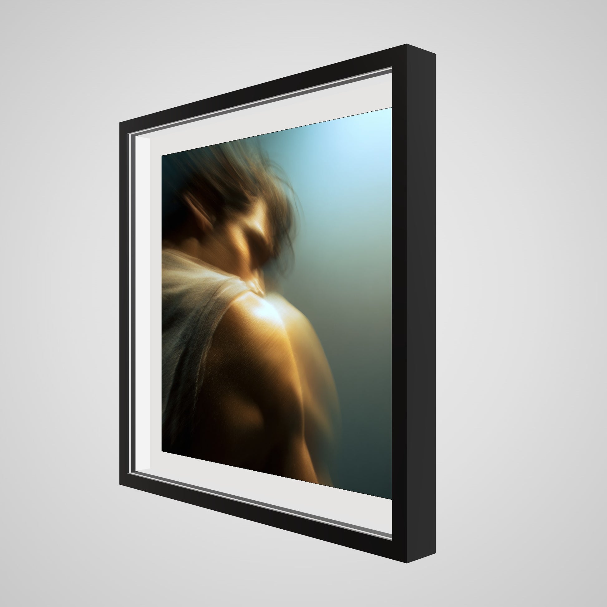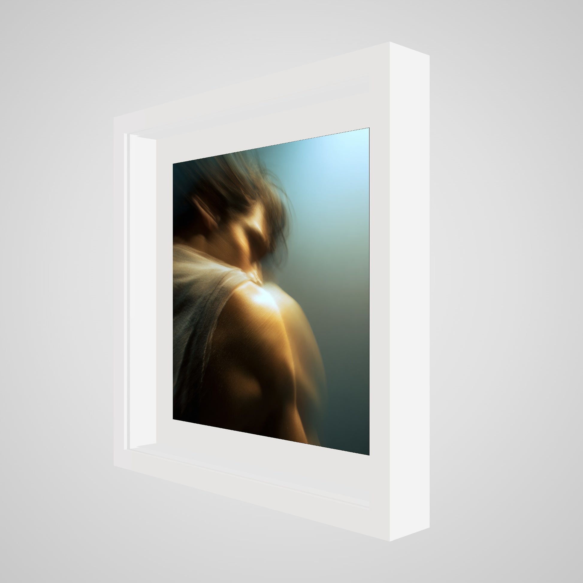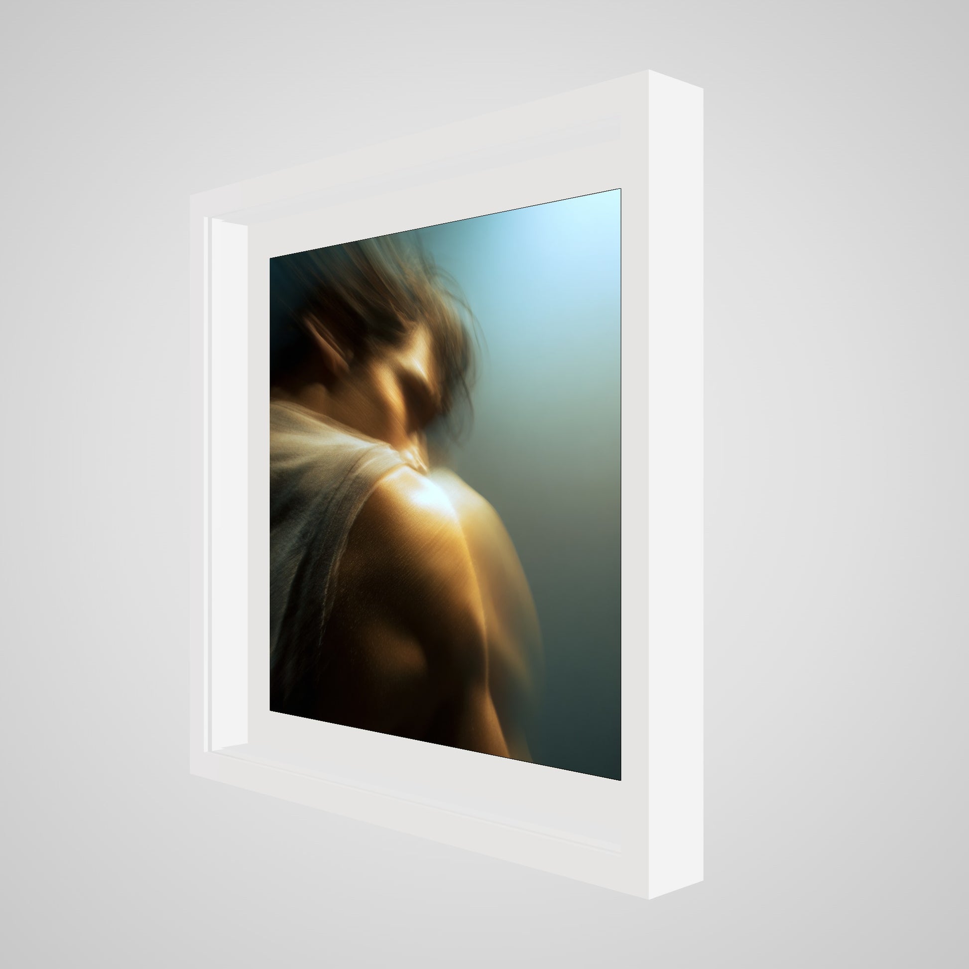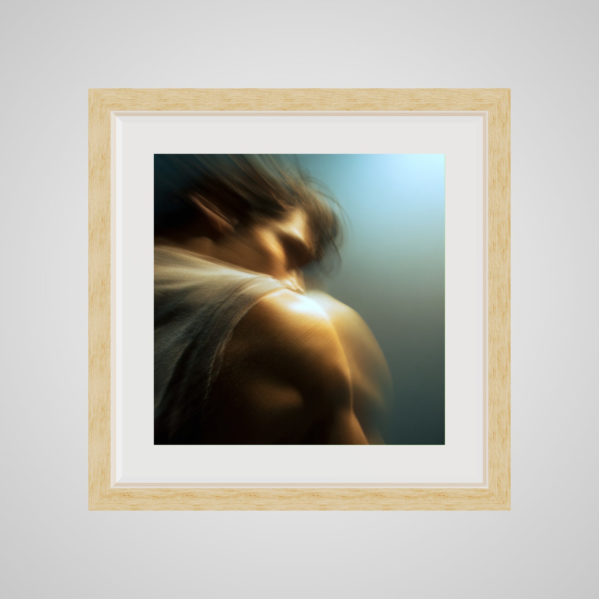 A male figure in motion, the work captures his form partially dissolved by blur and softened light. The image feels suspended between stillness and movement, presence and disappearance. Warm highlights trace shoulder and neck while the face drifts into abstraction, creating a dreamlike atmosphere that feels inward and emotional rather than performative. The work invites prolonged looking, rewarding quiet attention over immediate clarity.