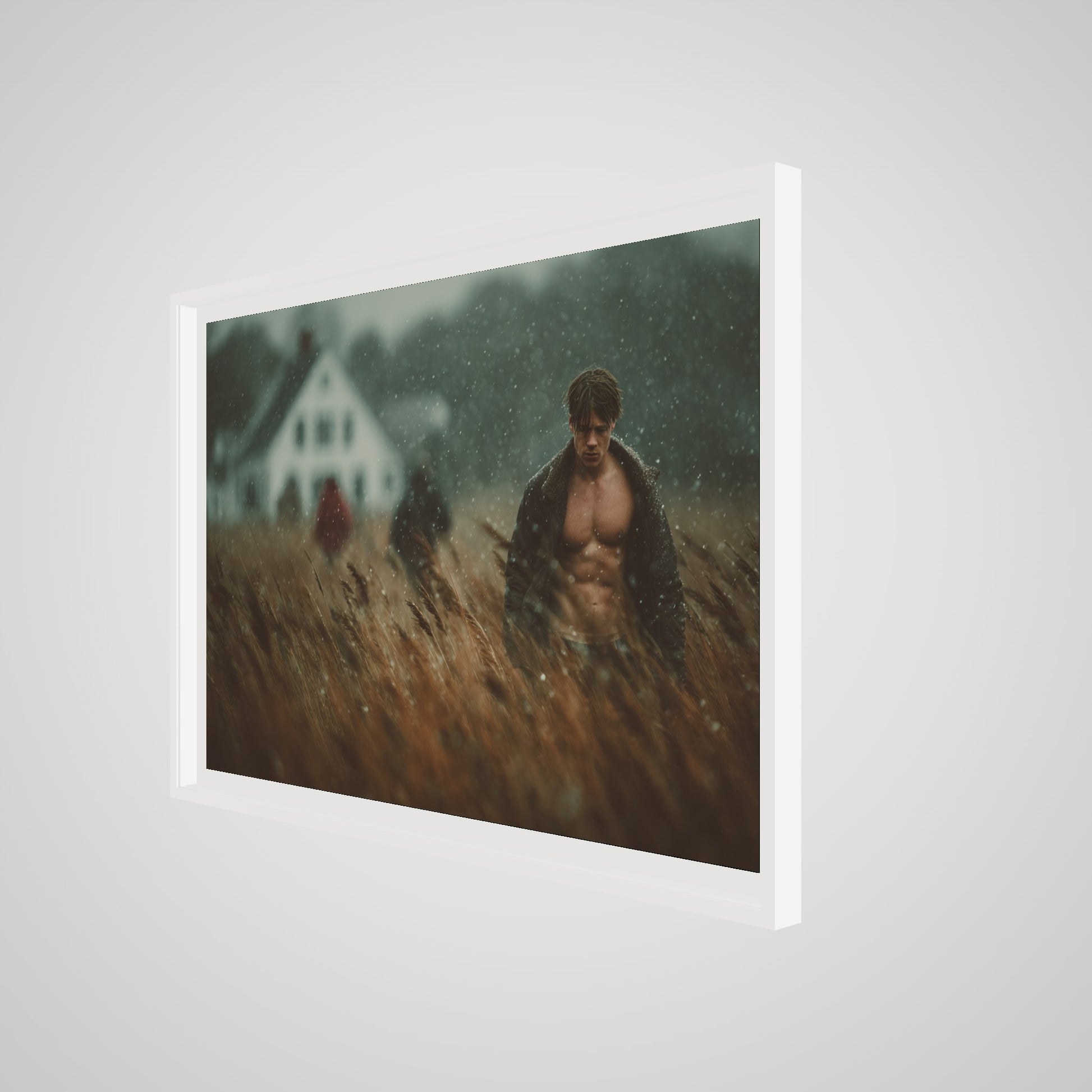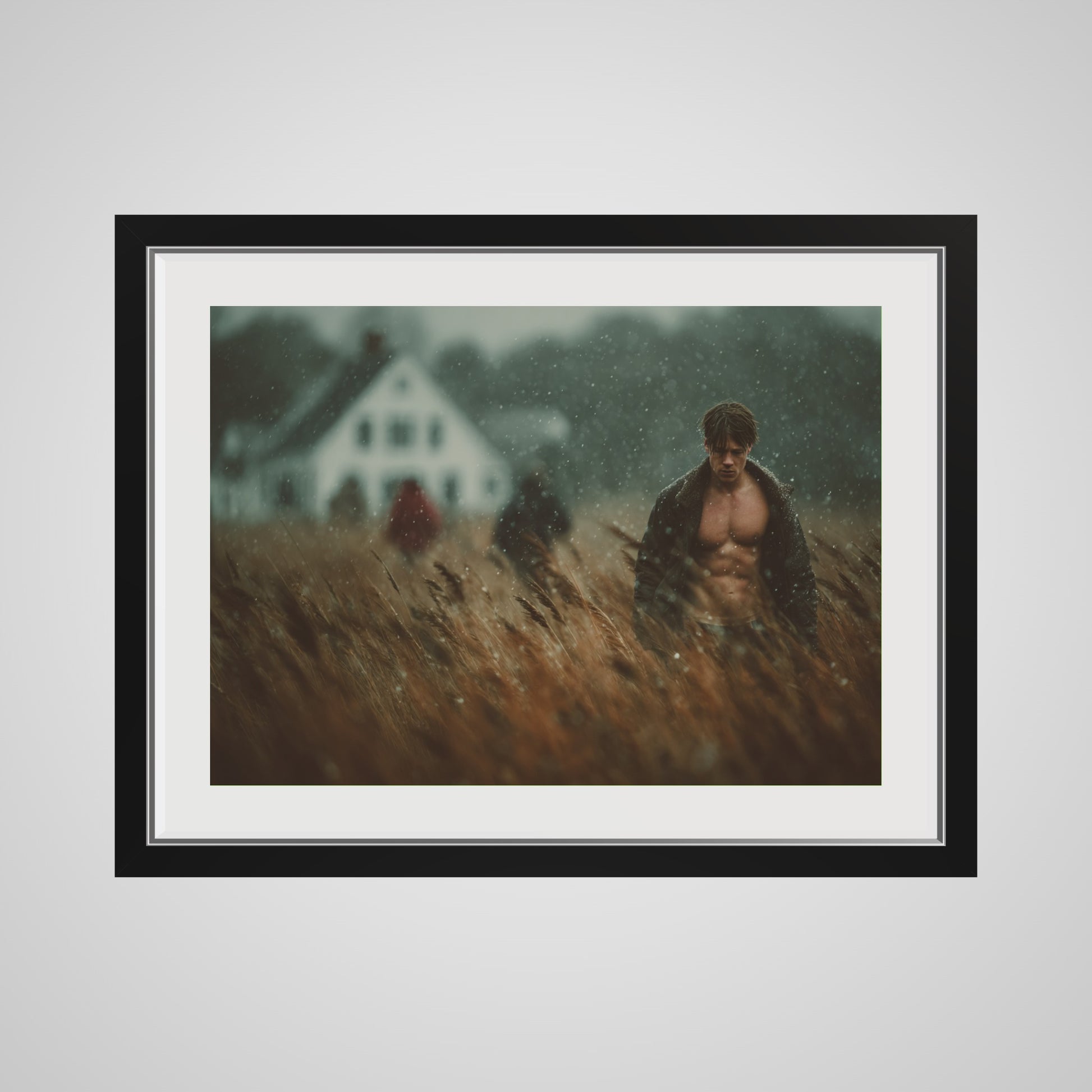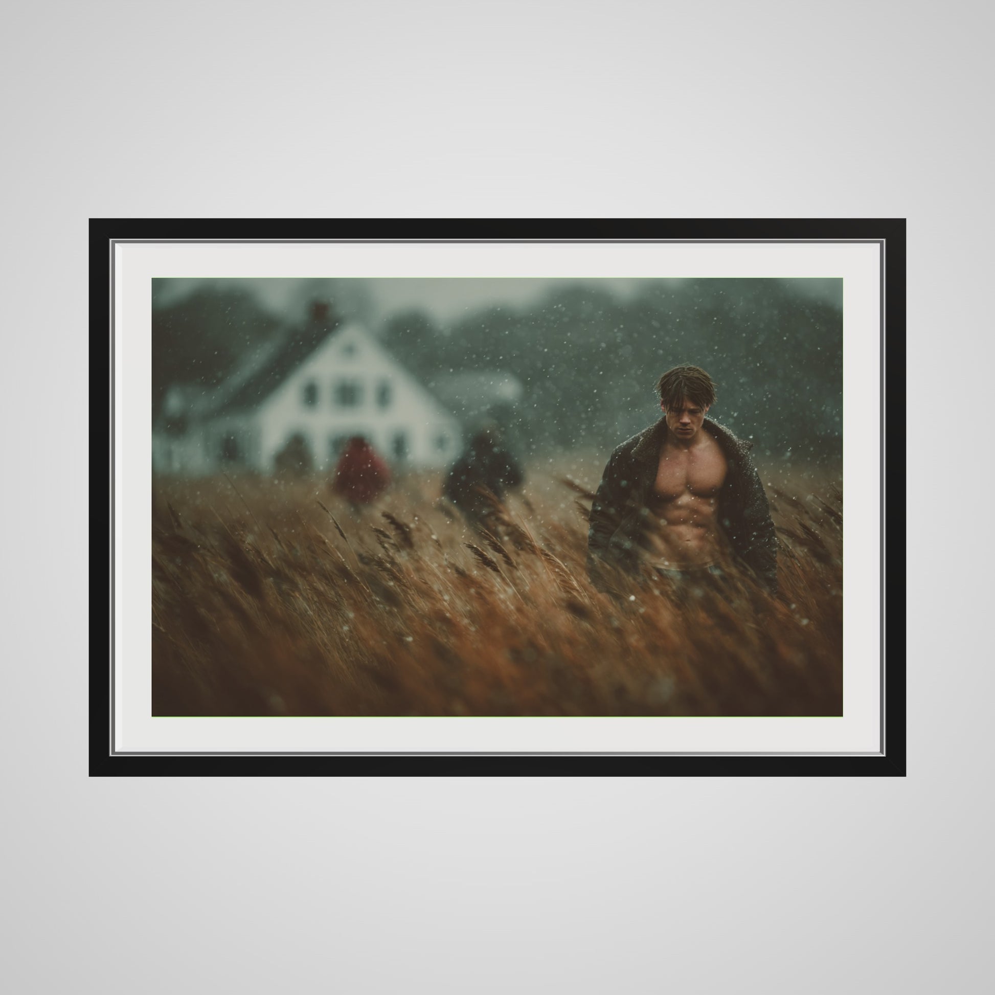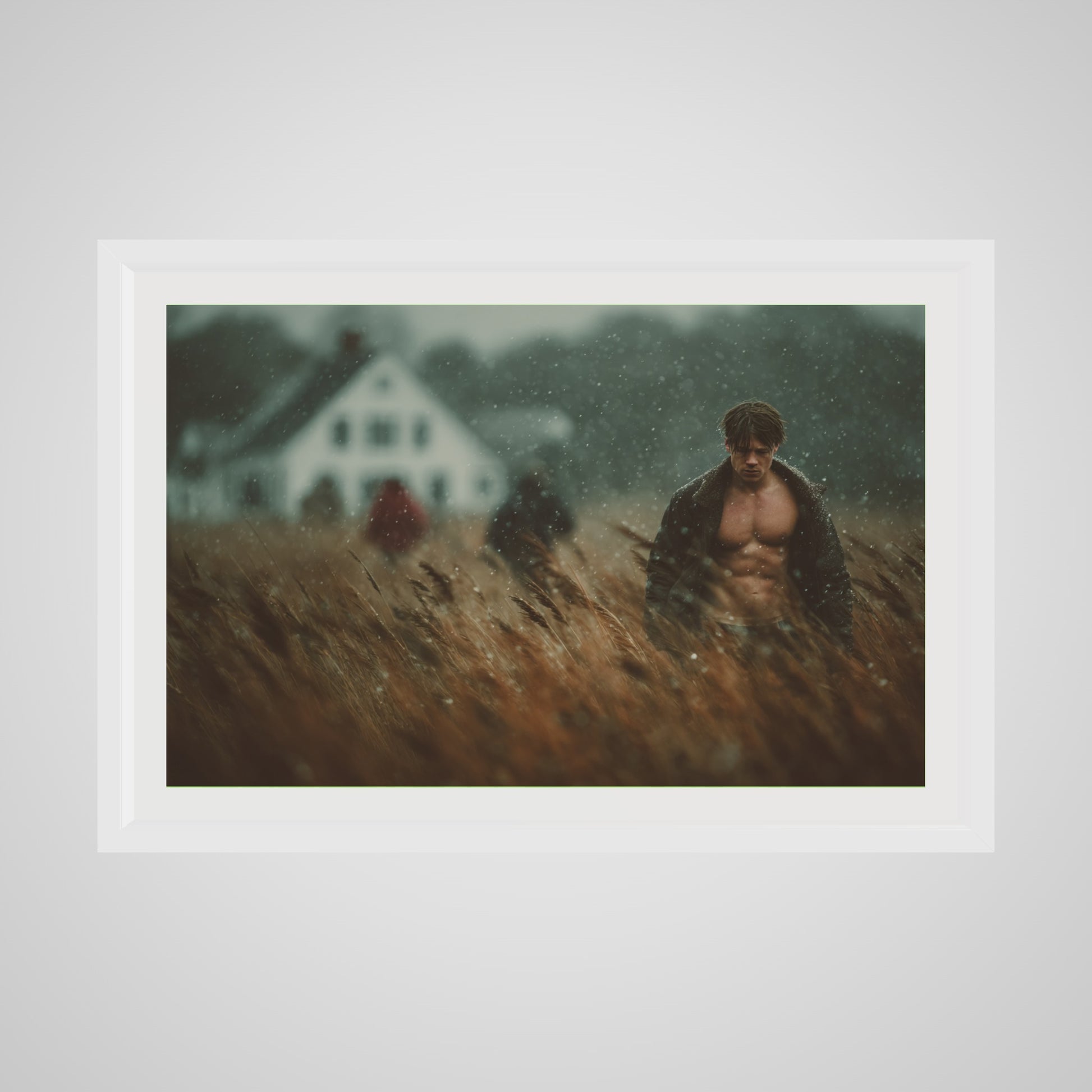 This portrait captures a muscular man walking in a windswept field as a light rain drifts across the scene. The muted palette of brown, grey, and soft white lends the image a grounded, cinematic stillness. A blurred farmhouse and two distant figures introduce a subtle tension, creating an atmospheric rural tableau that feels both intimate and expansive. The result is a quietly dramatic portrait that anchors a room with tone, texture, and mood.