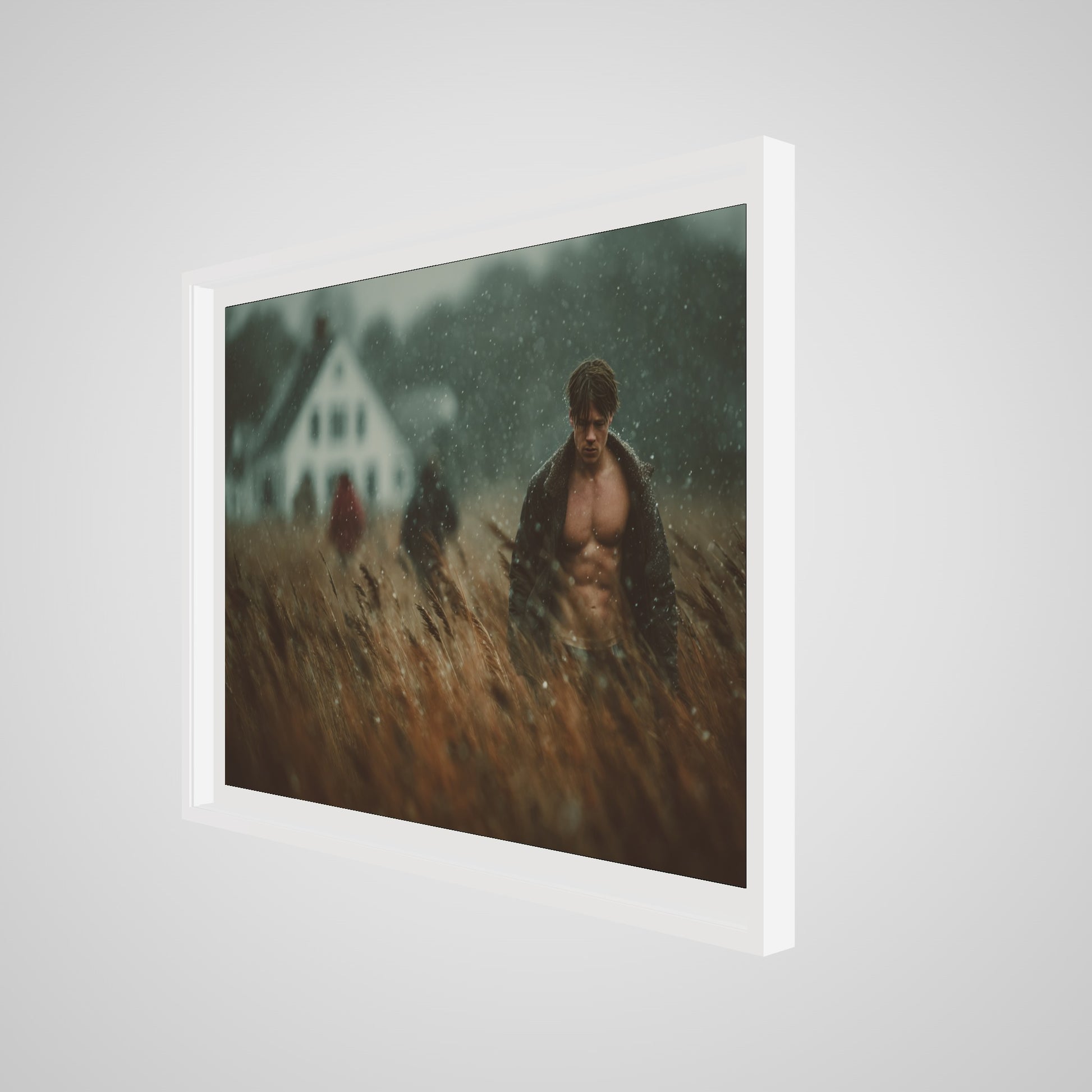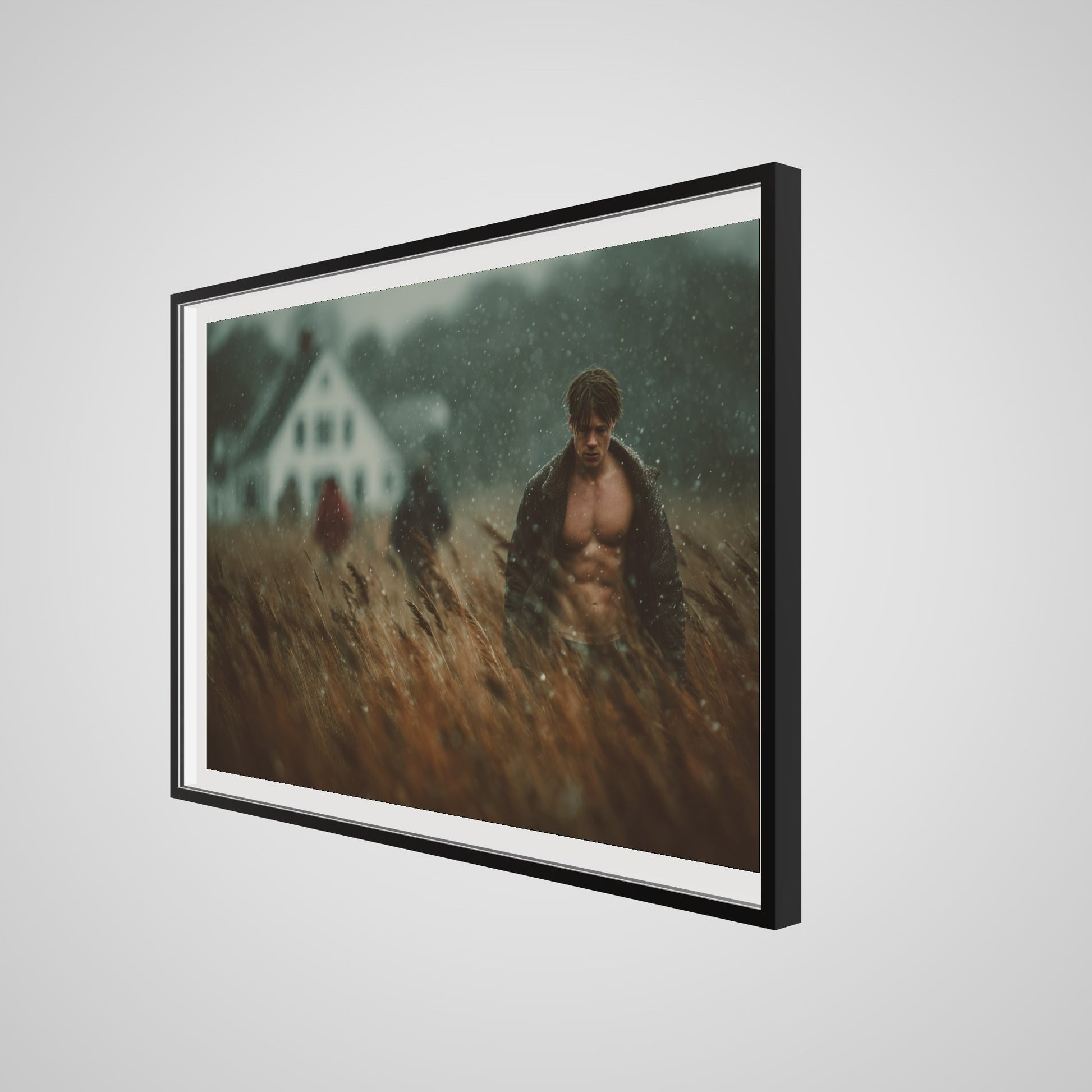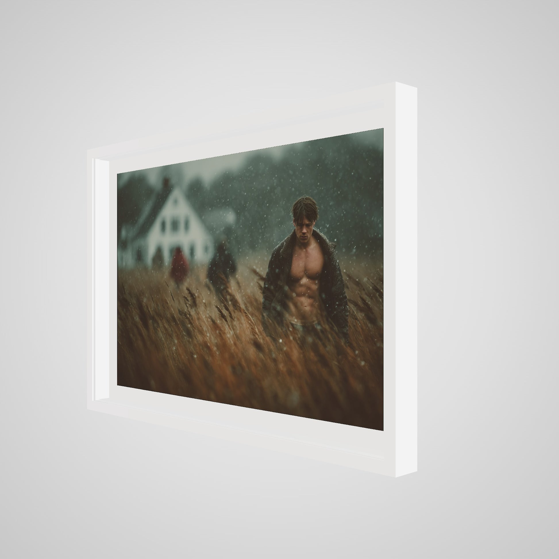 This portrait captures a muscular man walking in a windswept field as a light rain drifts across the scene. The muted palette of brown, grey, and soft white lends the image a grounded, cinematic stillness. A blurred farmhouse and two distant figures introduce a subtle tension, creating an atmospheric rural tableau that feels both intimate and expansive. The result is a quietly dramatic portrait that anchors a room with tone, texture, and mood.