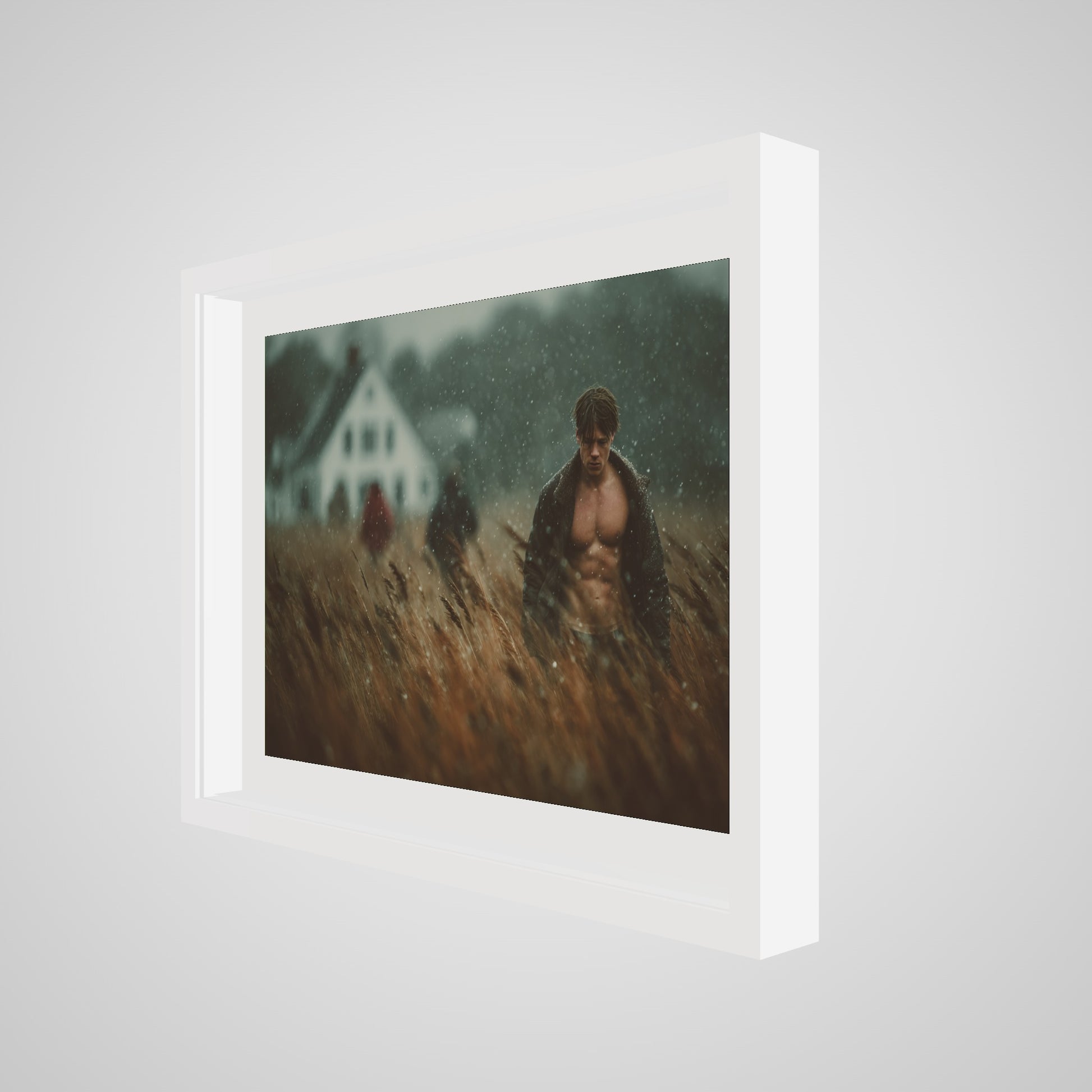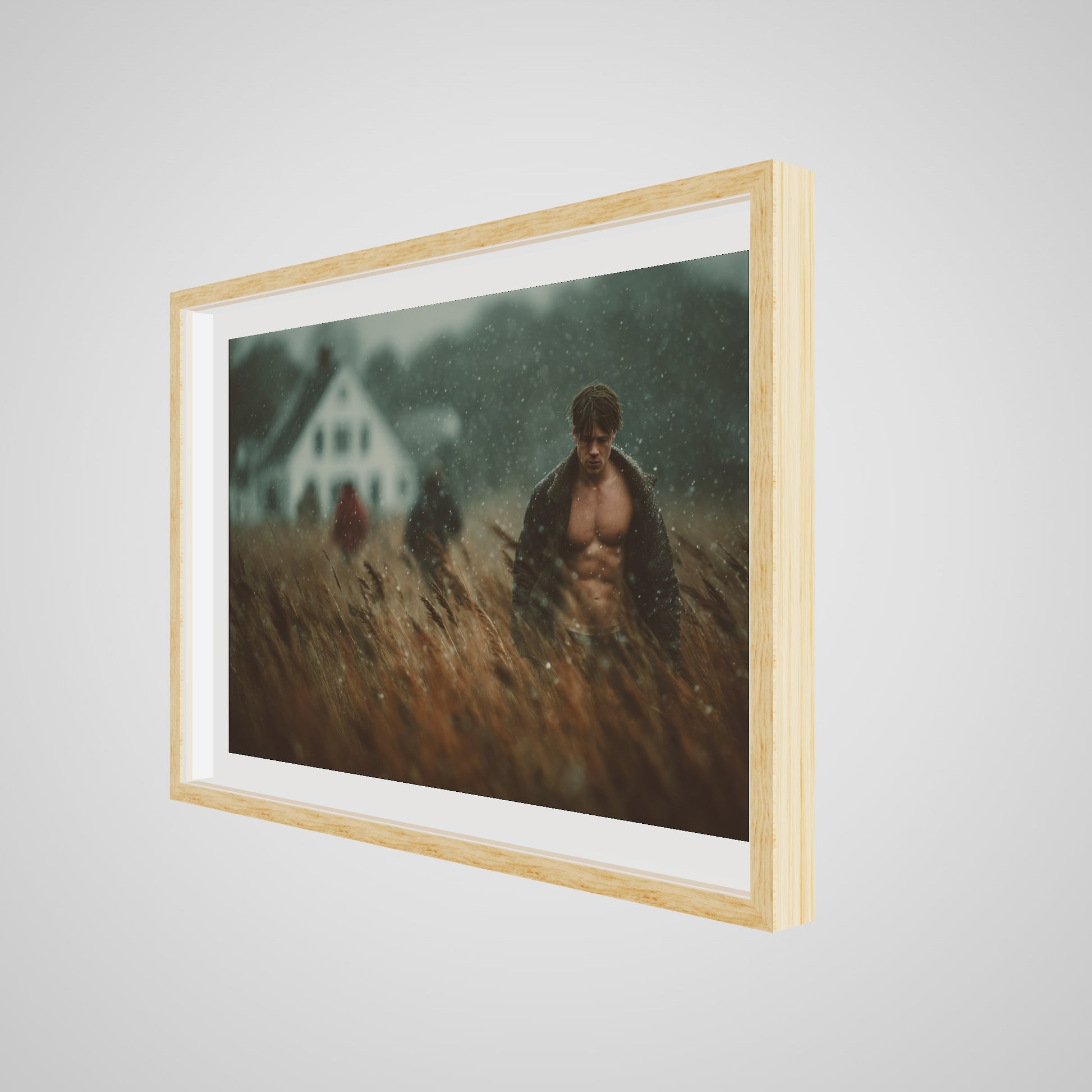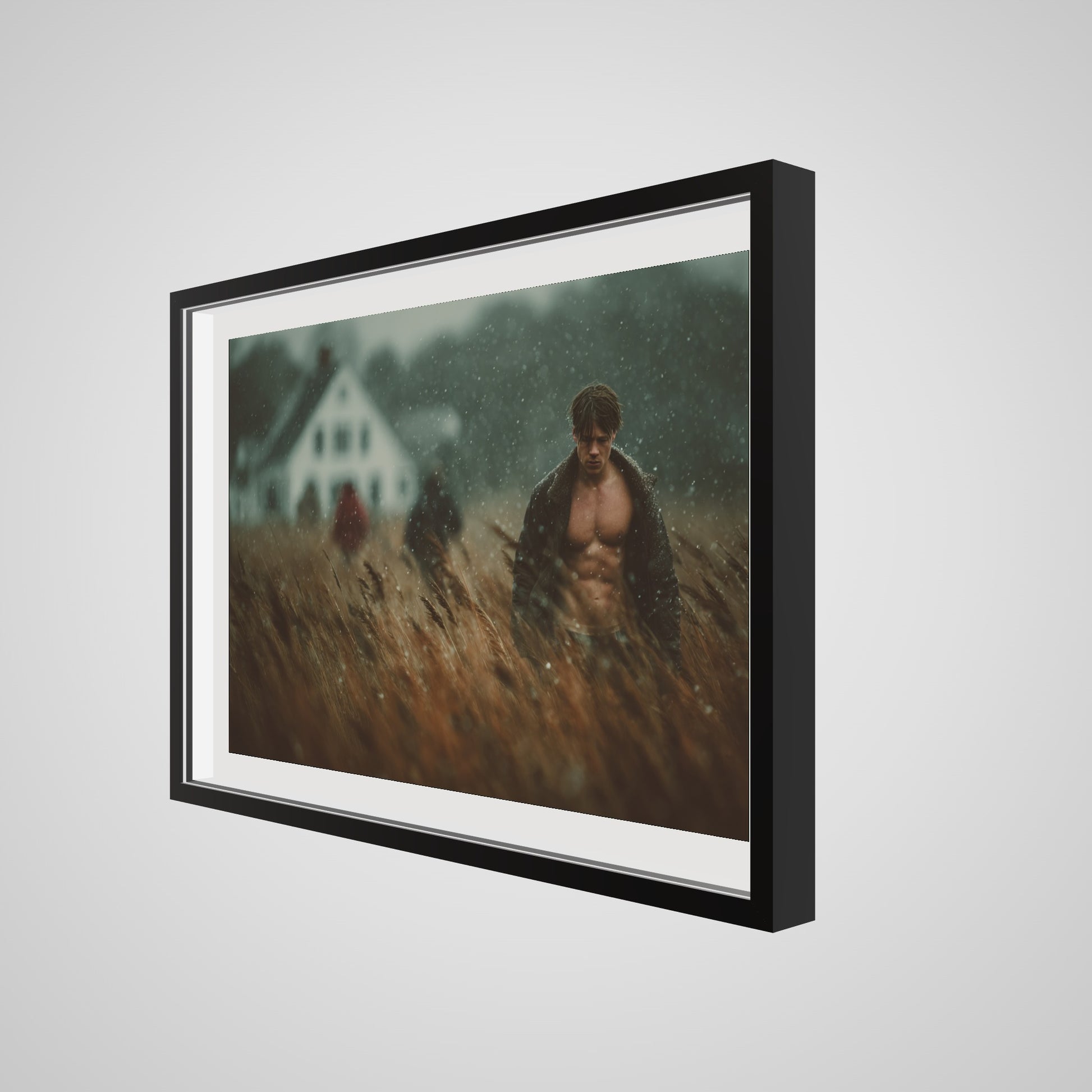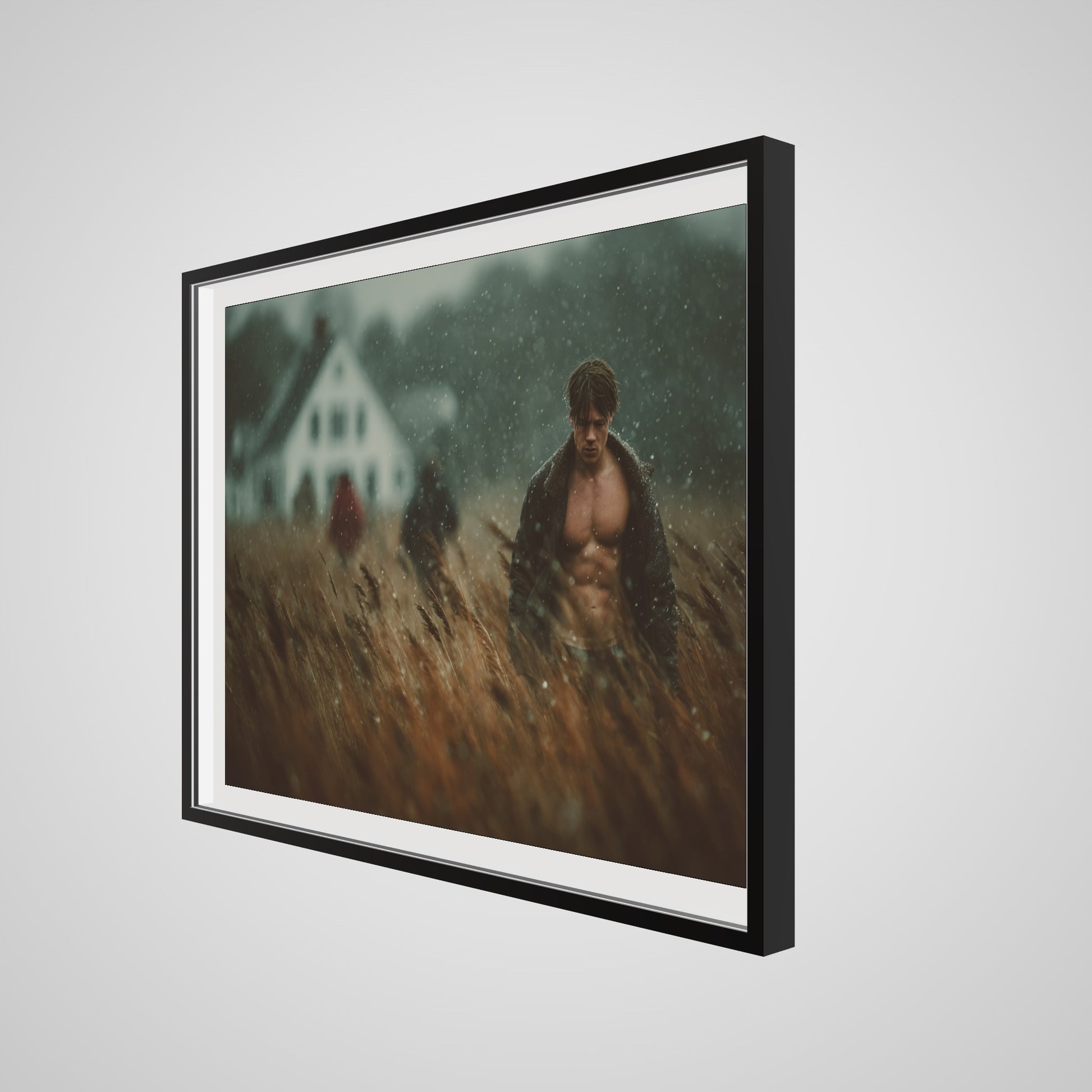 This portrait captures a muscular man walking in a windswept field as a light rain drifts across the scene. The muted palette of brown, grey, and soft white lends the image a grounded, cinematic stillness. A blurred farmhouse and two distant figures introduce a subtle tension, creating an atmospheric rural tableau that feels both intimate and expansive. The result is a quietly dramatic portrait that anchors a room with tone, texture, and mood.