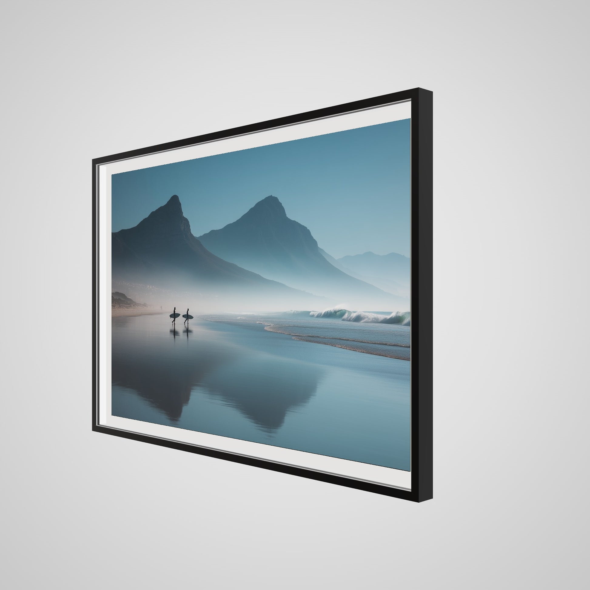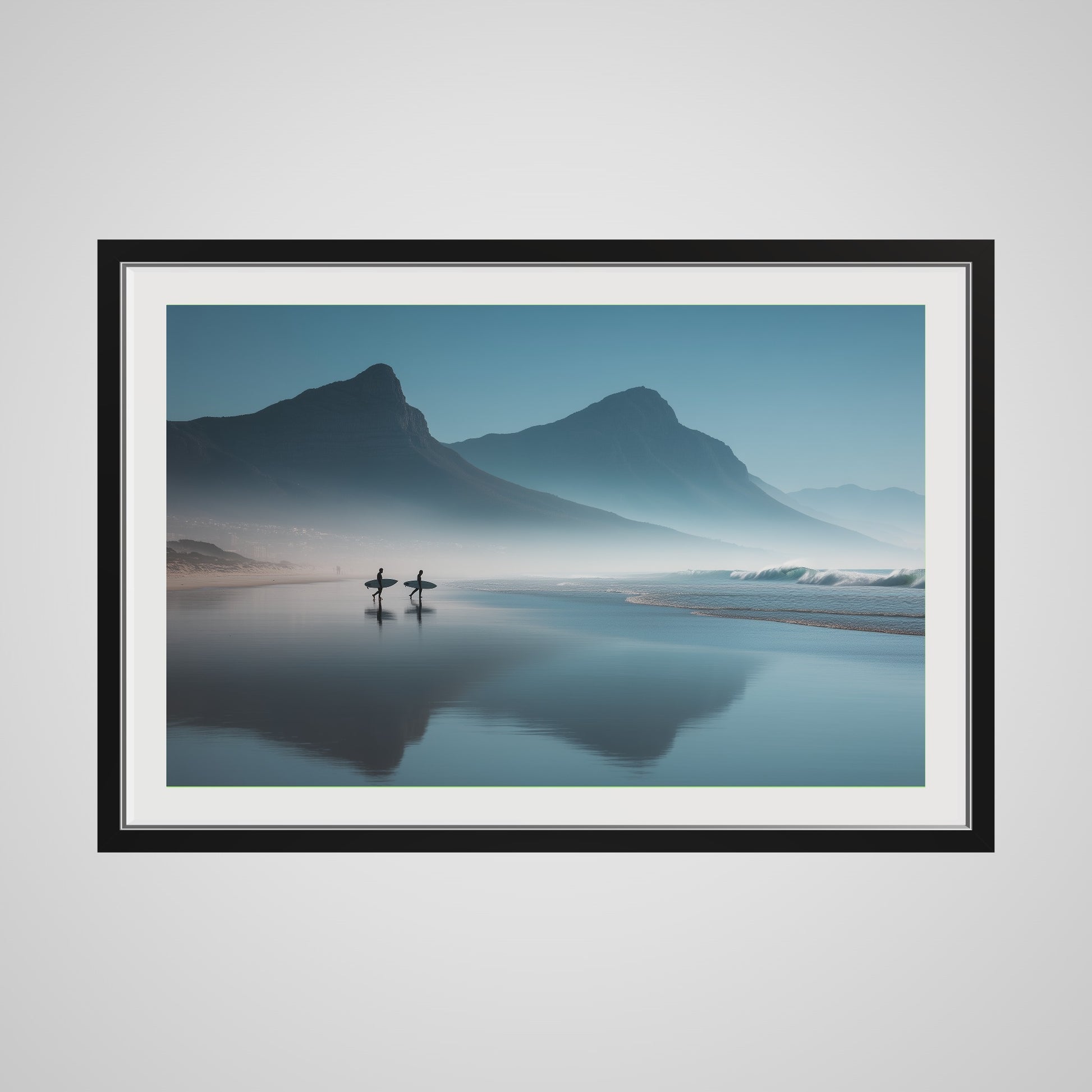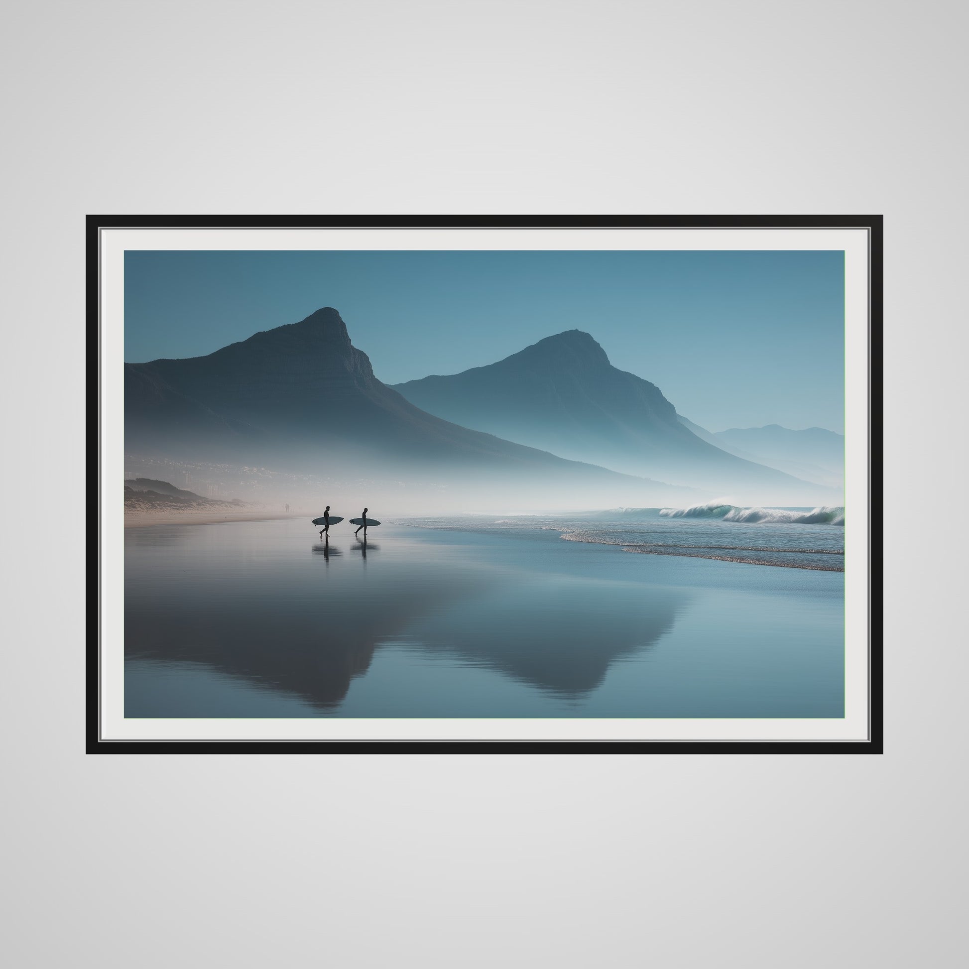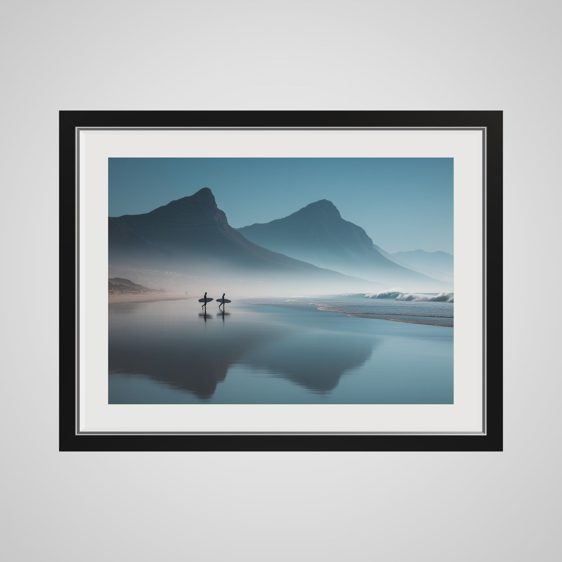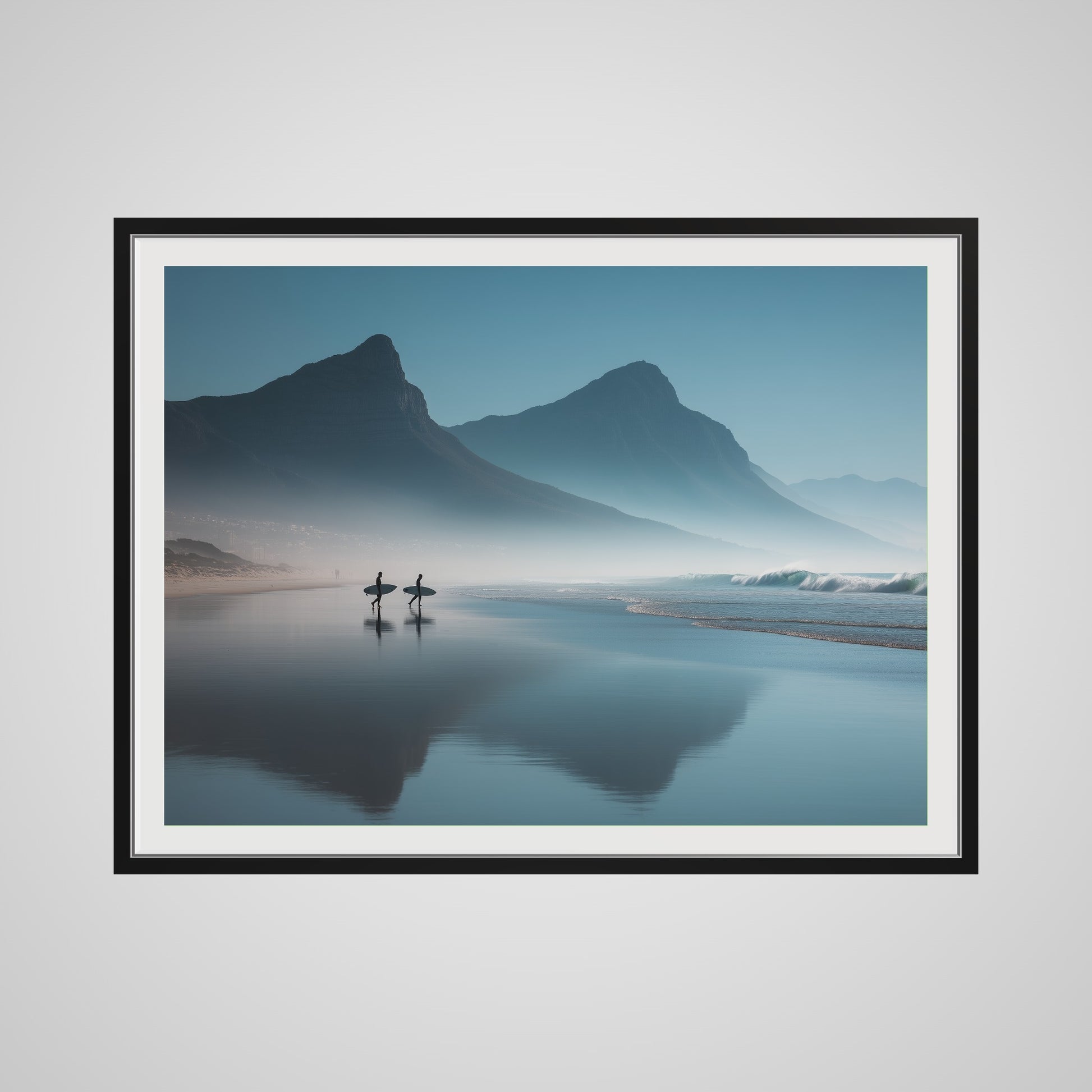 A serene dawn envelops the Table Mountain shoreline, where two silhouettes stand poised against the vastness of the ocean. The gentle mist and soft hues of morning light create a tranquil yet invigorating scene, capturing the quiet anticipation of the day's first surf.