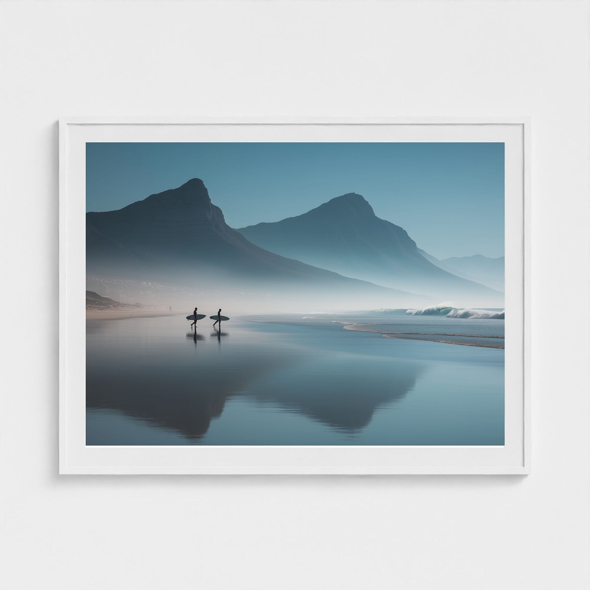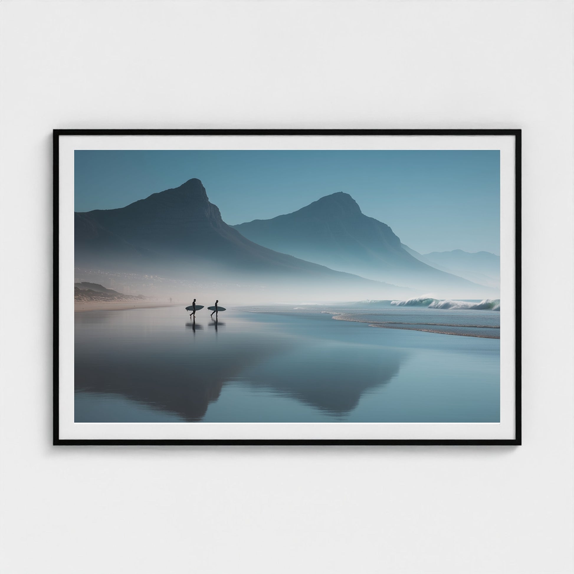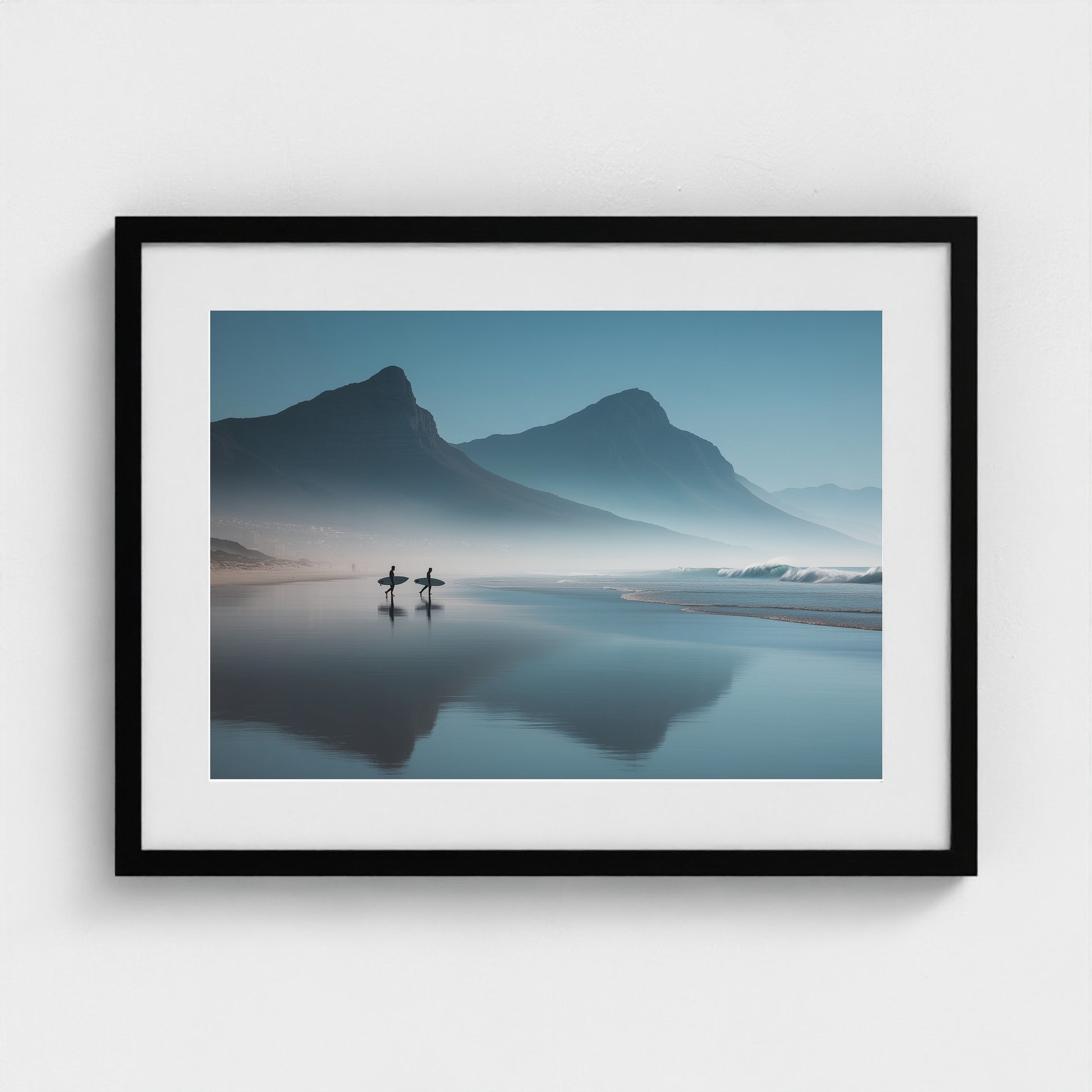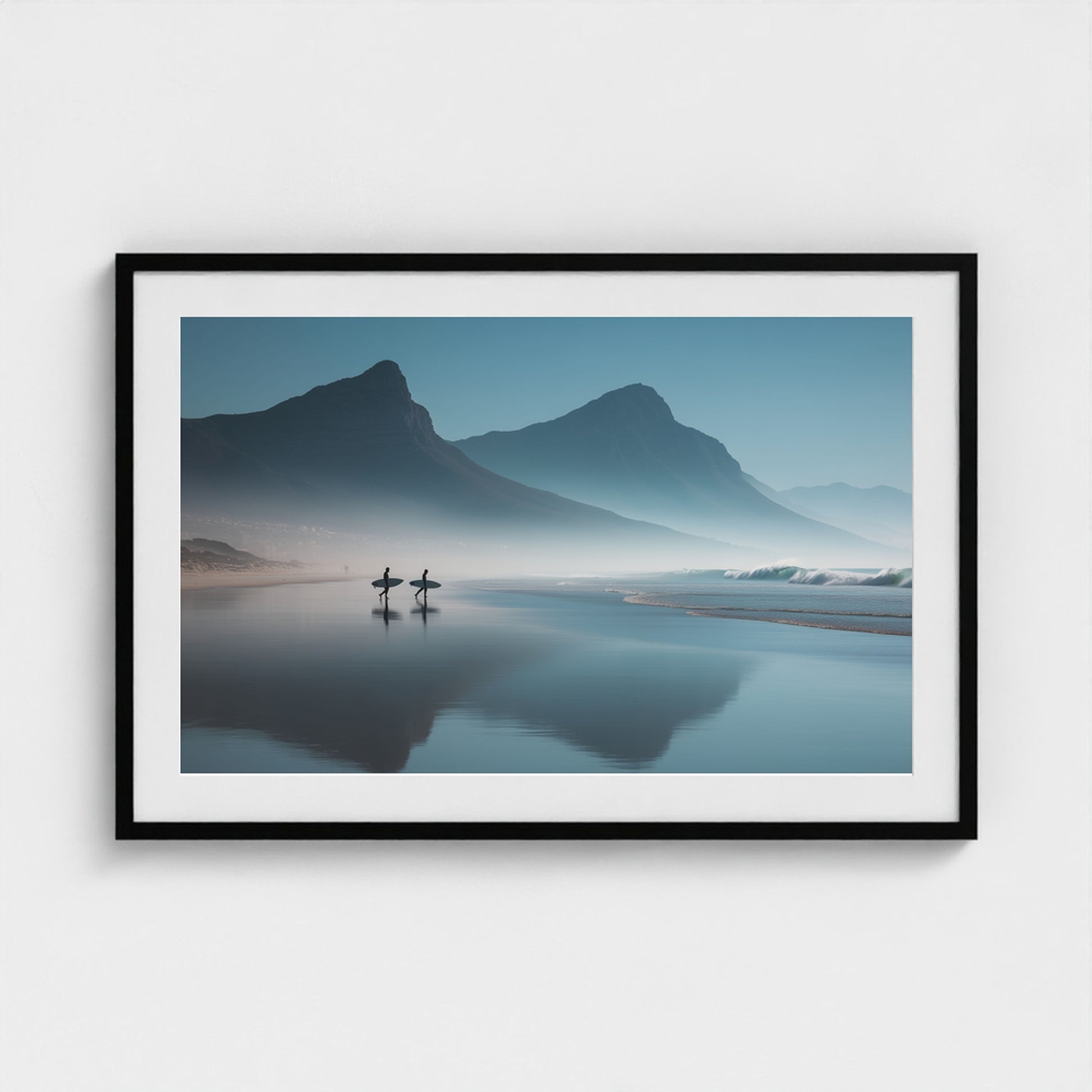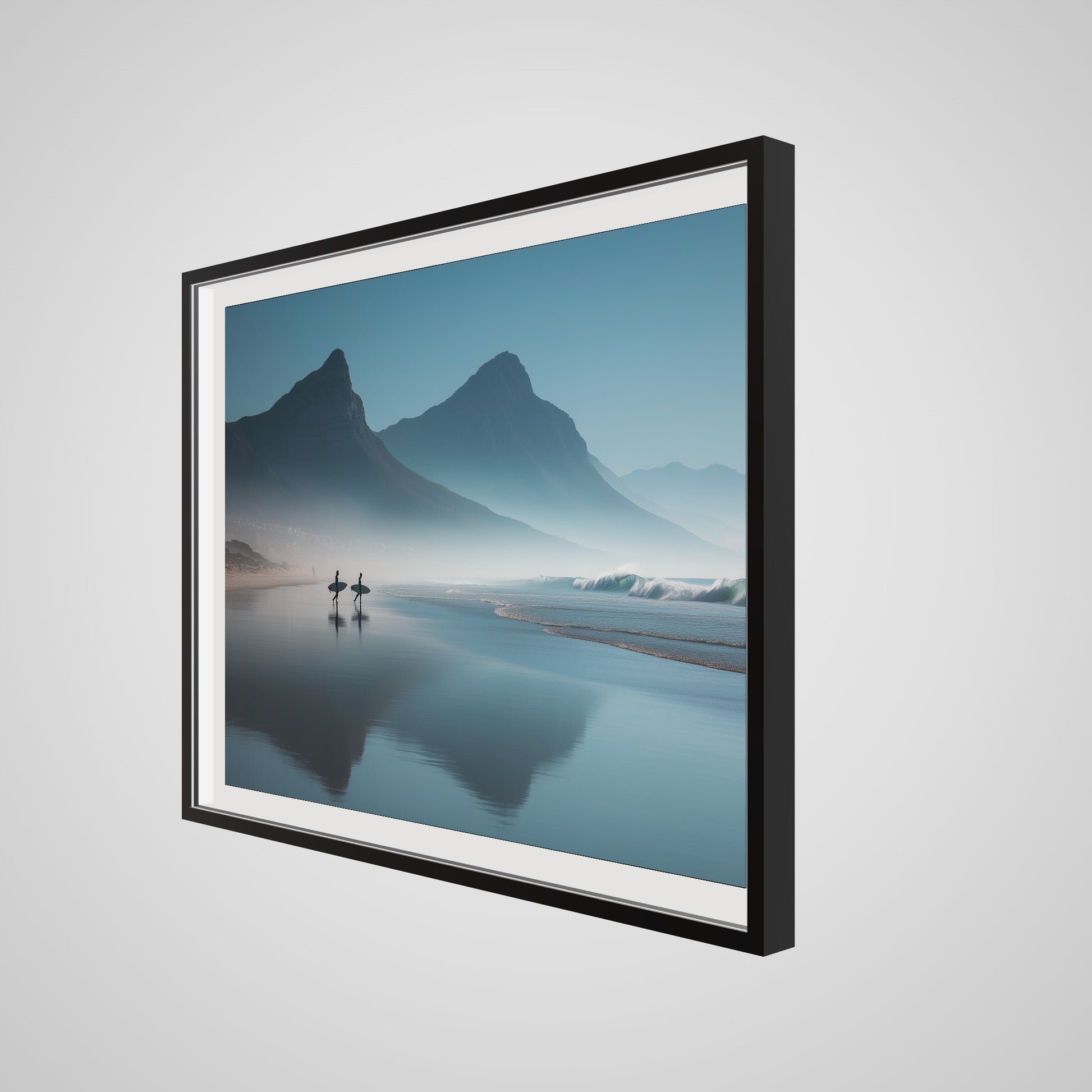 A serene dawn envelops the Table Mountain shoreline, where two silhouettes stand poised against the vastness of the ocean. The gentle mist and soft hues of morning light create a tranquil yet invigorating scene, capturing the quiet anticipation of the day's first surf.