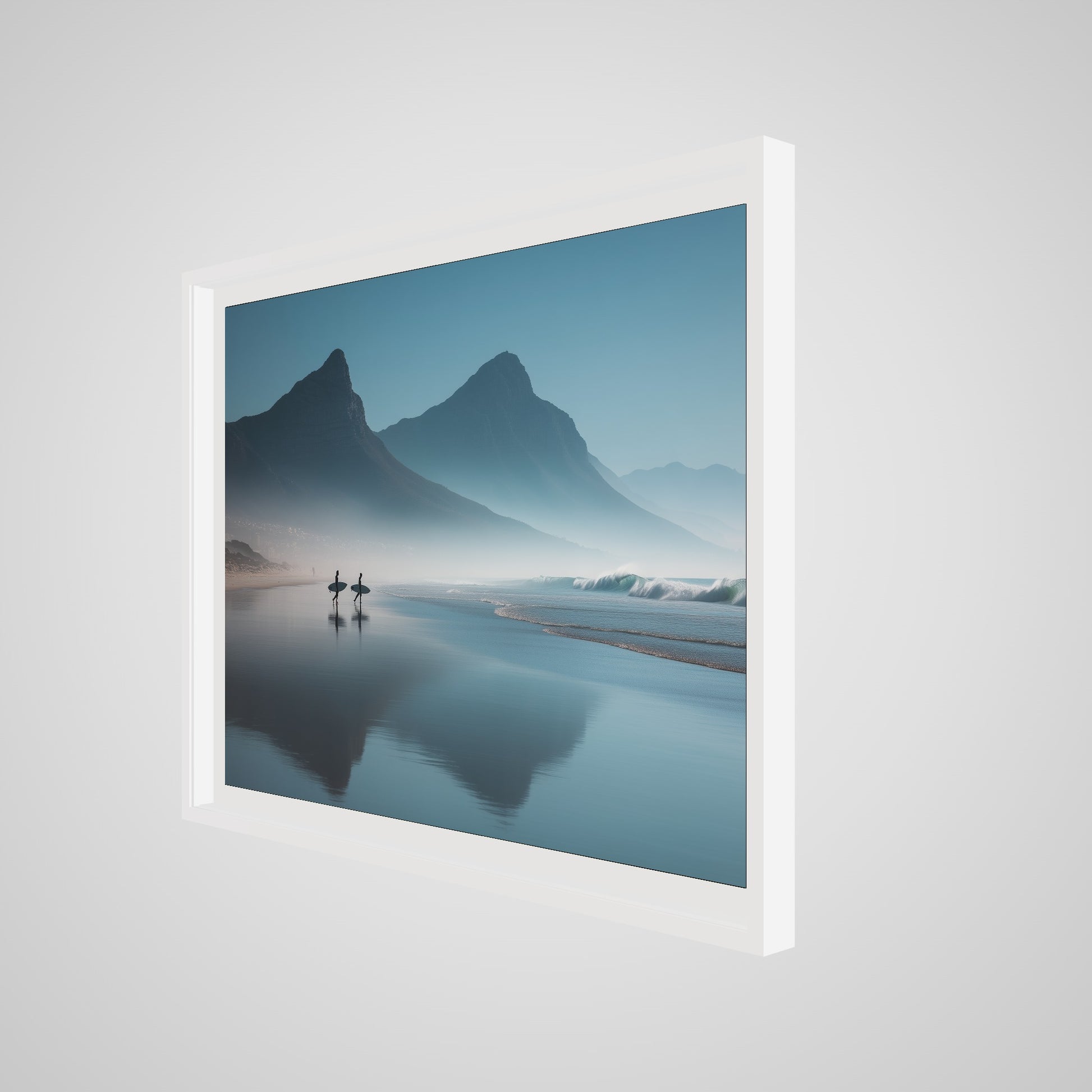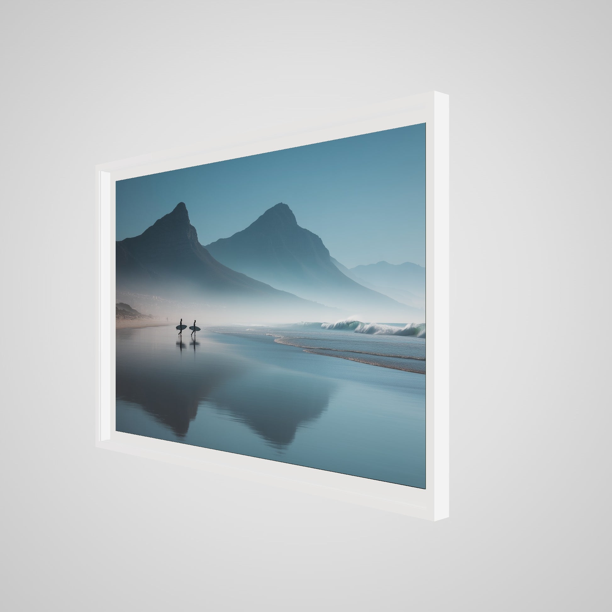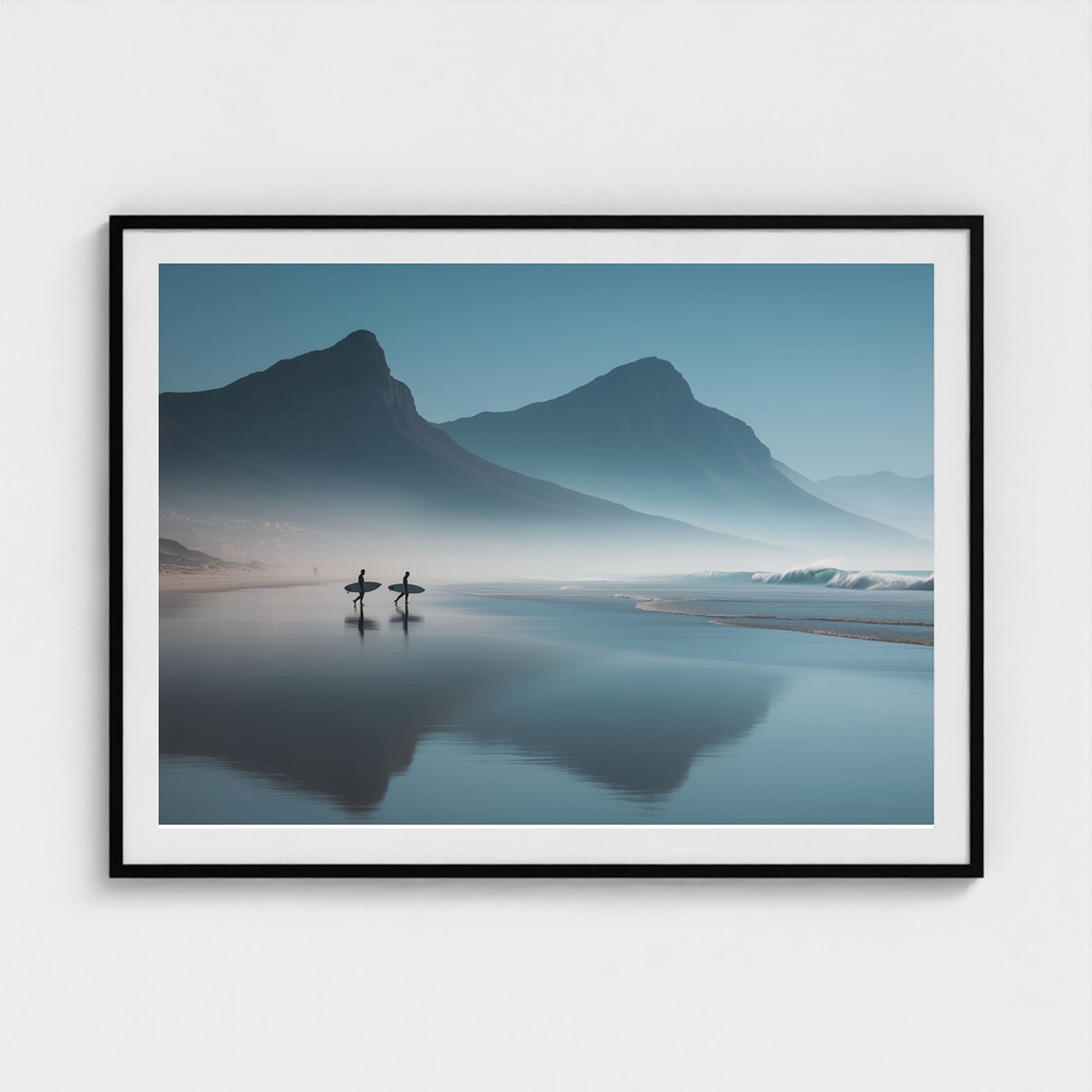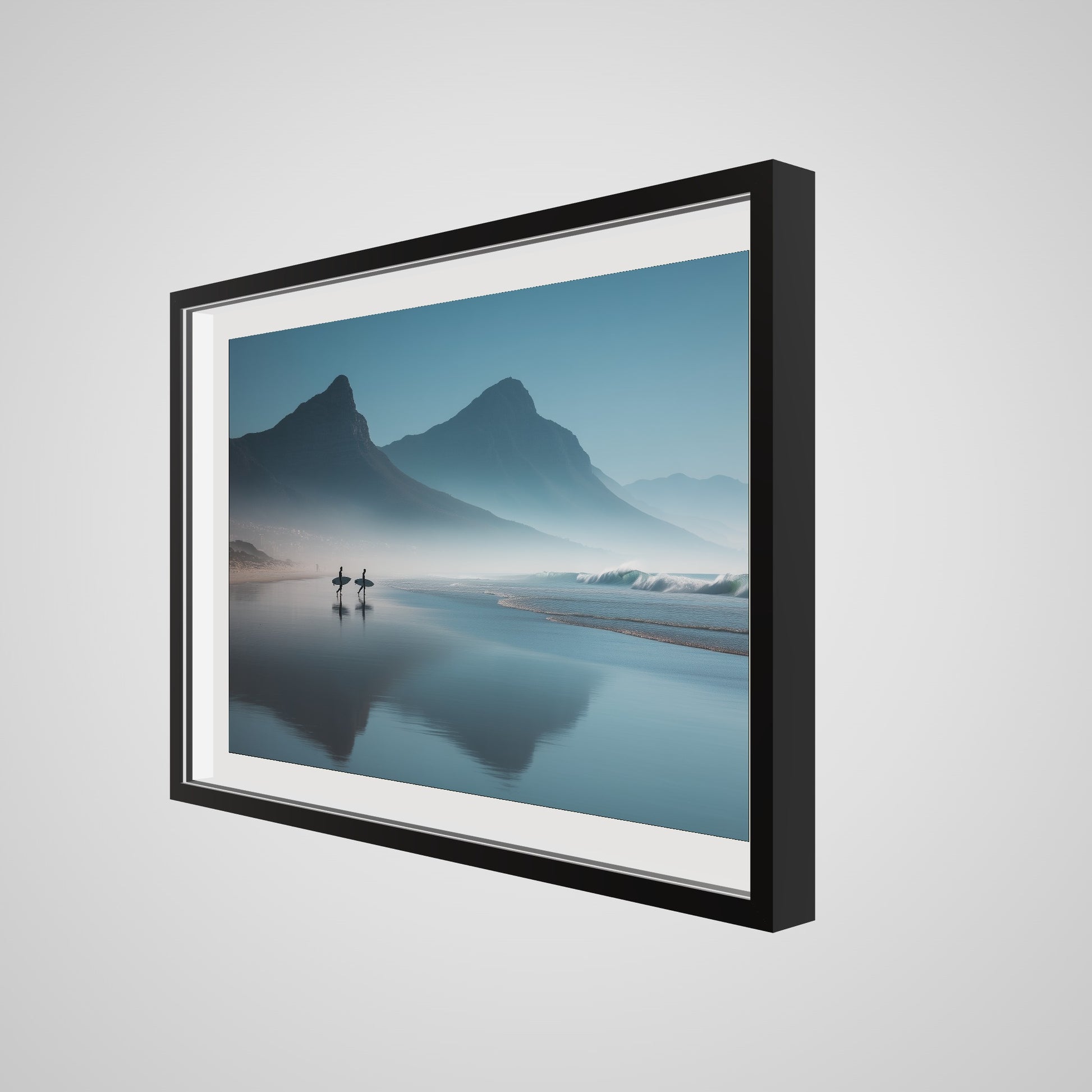 A serene dawn envelops the Table Mountain shoreline, where two silhouettes stand poised against the vastness of the ocean. The gentle mist and soft hues of morning light create a tranquil yet invigorating scene, capturing the quiet anticipation of the day's first surf.