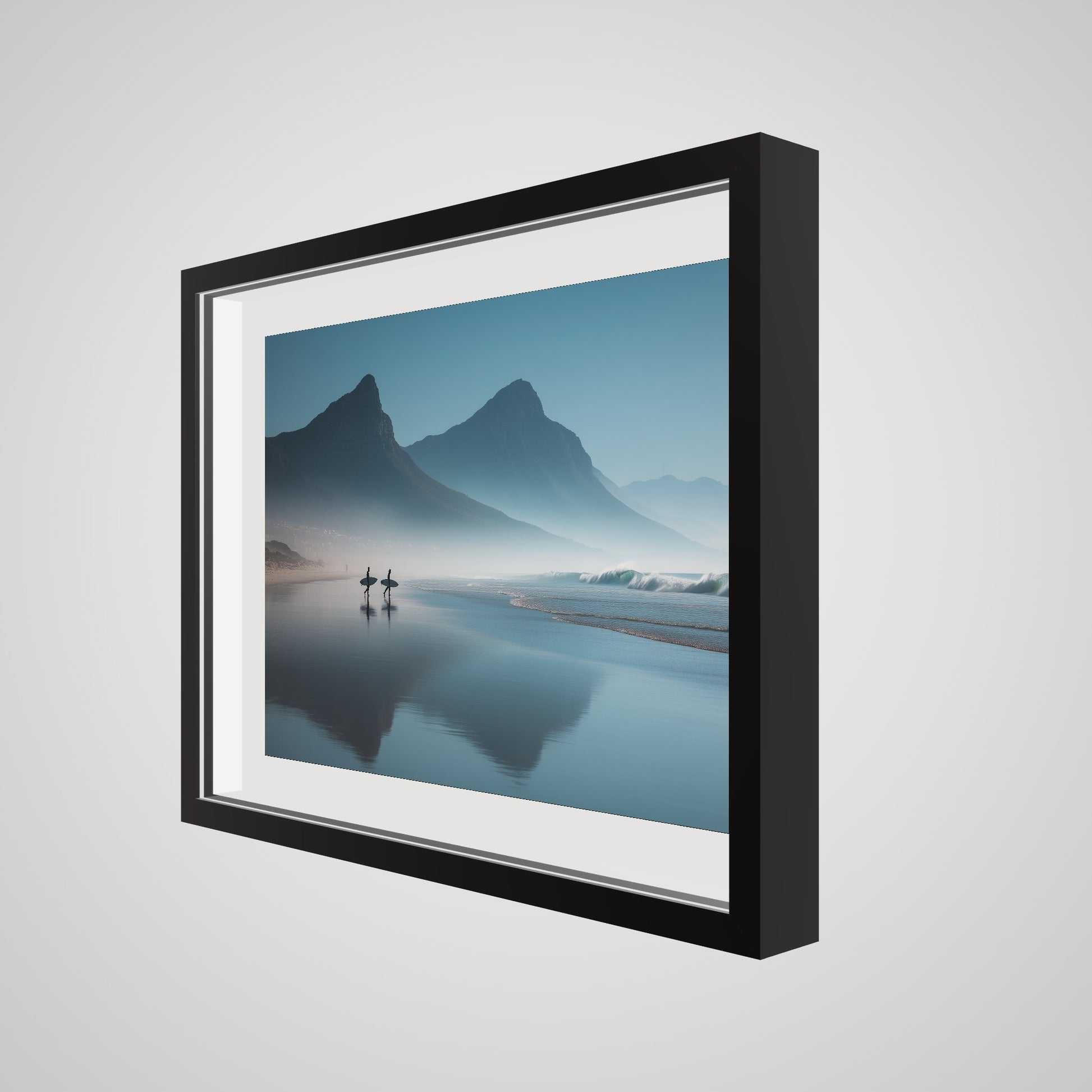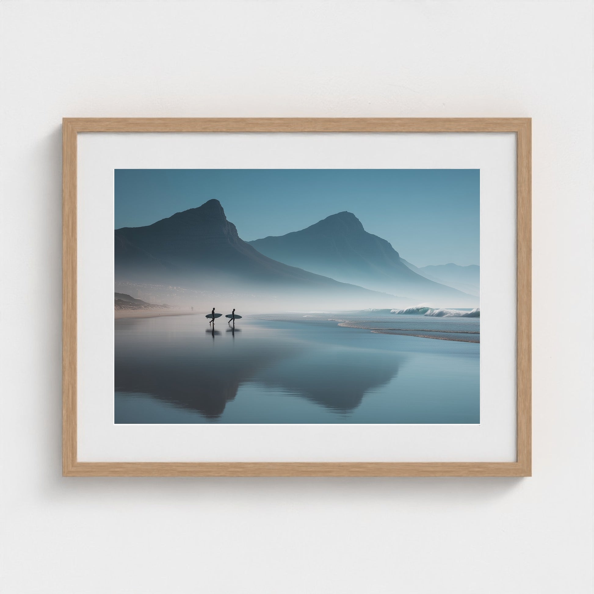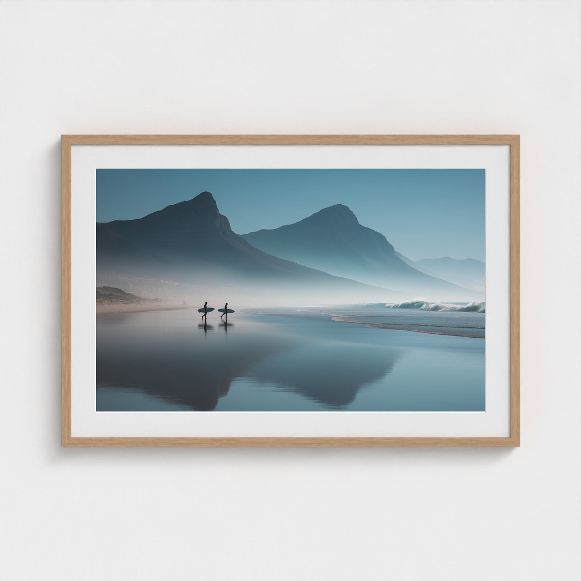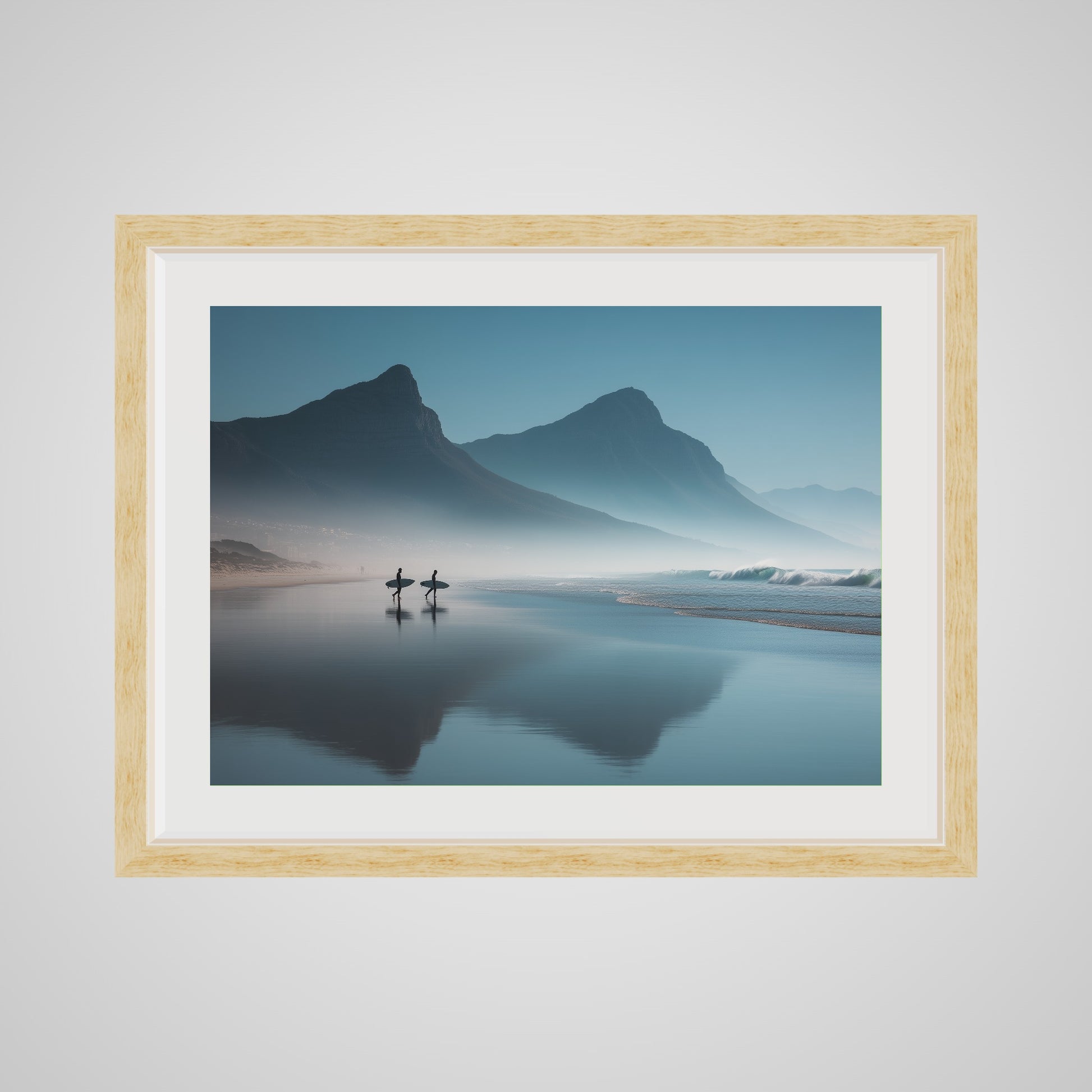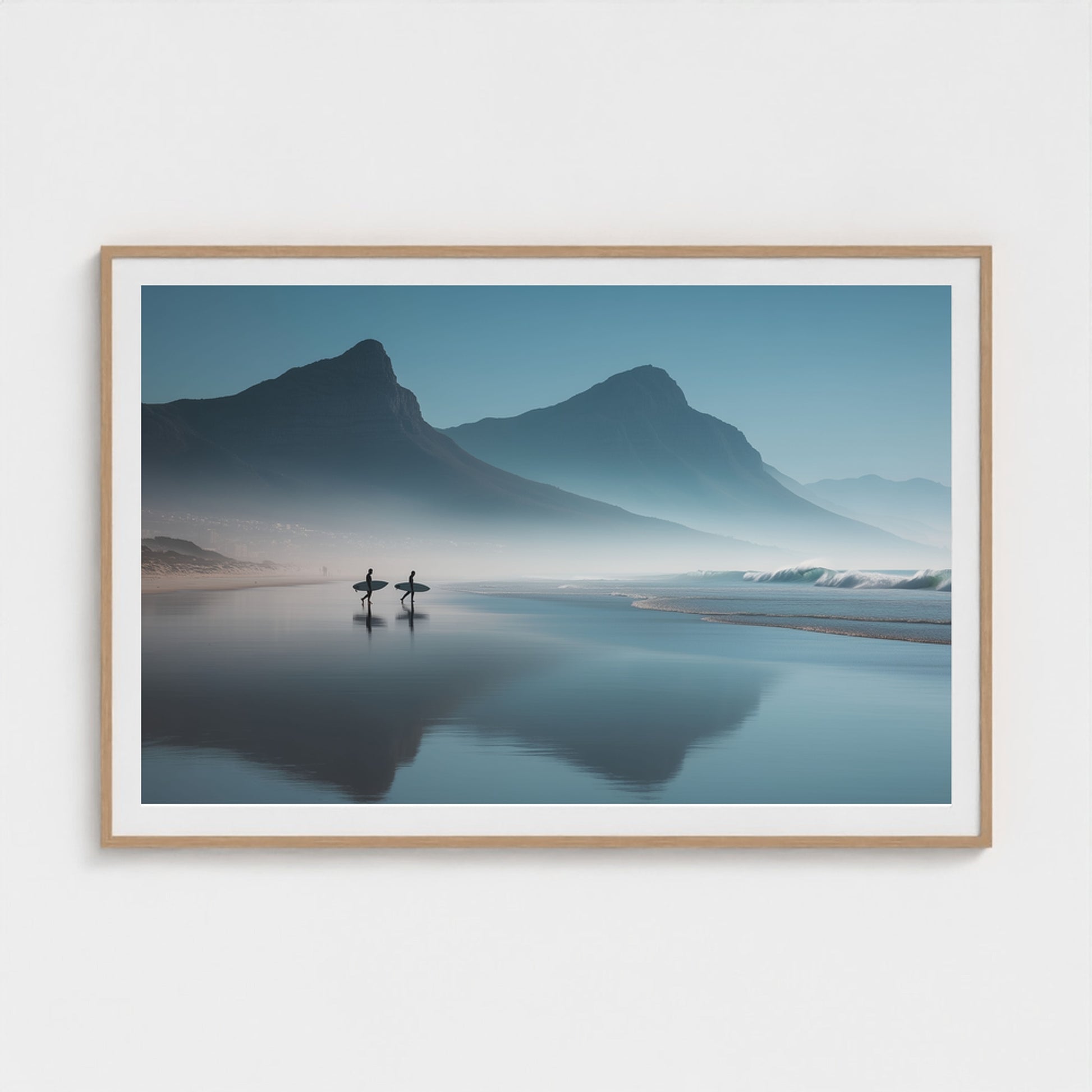 A serene dawn envelops the Table Mountain shoreline, where two silhouettes stand poised against the vastness of the ocean. The gentle mist and soft hues of morning light create a tranquil yet invigorating scene, capturing the quiet anticipation of the day's first surf.