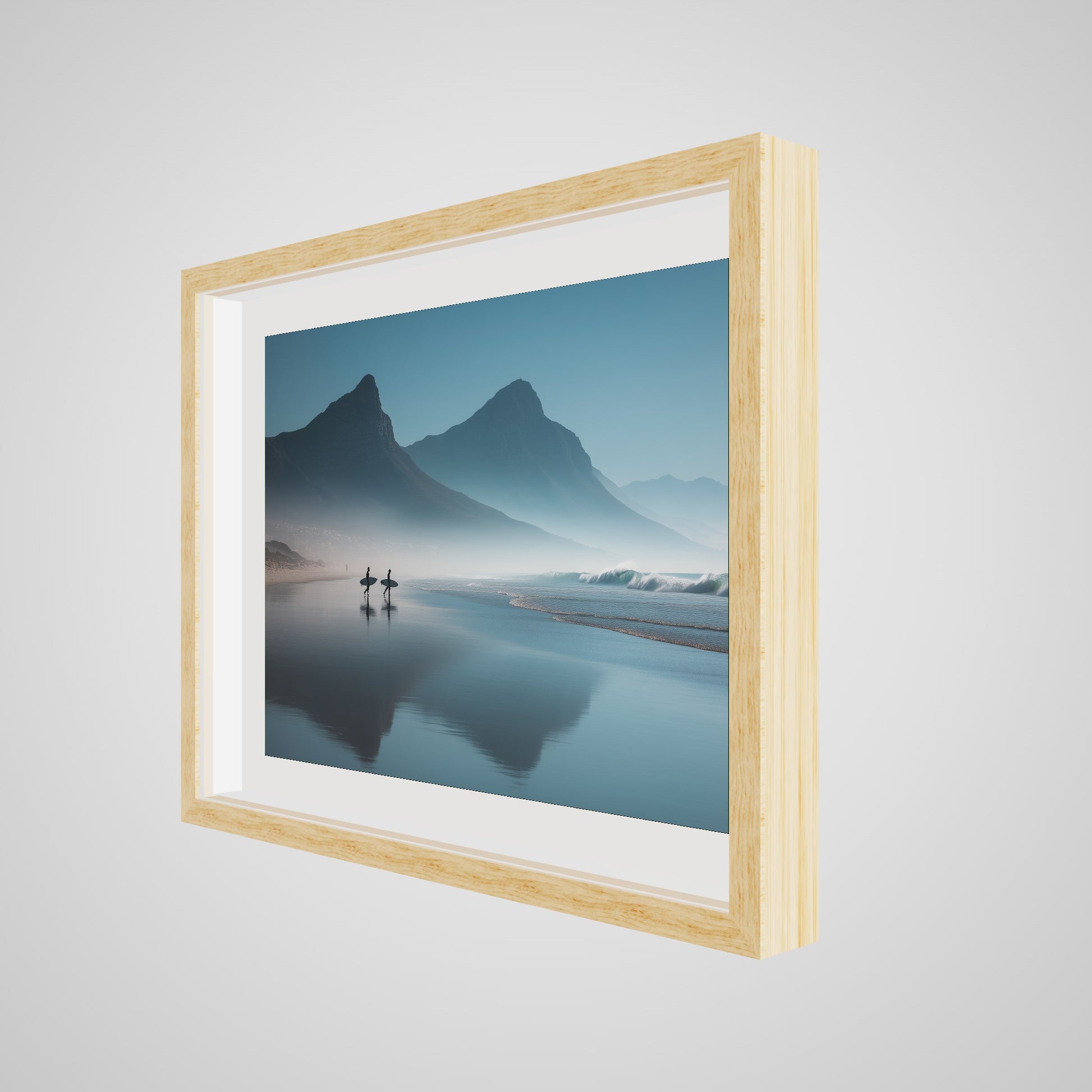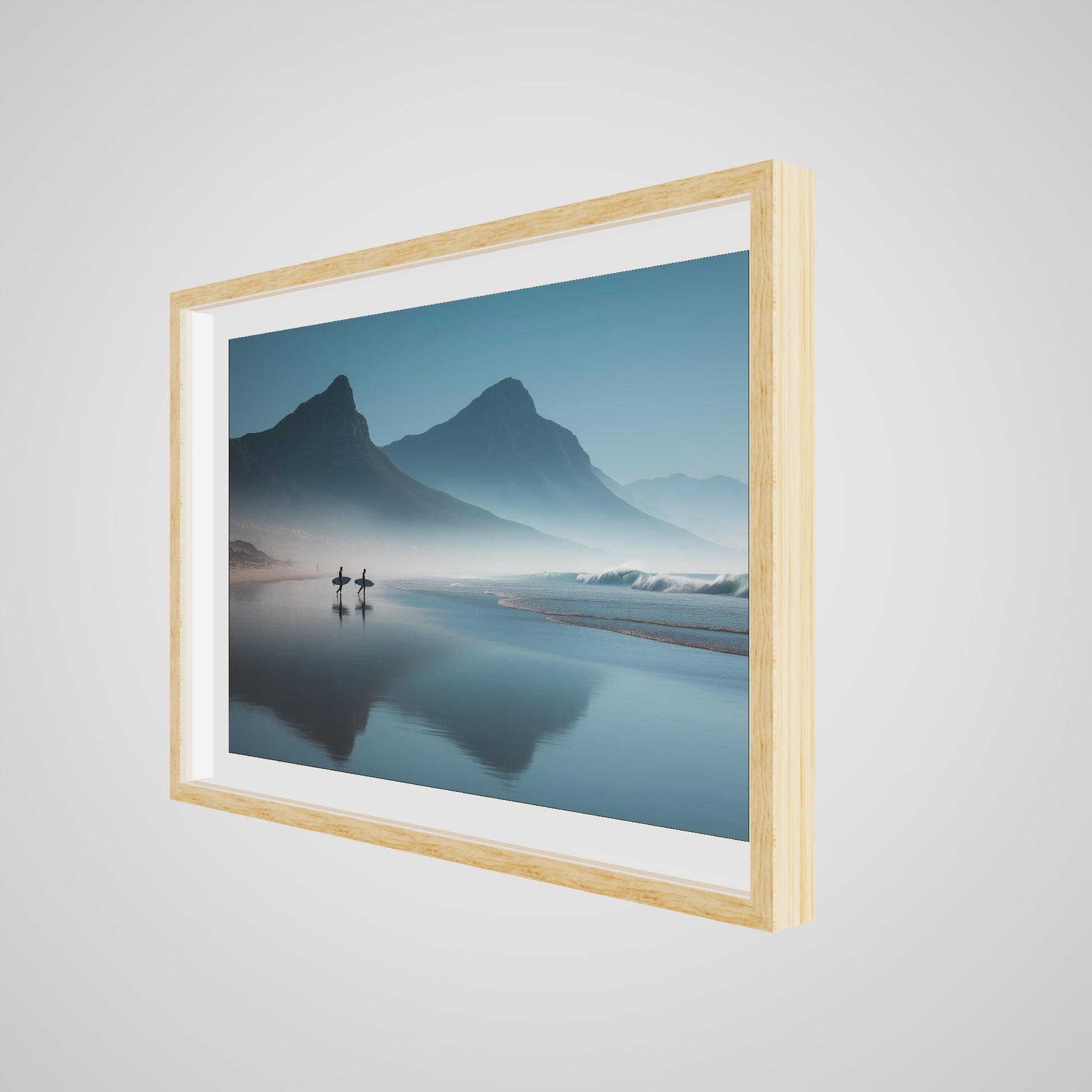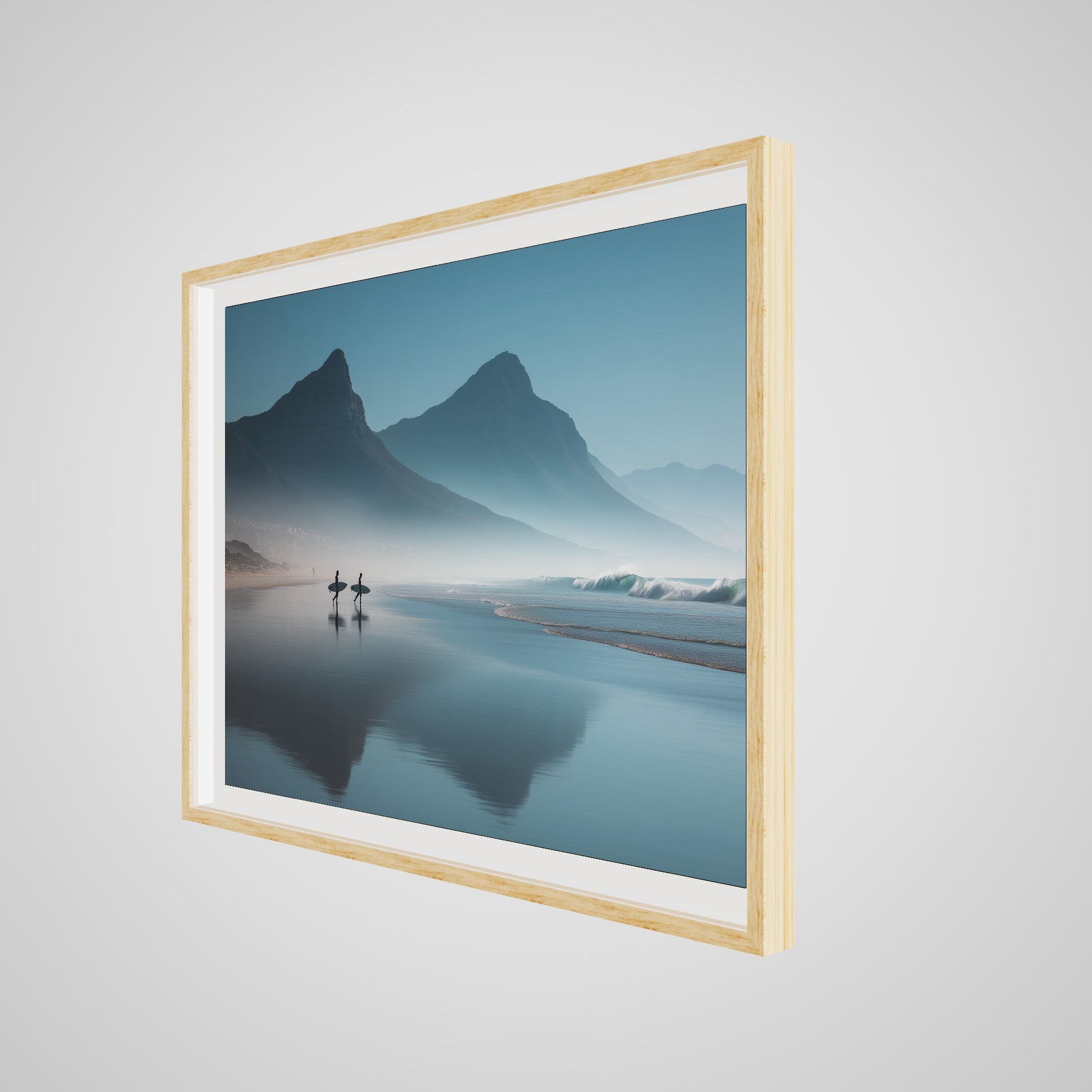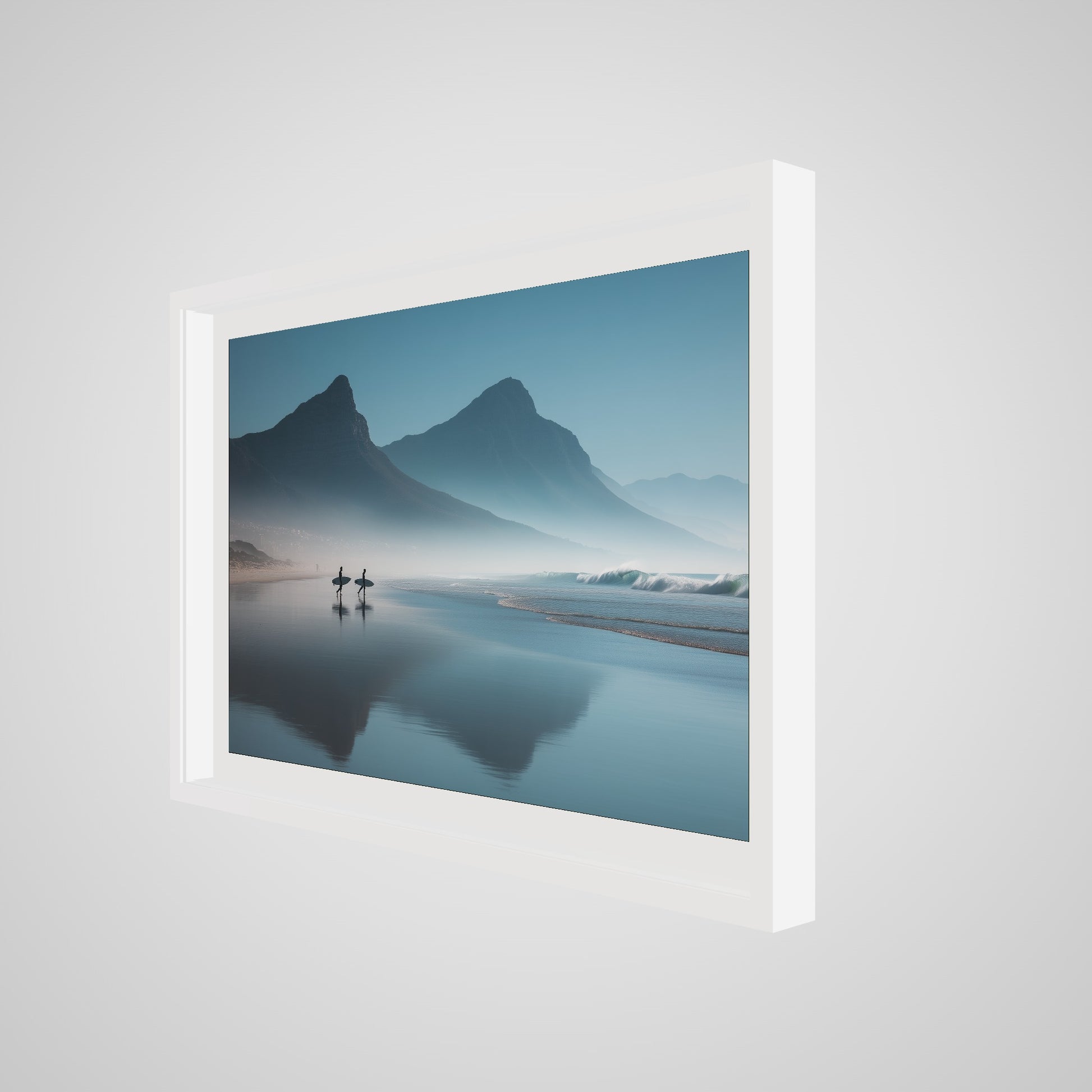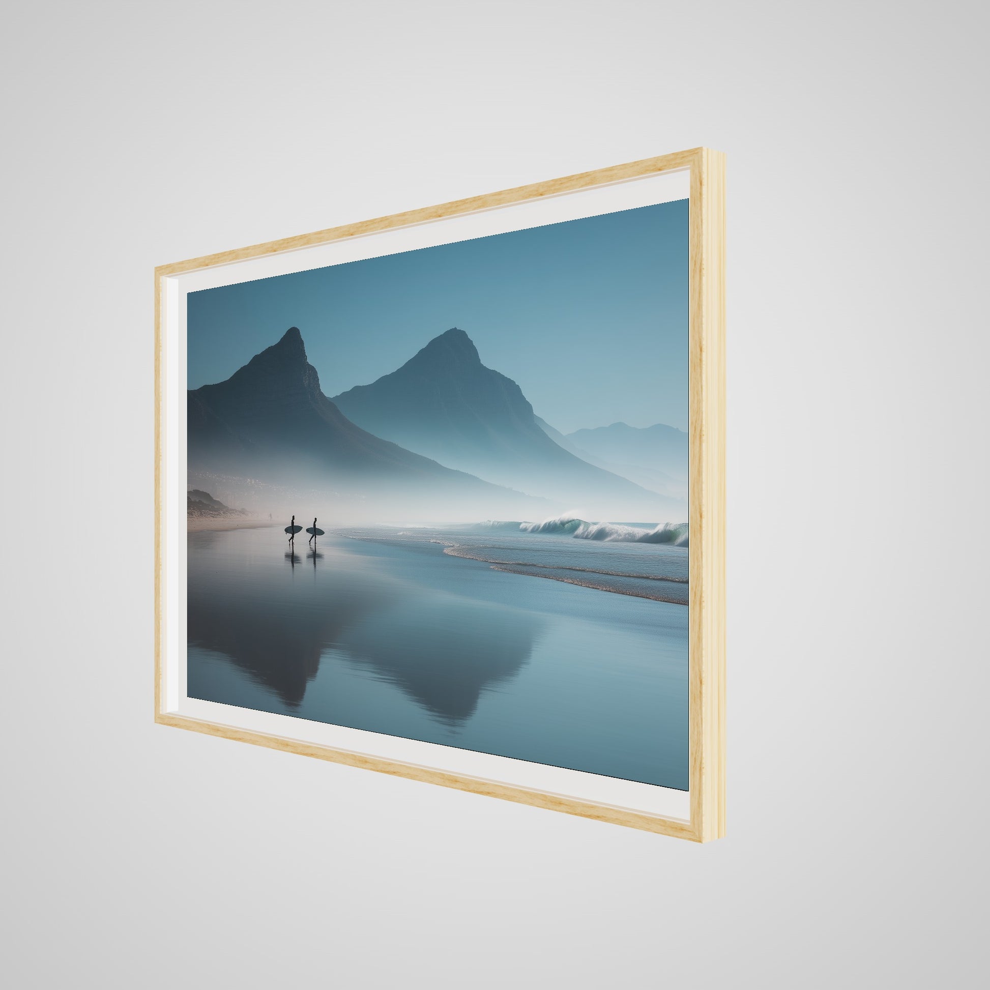 A serene dawn envelops the Table Mountain shoreline, where two silhouettes stand poised against the vastness of the ocean. The gentle mist and soft hues of morning light create a tranquil yet invigorating scene, capturing the quiet anticipation of the day's first surf.