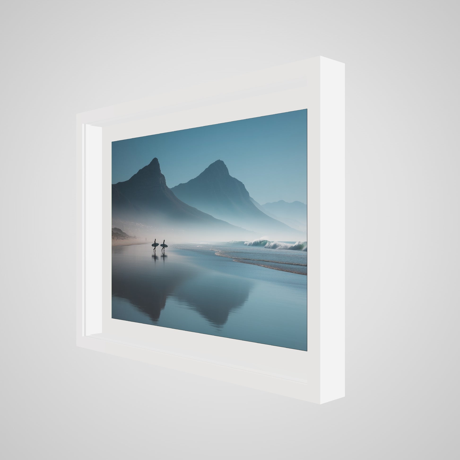 This cinematic work skillfully balances composition and color, with the distant peaks mirrored in the calm waters. The subtle gradient of blues and grays is punctuated by the surfers, adding a dynamic element. The interplay of light and shadow enhances the texture of the scene, drawing the viewer into the crisp, early morning ambiance.