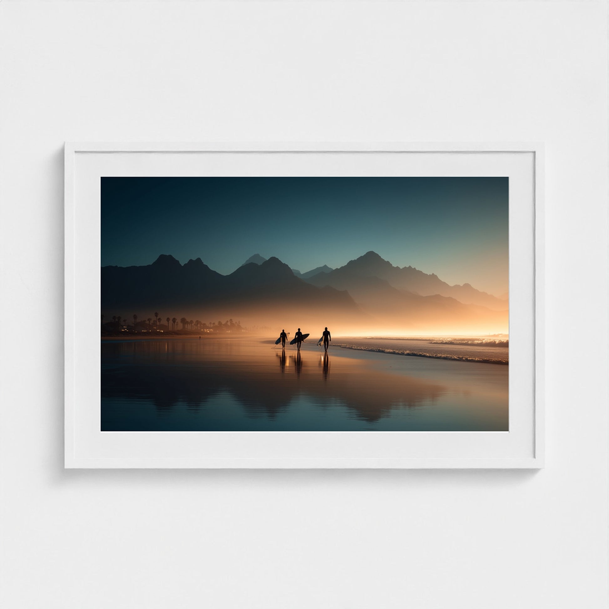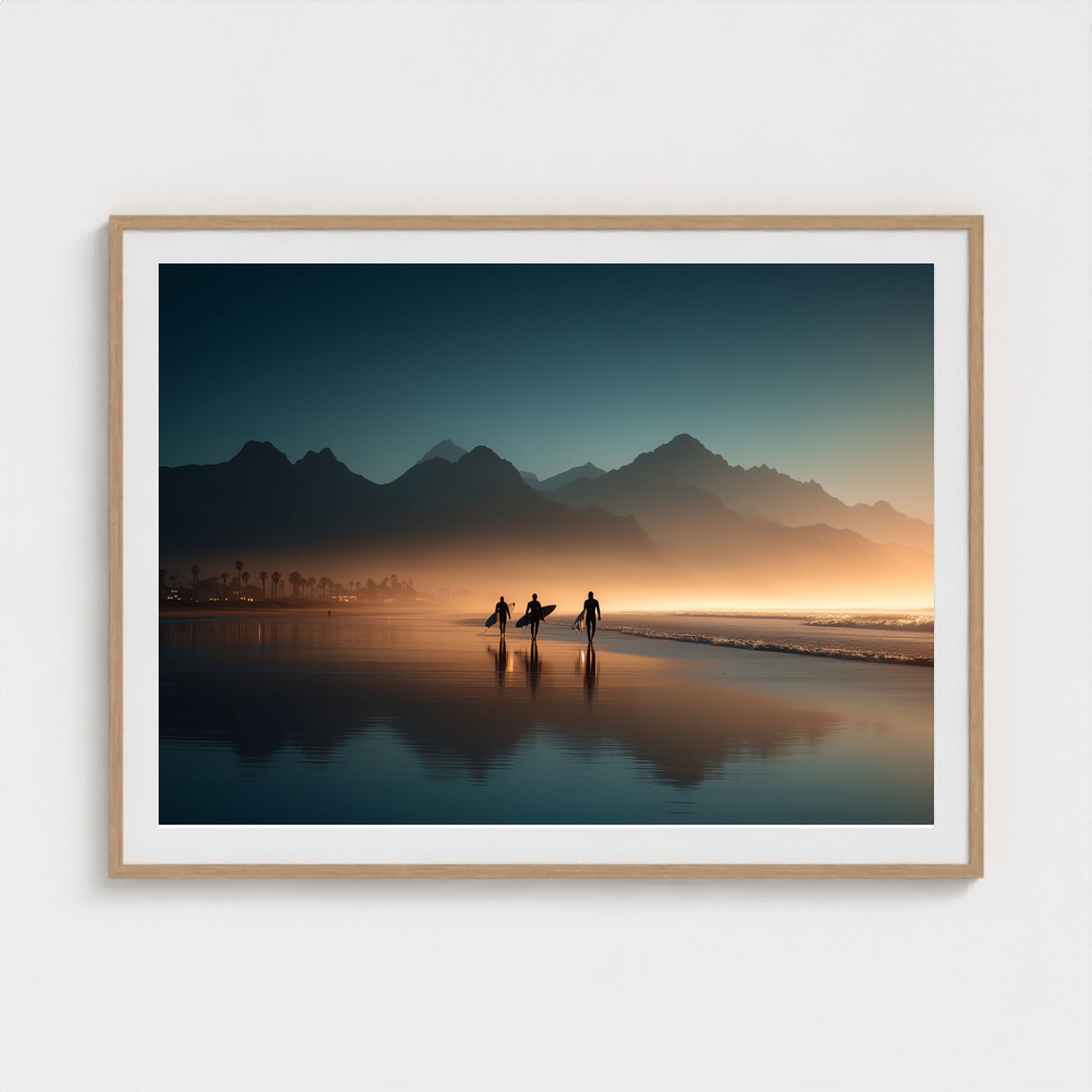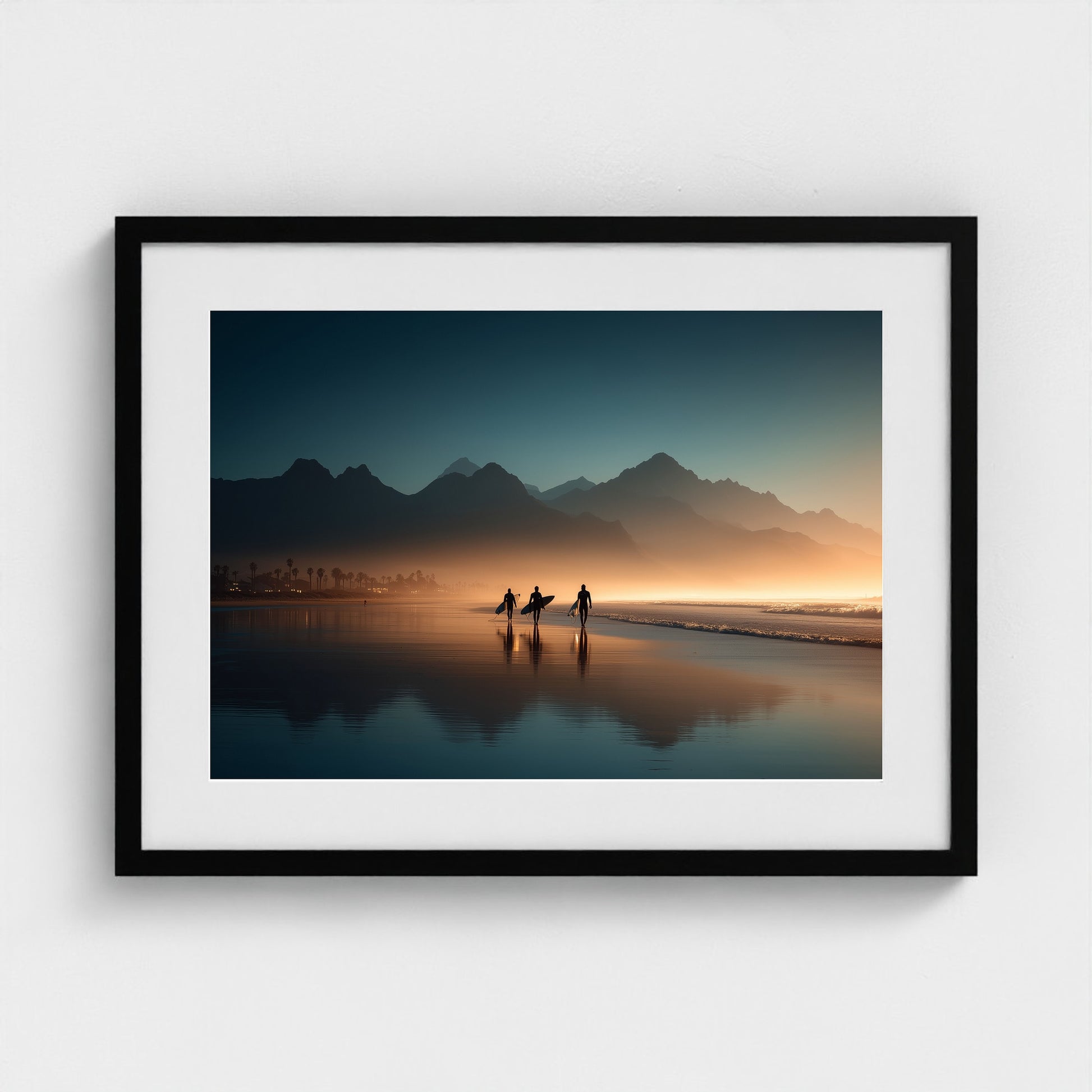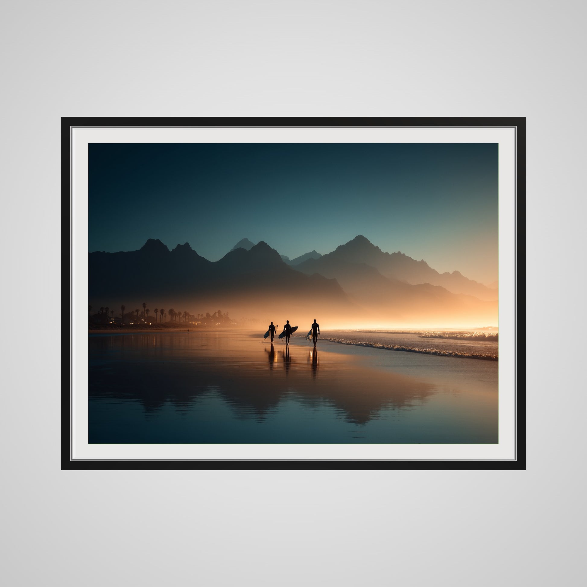 The sun dips below the horizon in 'Cape Town Sunset Surf,' casting a golden glow over the tranquil waters and silhouetting surfers on their final wave. This piece captures the serene yet exhilarating essence of a day’s end, enveloping the viewer in its calm, reflective mood.