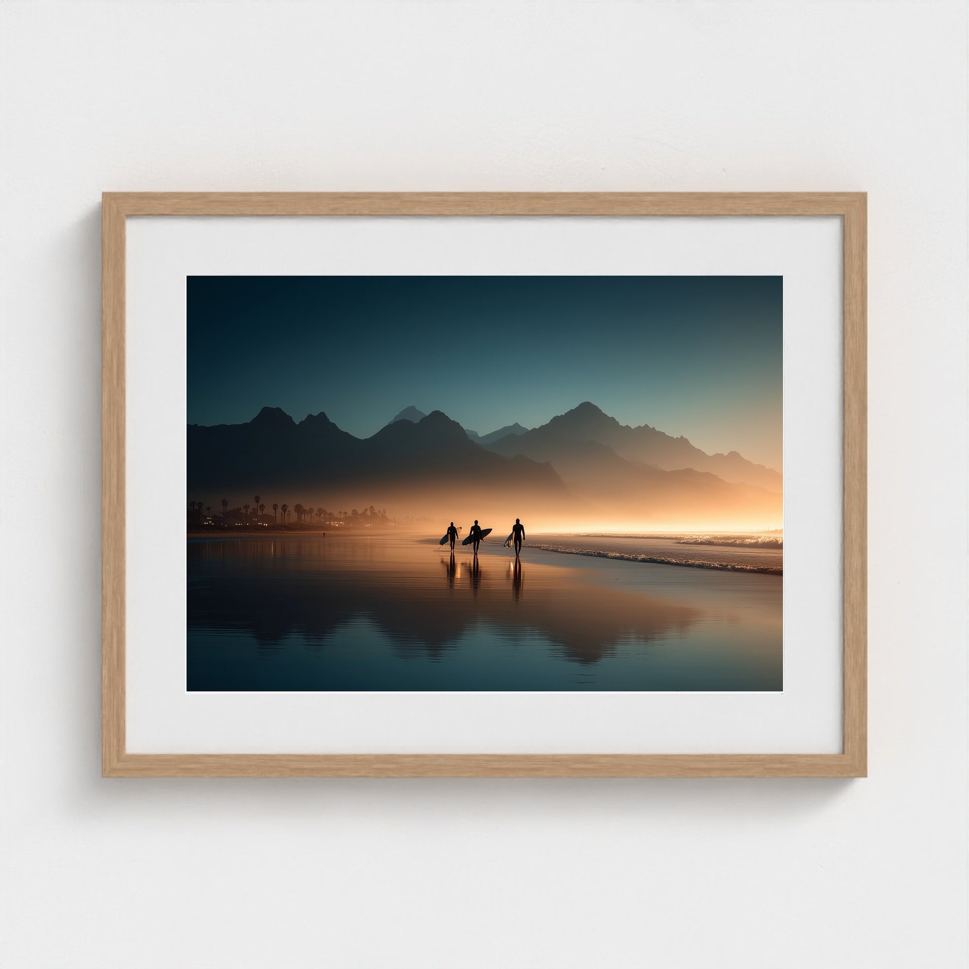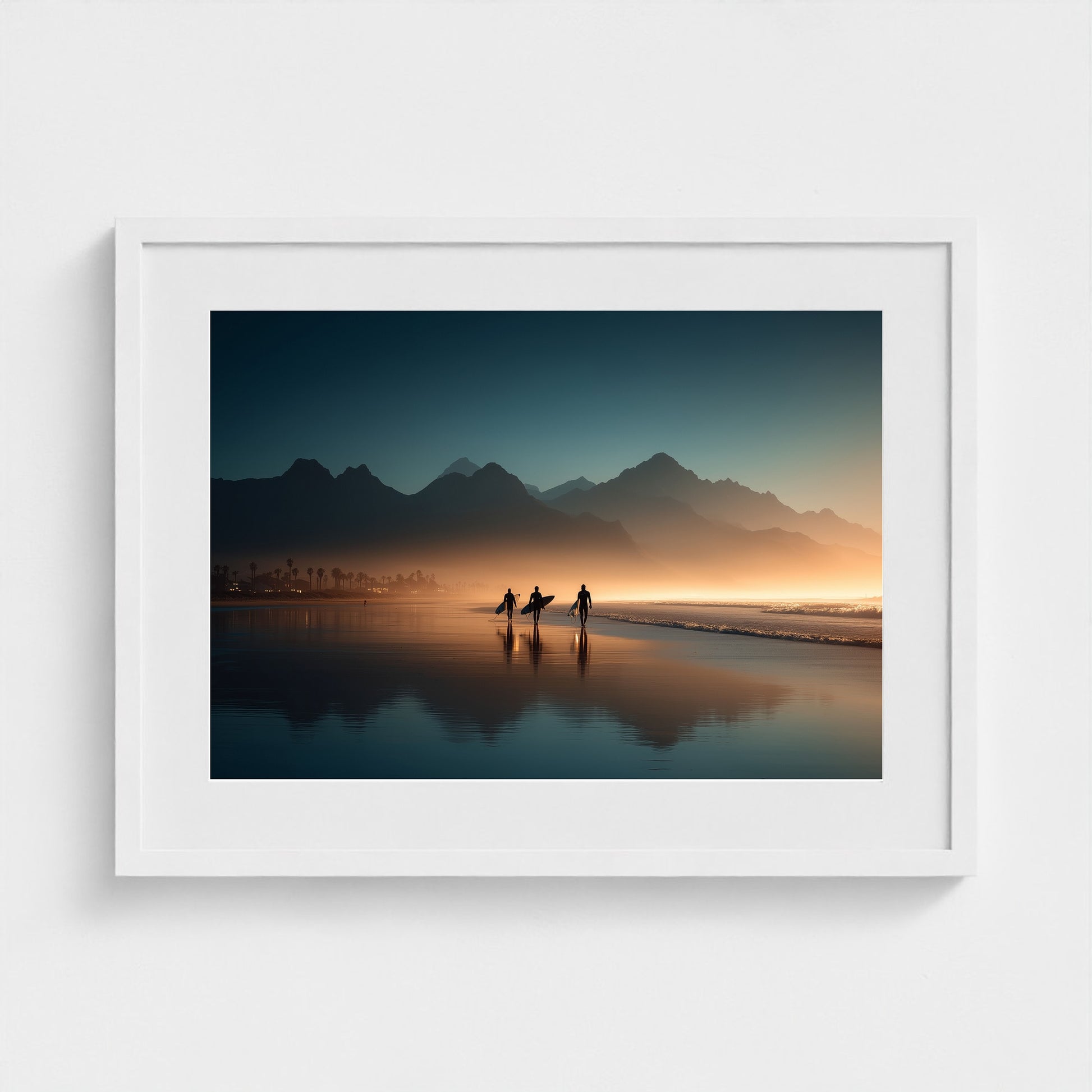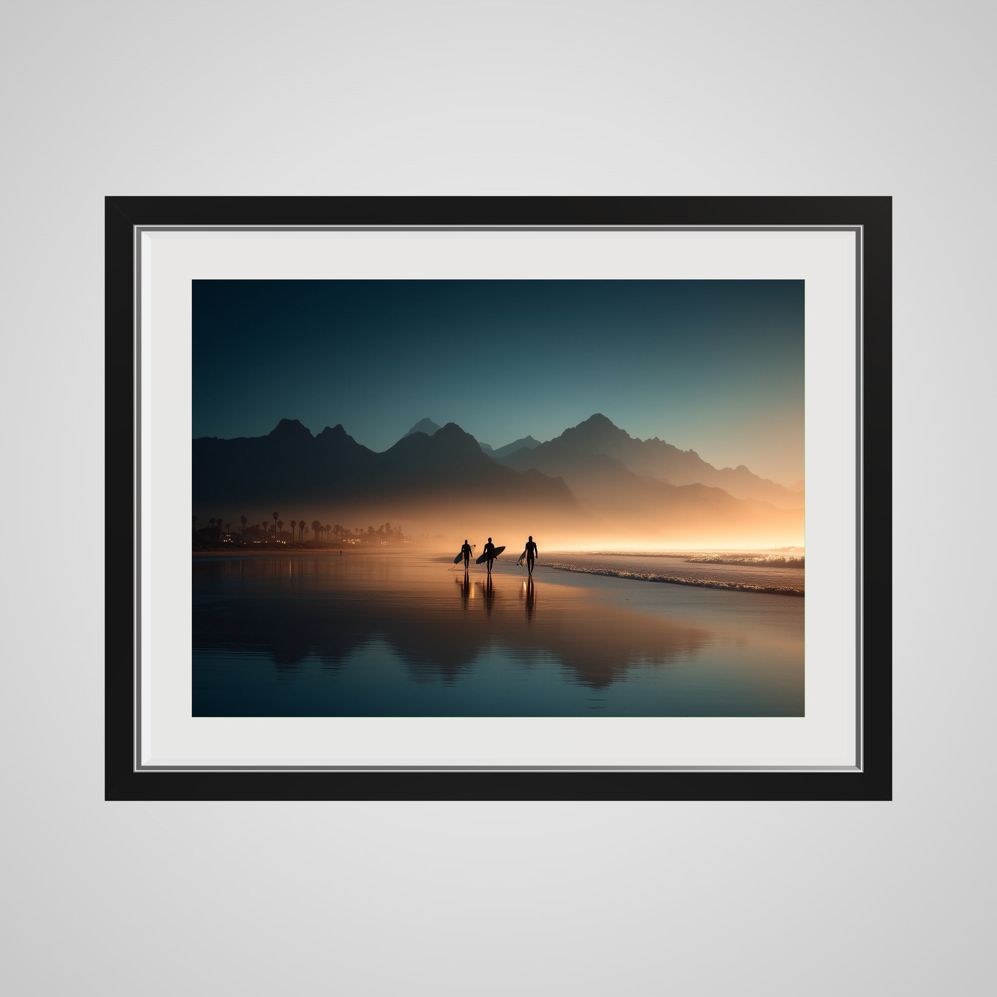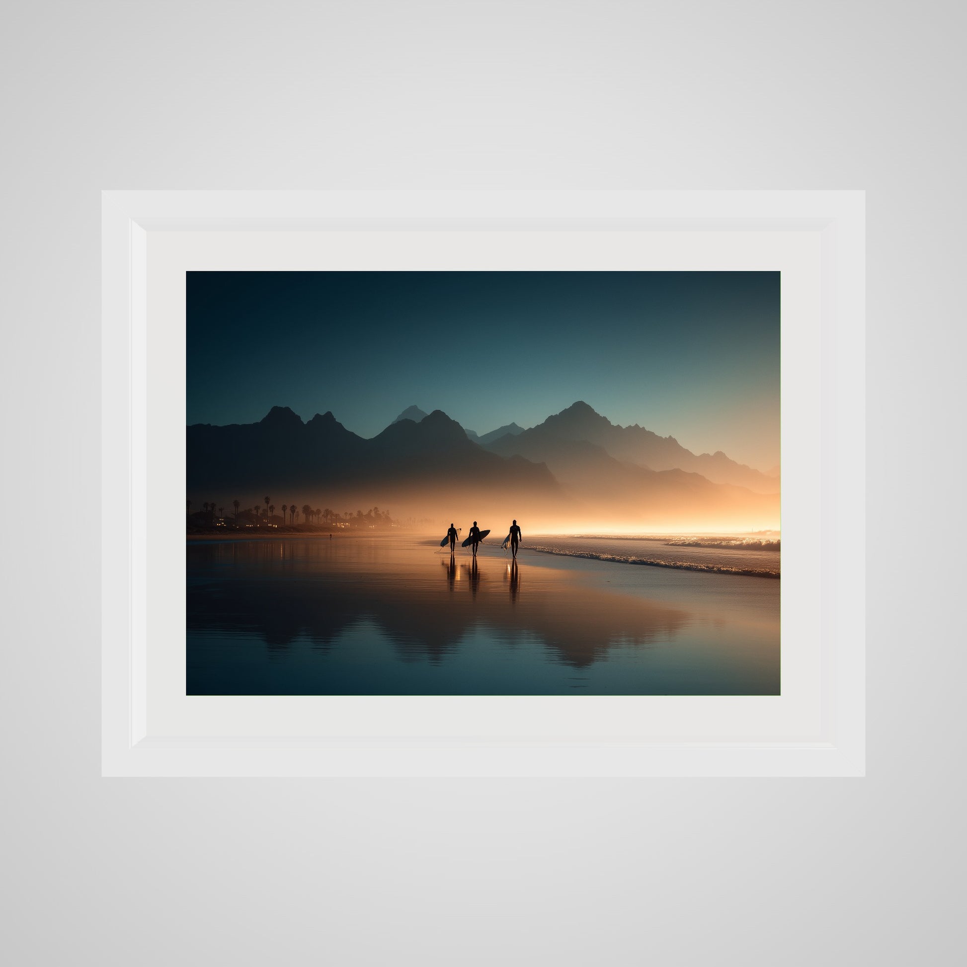 The sun dips below the horizon in 'Cape Town Sunset Surf,' casting a golden glow over the tranquil waters and silhouetting surfers on their final wave. This piece captures the serene yet exhilarating essence of a day’s end, enveloping the viewer in its calm, reflective mood.