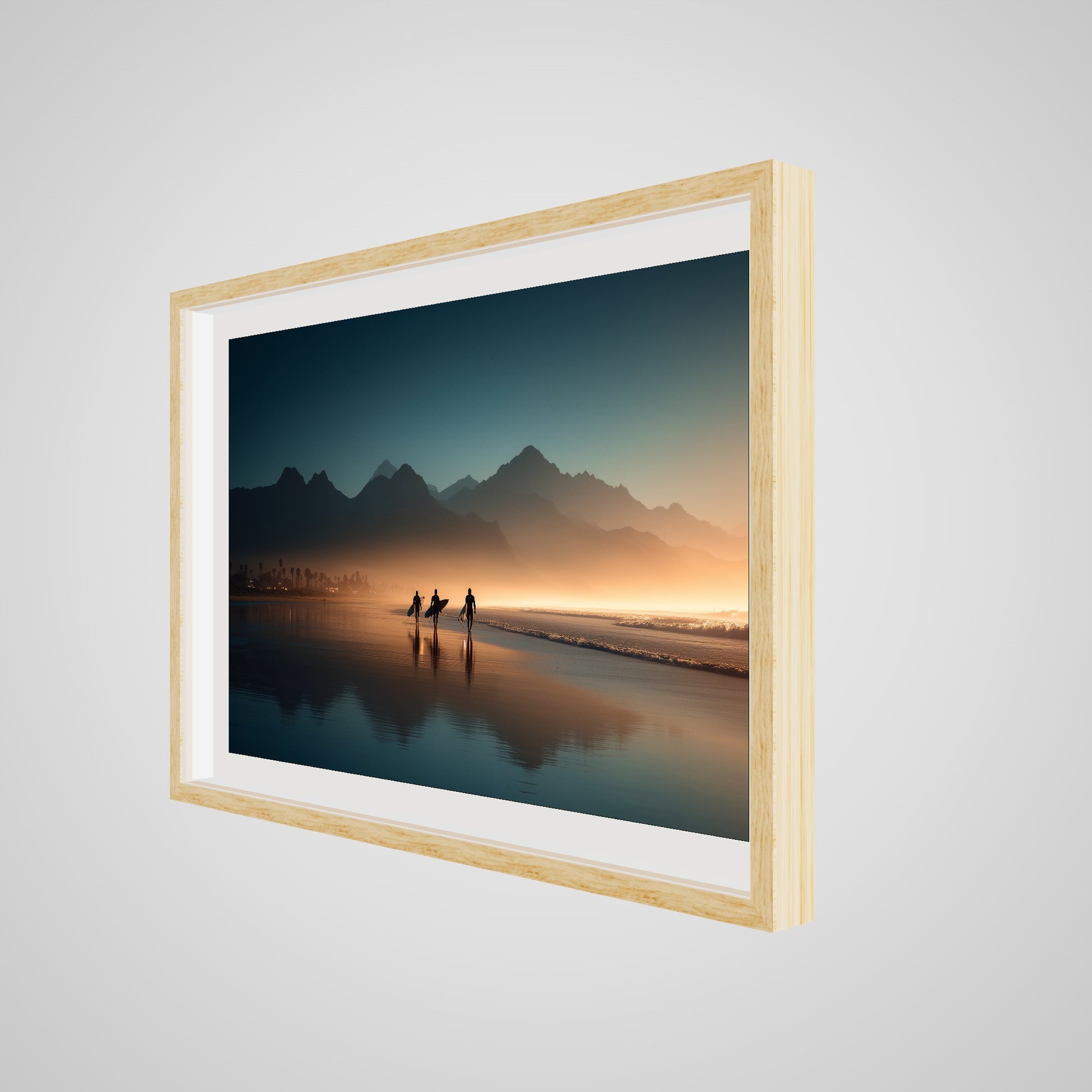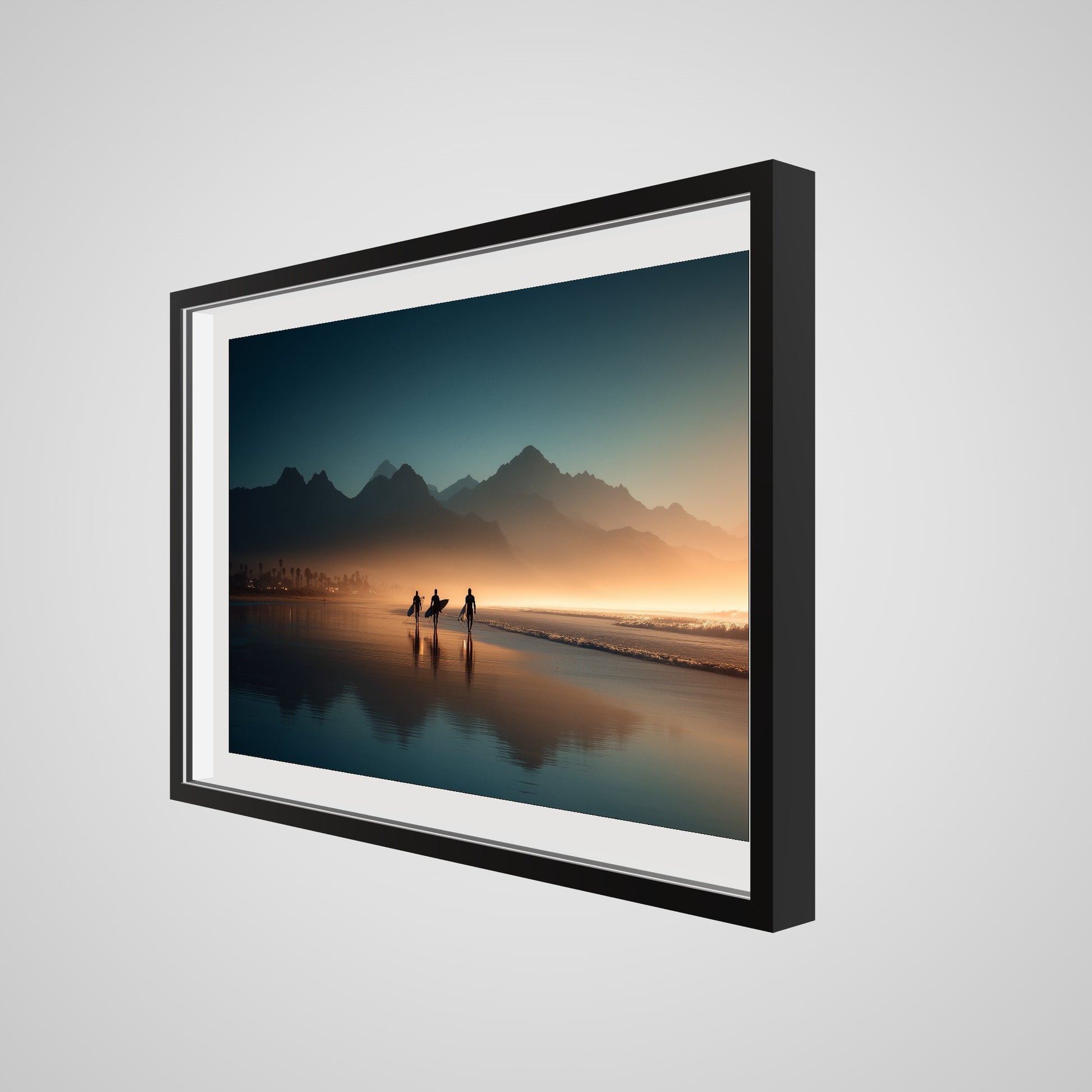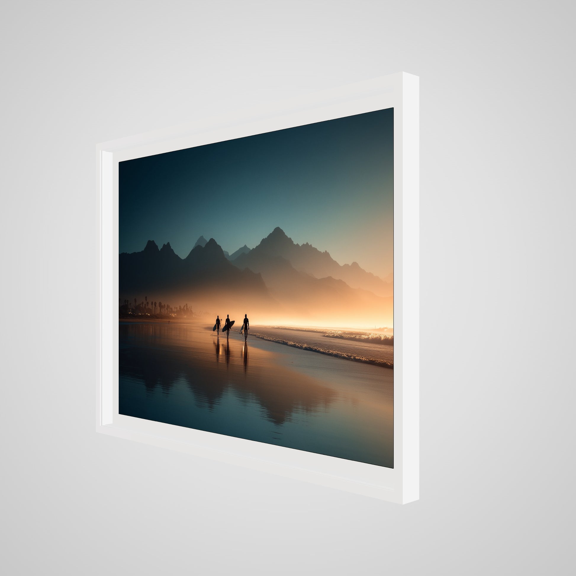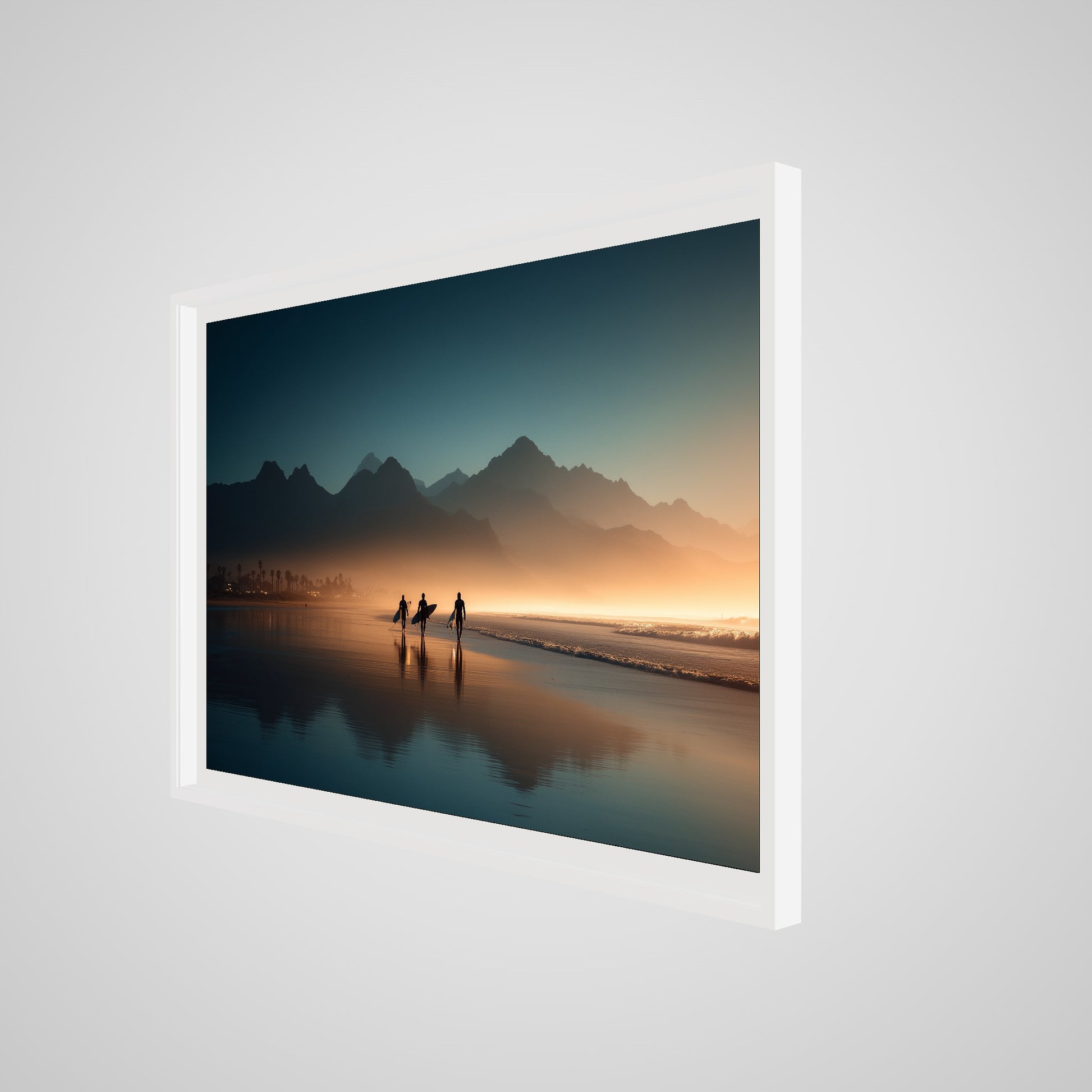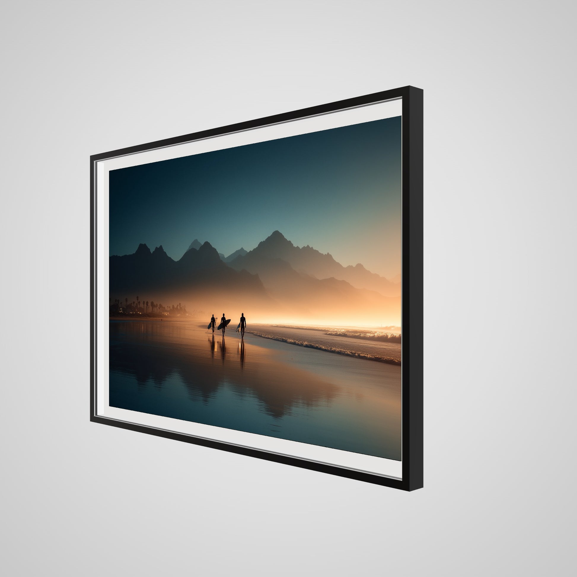 The sun dips below the horizon in 'Cape Town Sunset Surf,' casting a golden glow over the tranquil waters and silhouetting surfers on their final wave. This piece captures the serene yet exhilarating essence of a day’s end, enveloping the viewer in its calm, reflective mood.