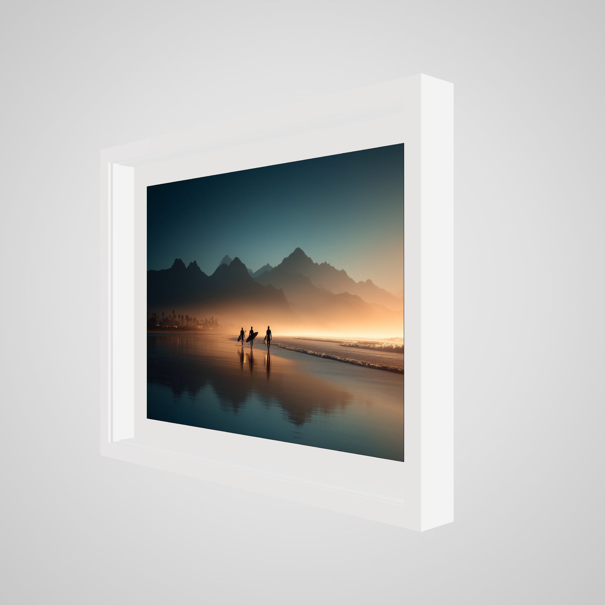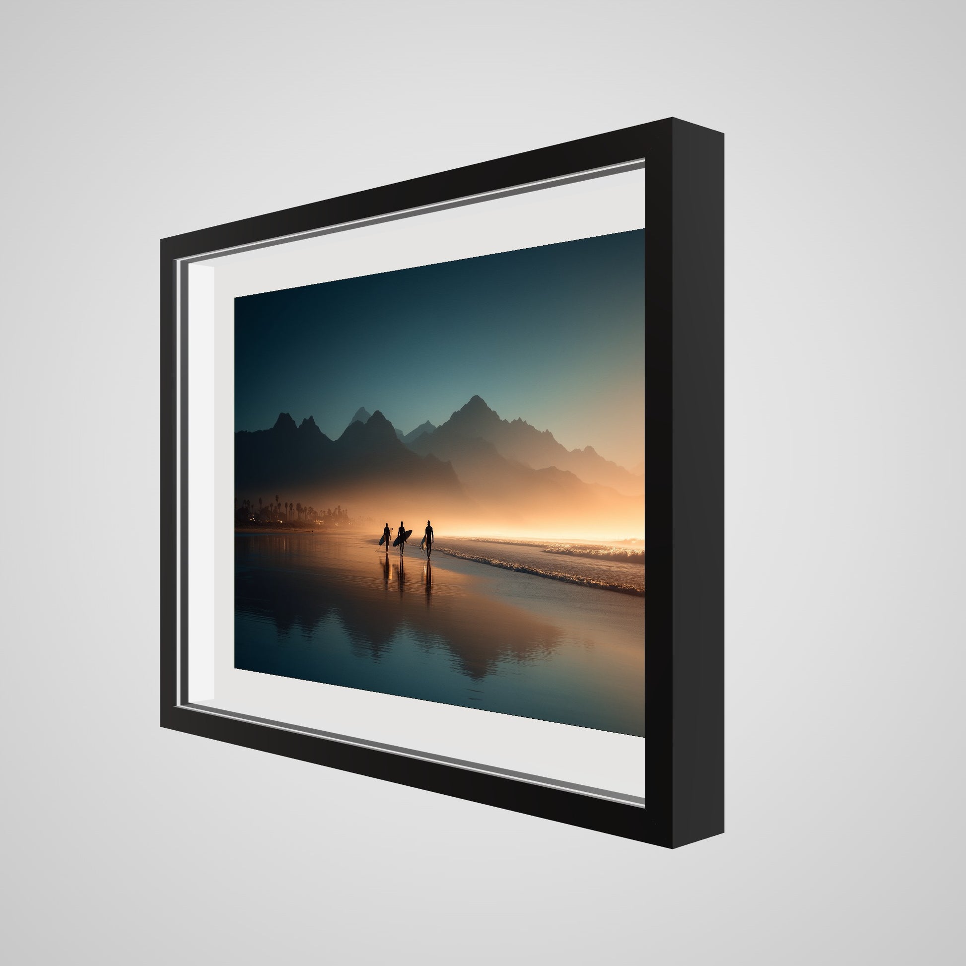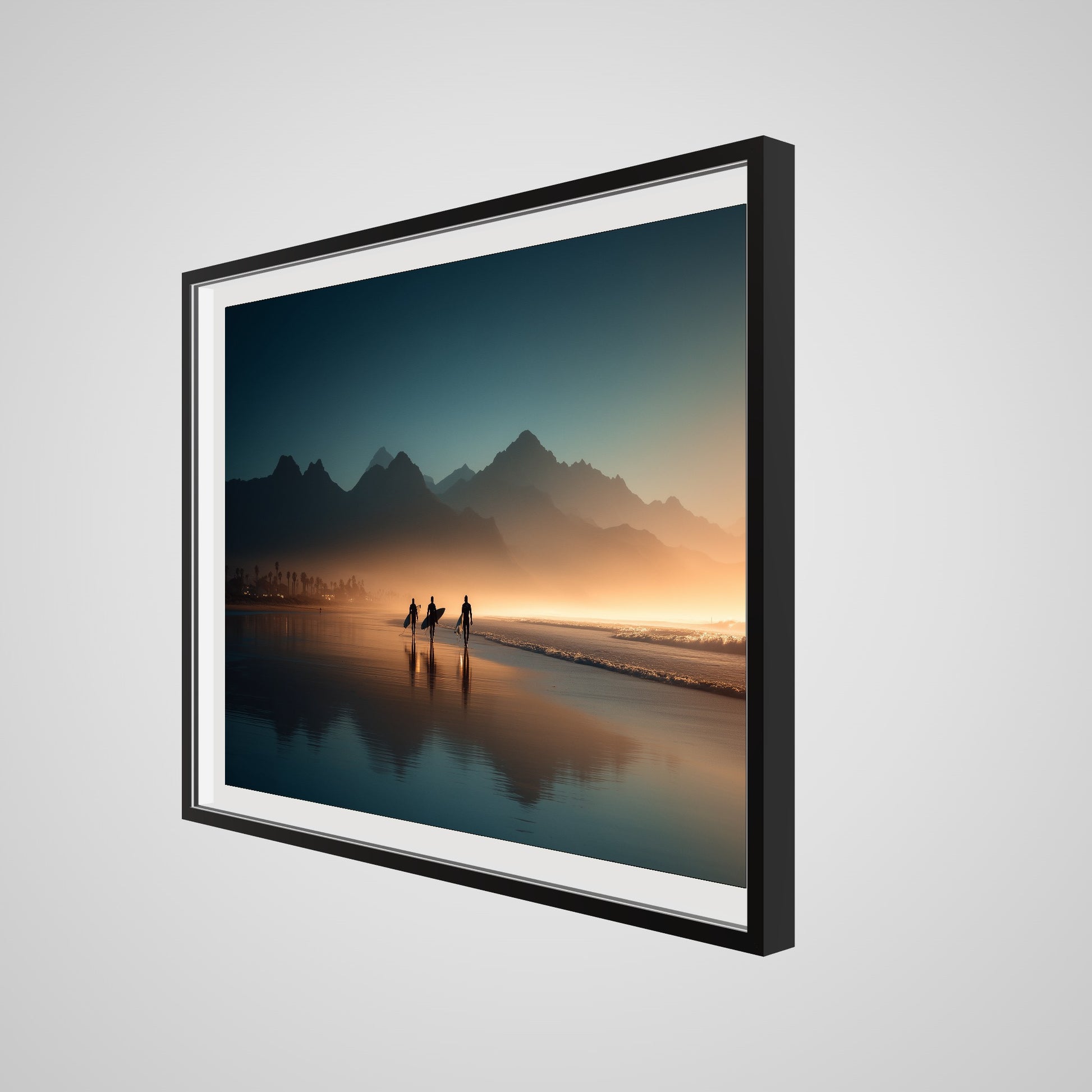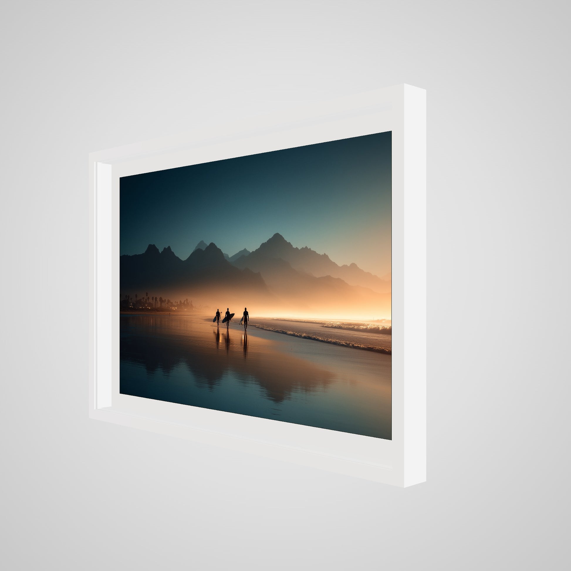 The sun dips below the horizon in 'Cape Town Sunset Surf,' casting a golden glow over the tranquil waters and silhouetting surfers on their final wave. This piece captures the serene yet exhilarating essence of a day’s end, enveloping the viewer in its calm, reflective mood.