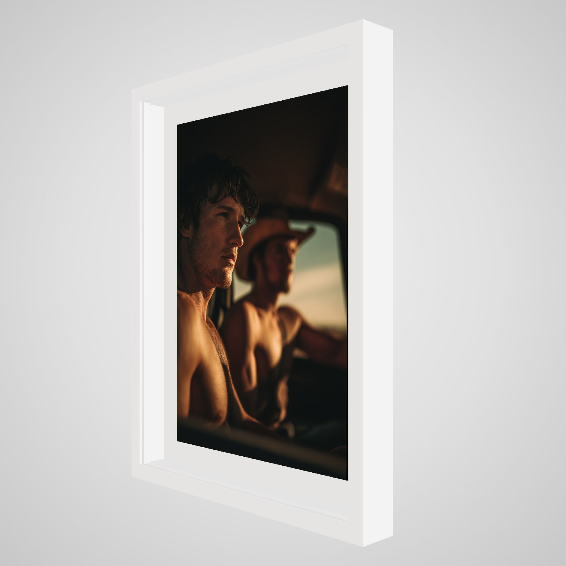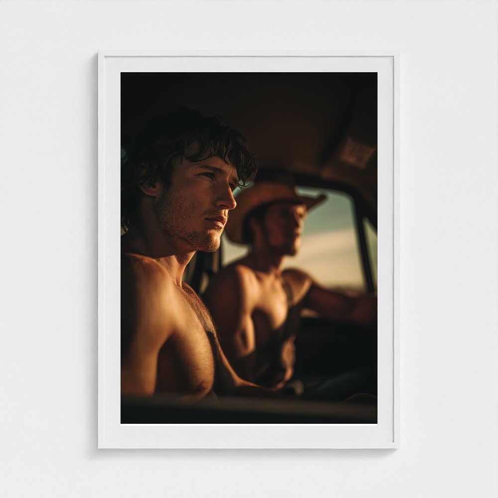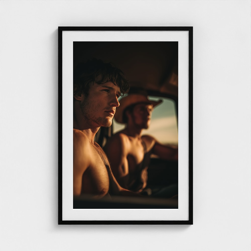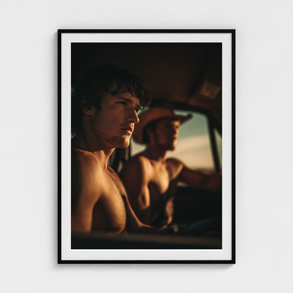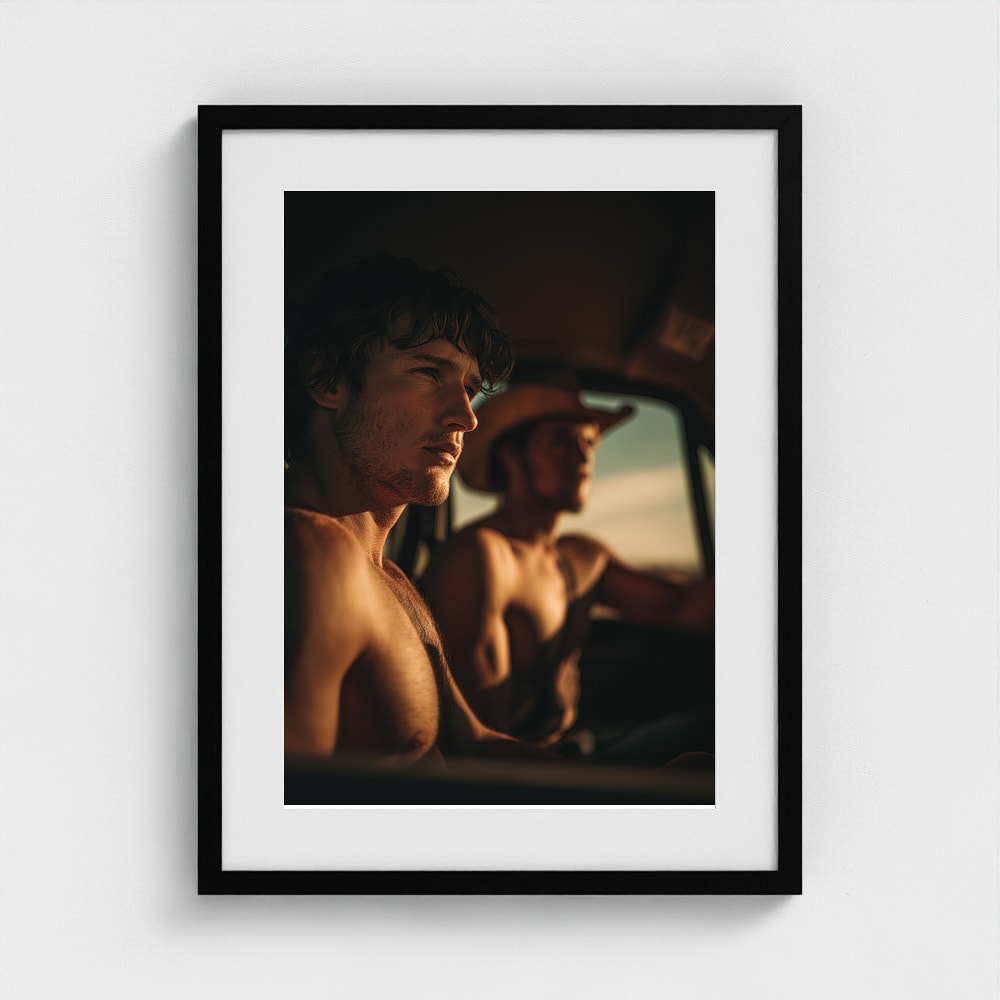 This contemporary portrait captures two men seated inside a pickup, illuminated by the soft pour of late-day sunlight. Warm, golden tones settle gently across skin, fabric, and glass, creating a suspended moment of introspective calm. The atmosphere feels intimate yet unforced, inviting the viewer into a quiet narrative of shared space, proximity, and unspoken connection.