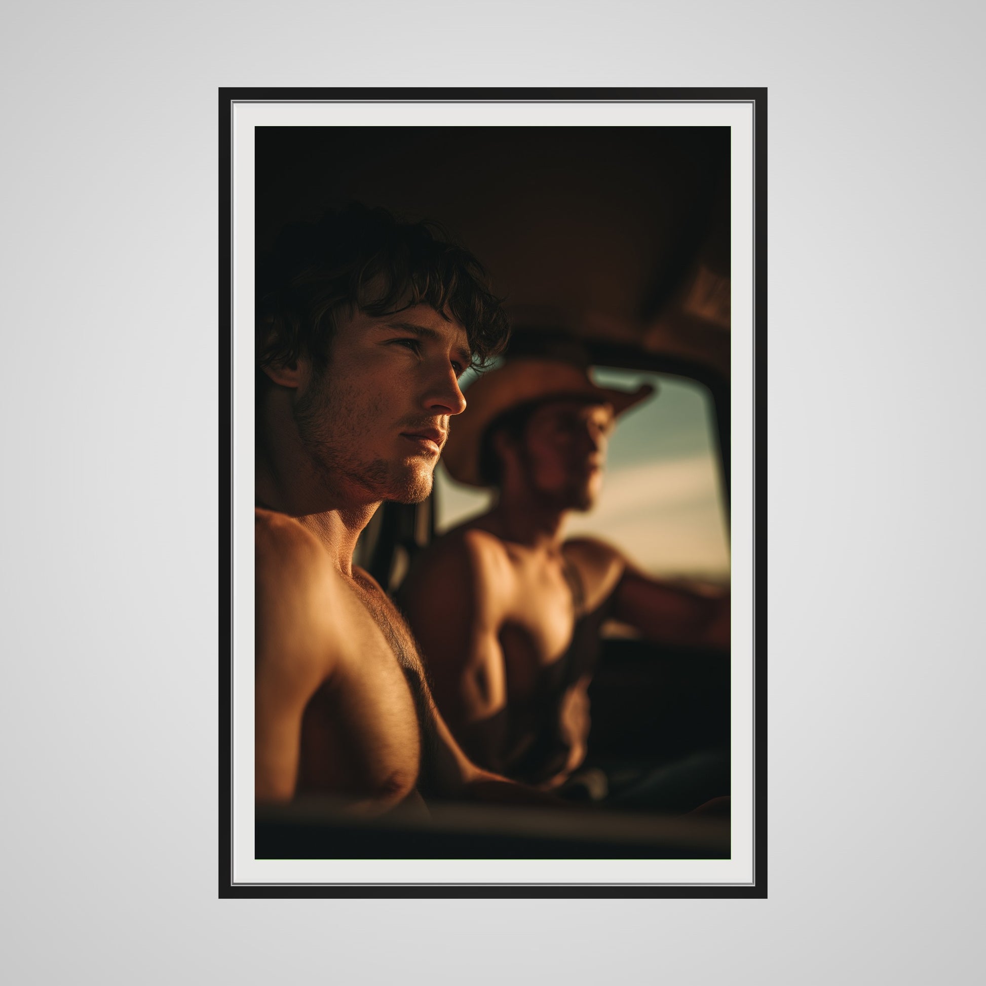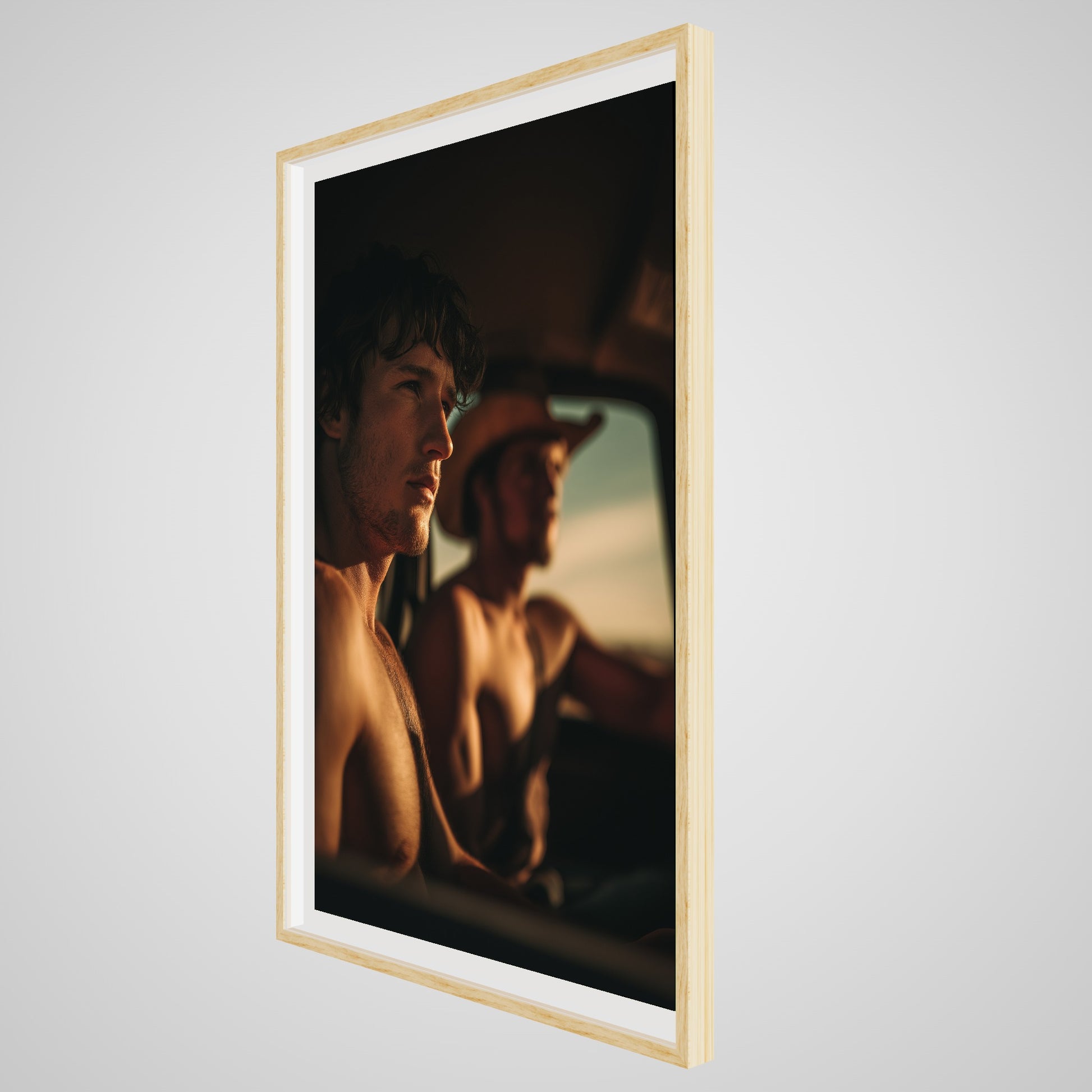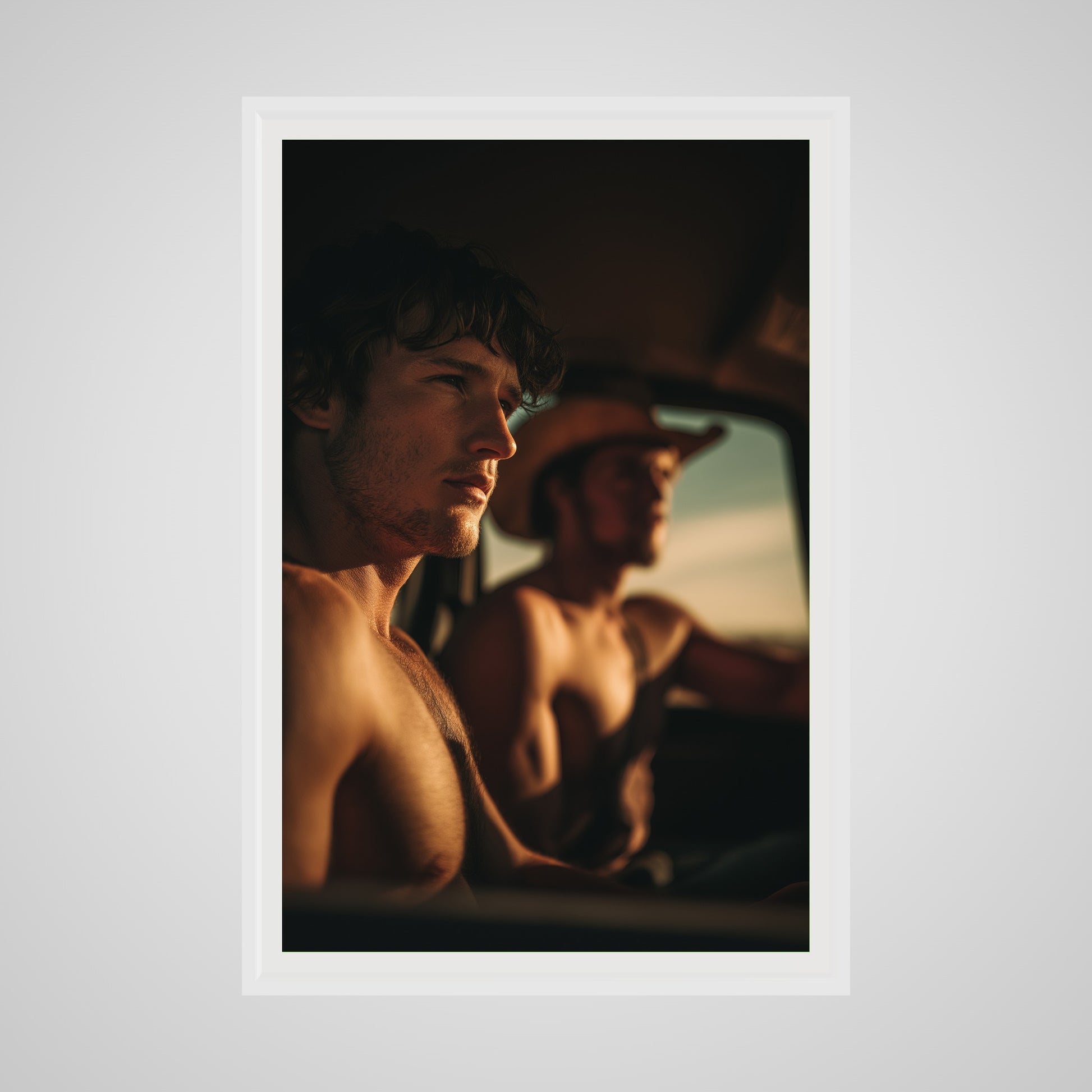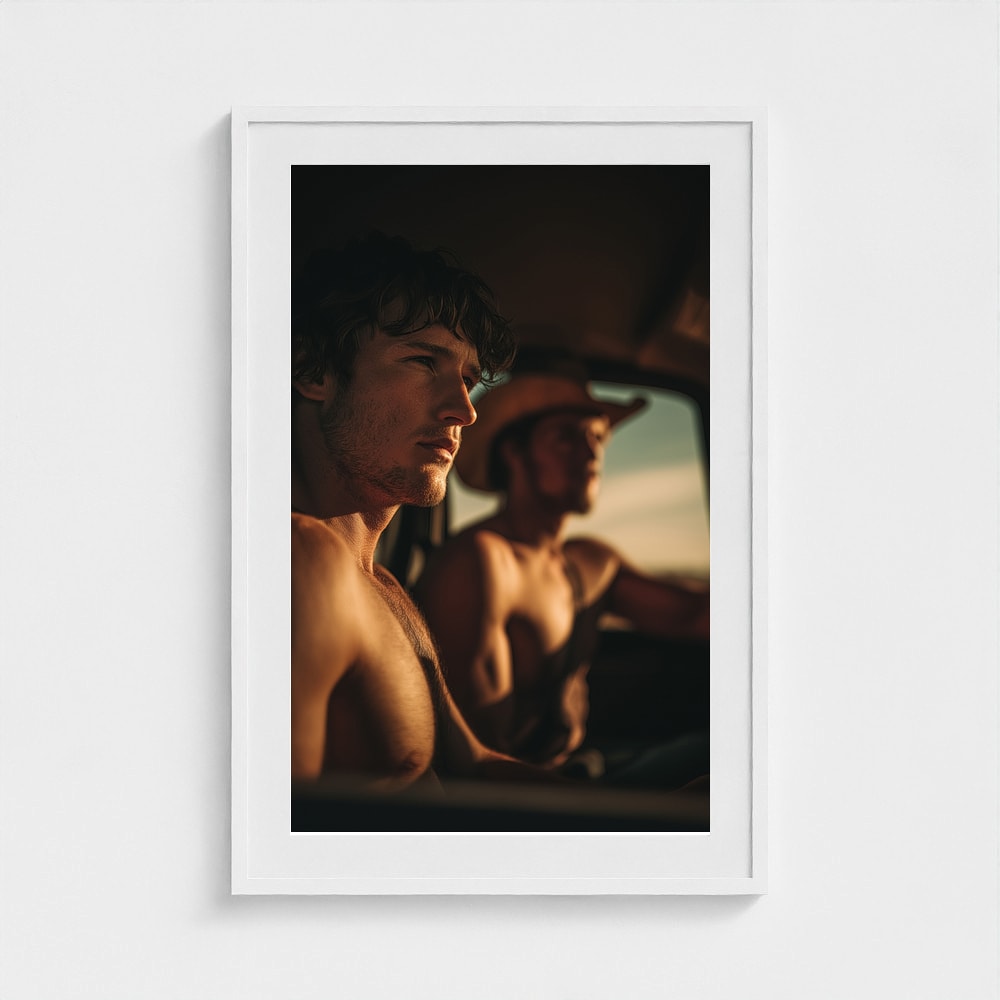 This contemporary portrait captures two men seated inside a pickup, illuminated by the soft pour of late-day sunlight. Warm, golden tones settle gently across skin, fabric, and glass, creating a suspended moment of introspective calm. The atmosphere feels intimate yet unforced, inviting the viewer into a quiet narrative of shared space, proximity, and unspoken connection.