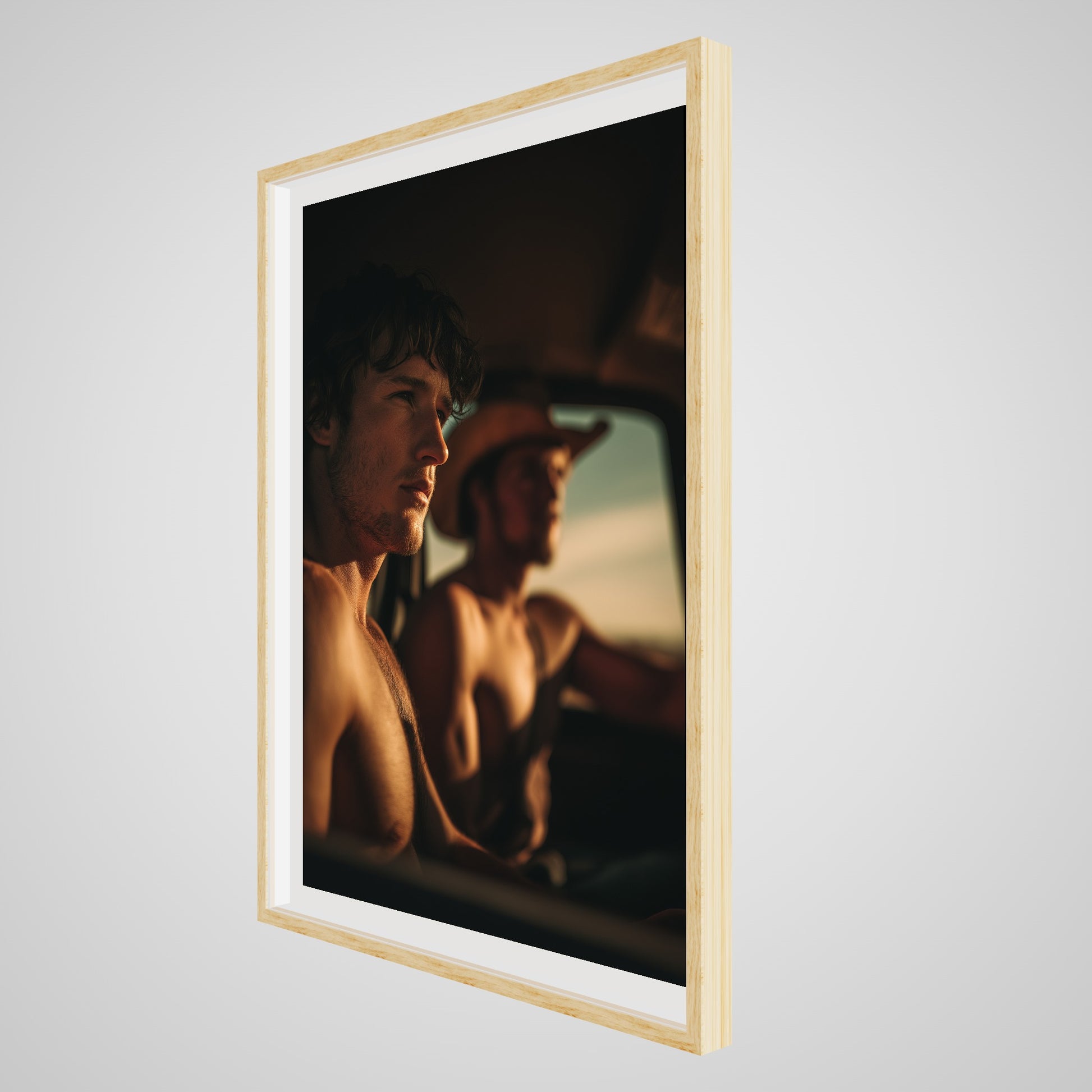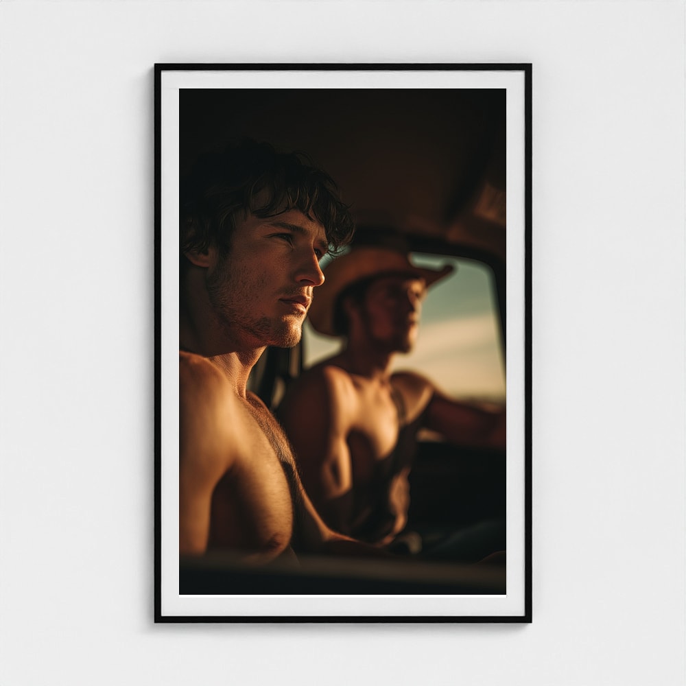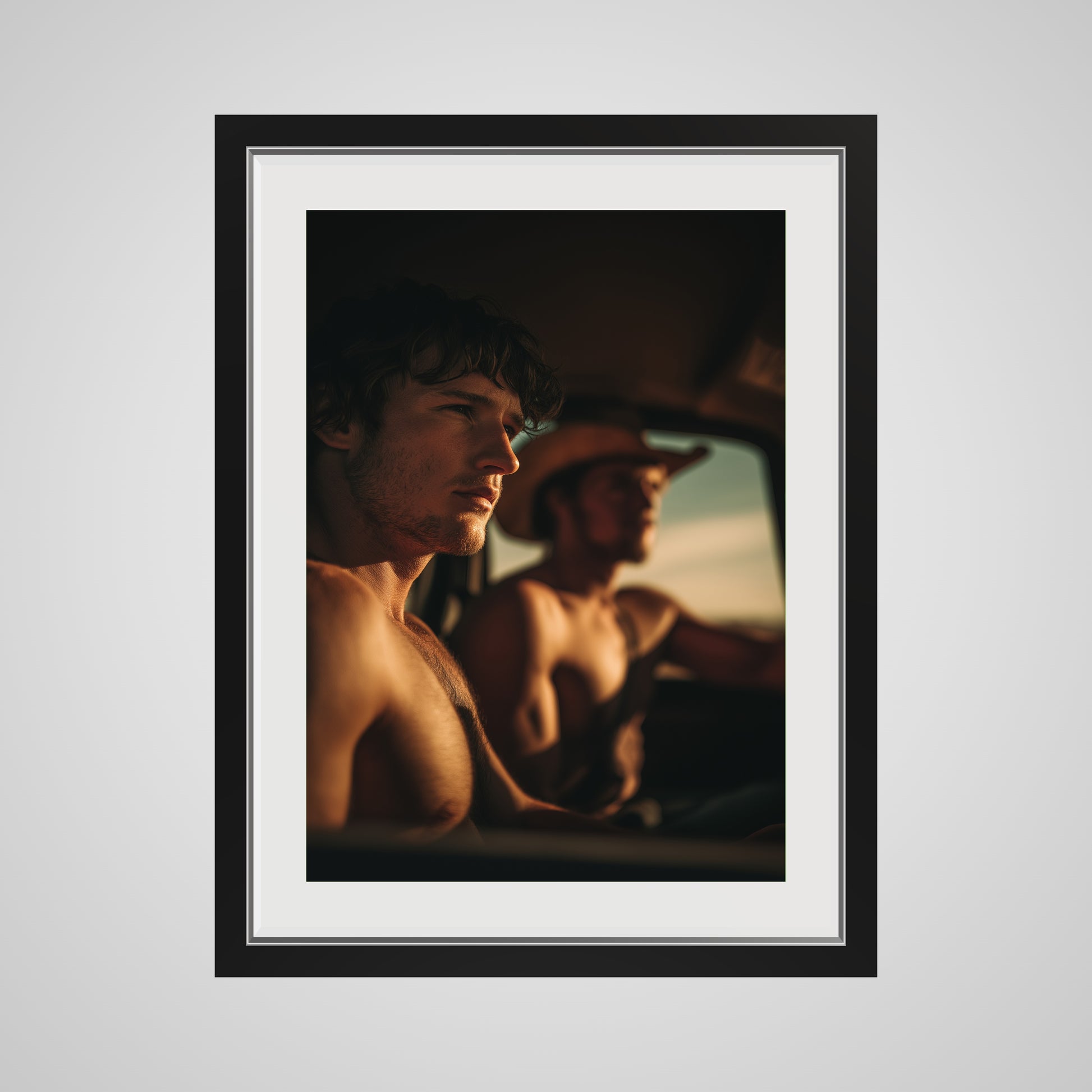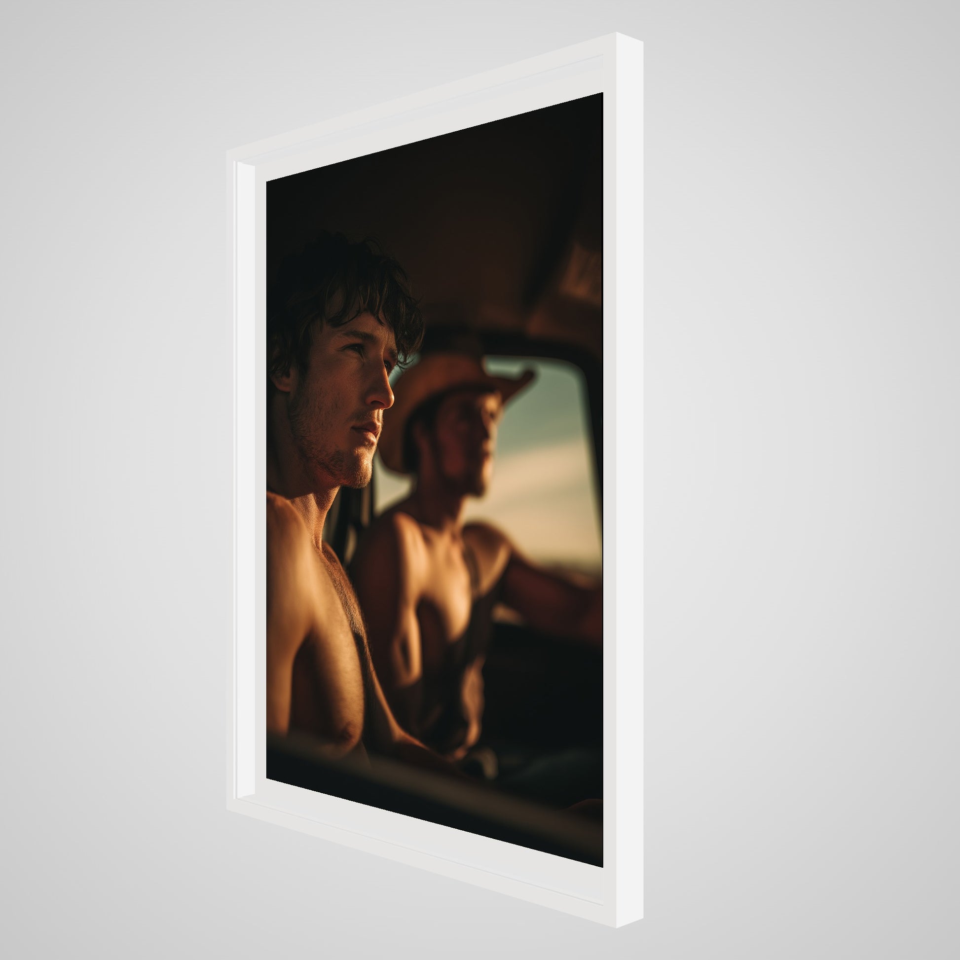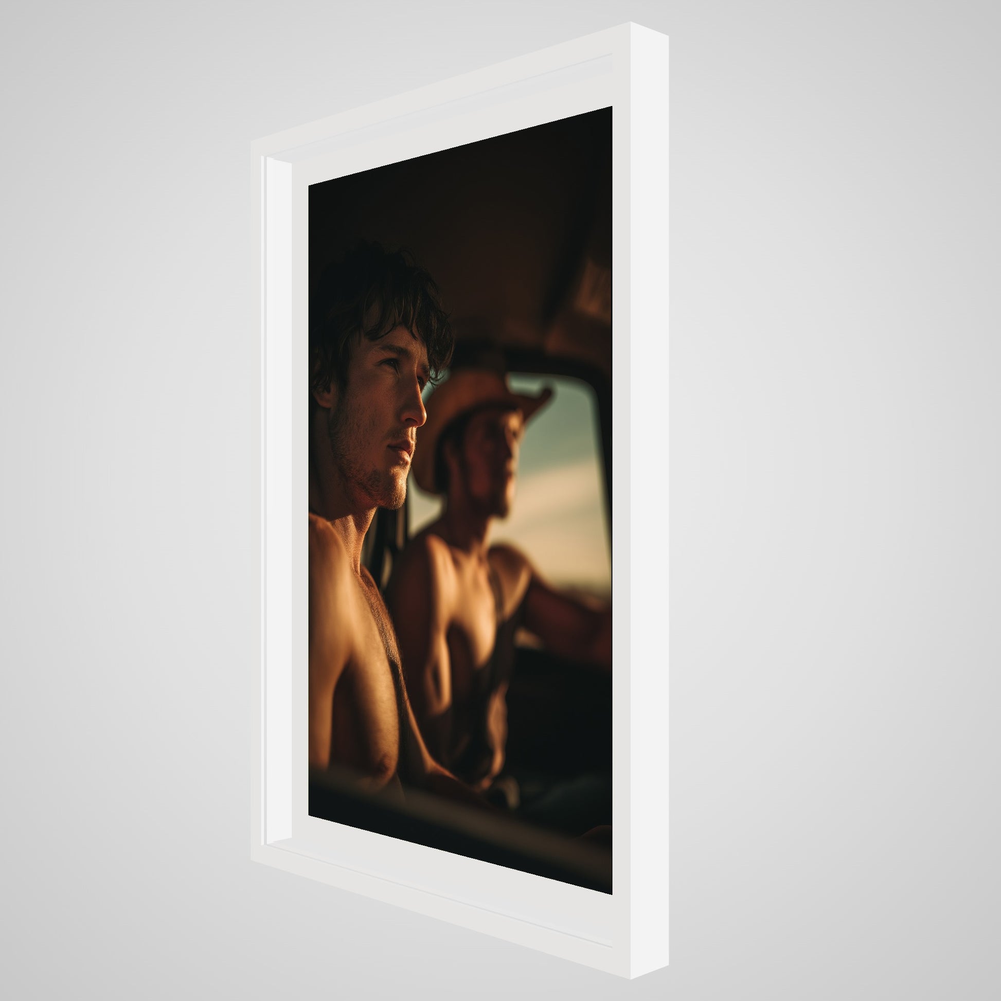 This contemporary portrait captures two men seated inside a pickup, illuminated by the soft pour of late-day sunlight. Warm, golden tones settle gently across skin, fabric, and glass, creating a suspended moment of introspective calm. The atmosphere feels intimate yet unforced, inviting the viewer into a quiet narrative of shared space, proximity, and unspoken connection.