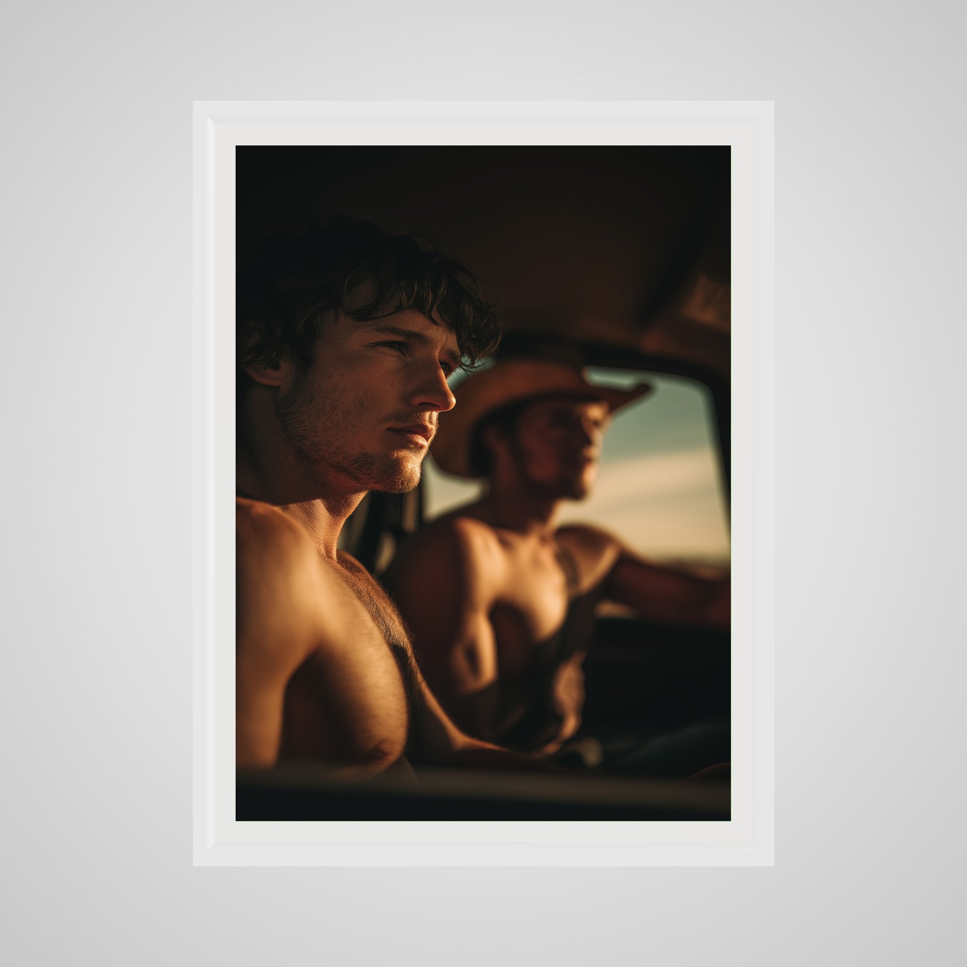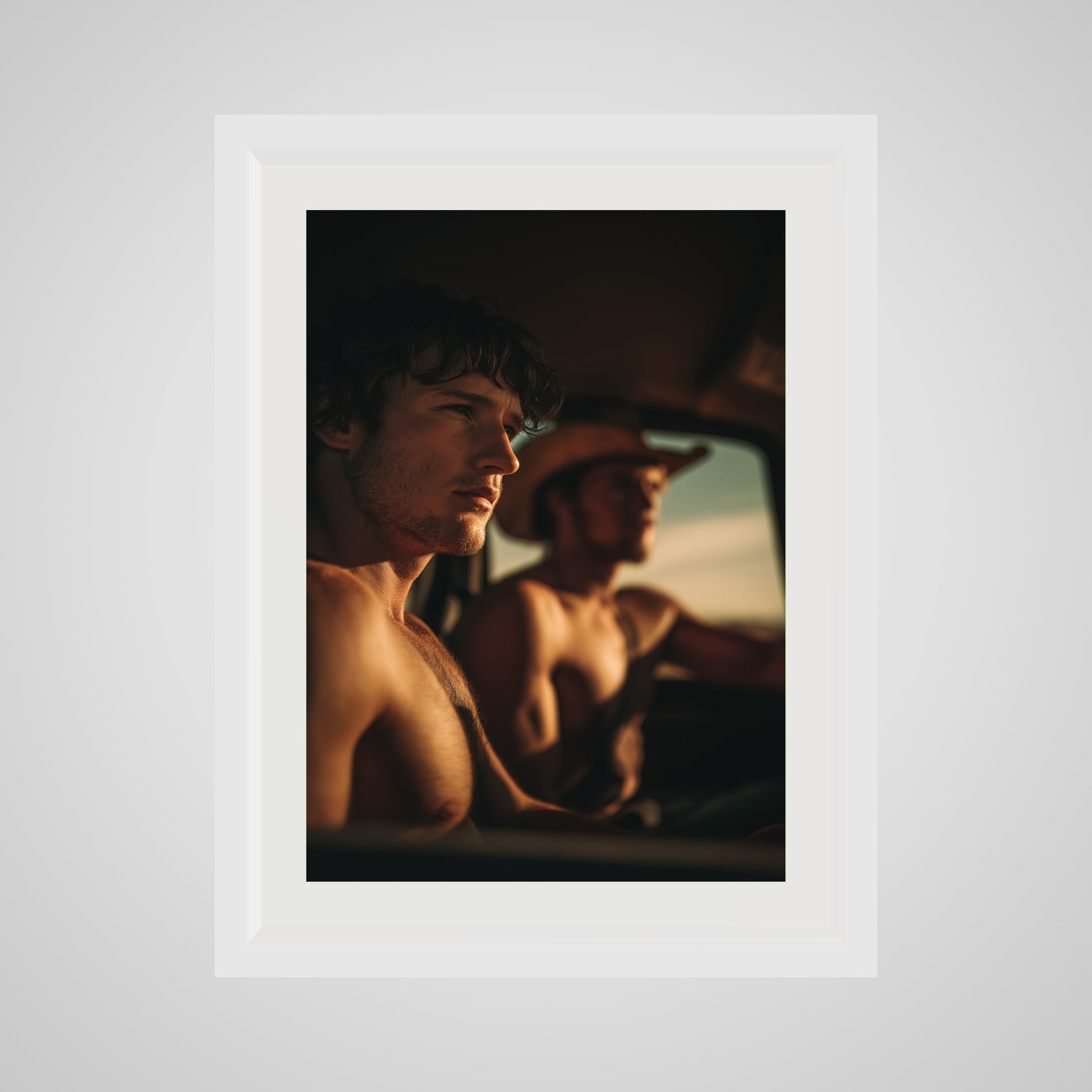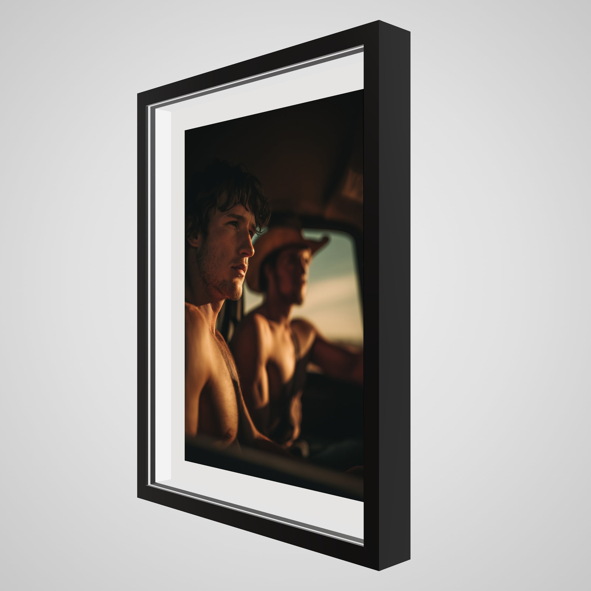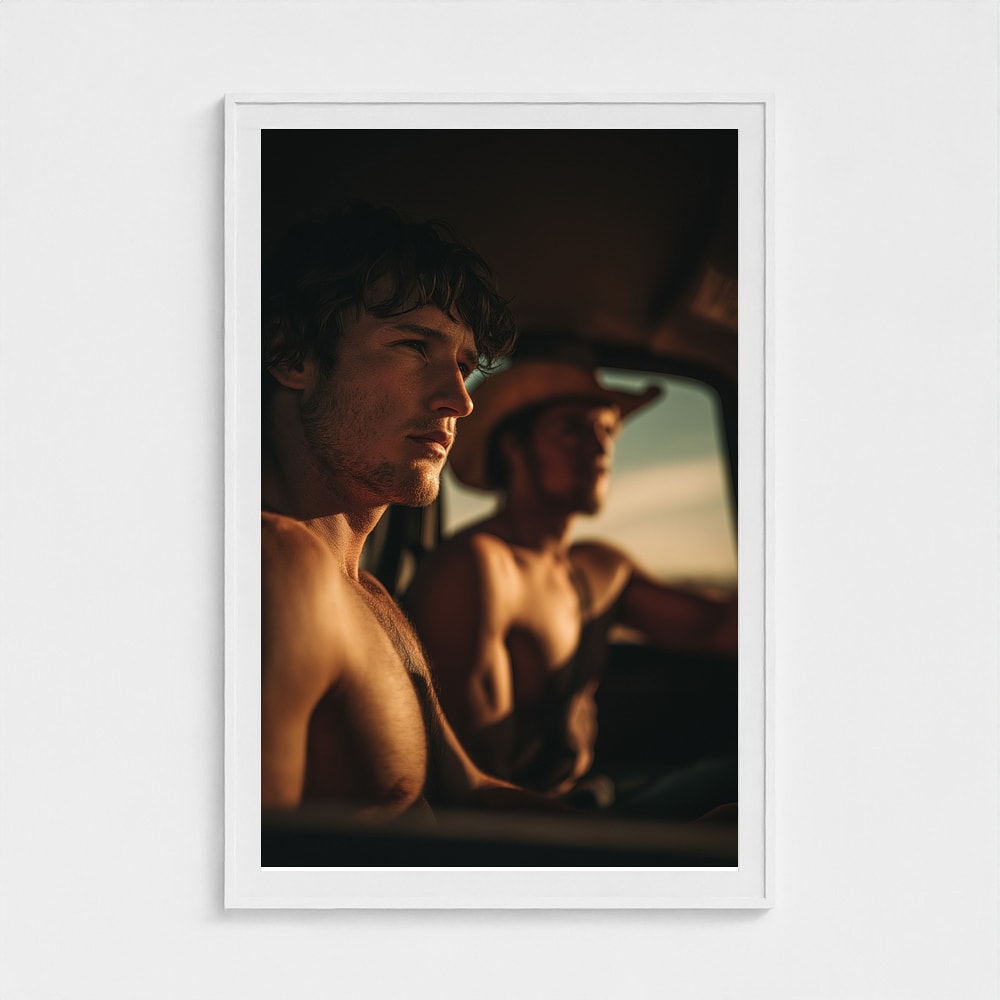 This contemporary portrait captures two men seated inside a pickup, illuminated by the soft pour of late-day sunlight. Warm, golden tones settle gently across skin, fabric, and glass, creating a suspended moment of introspective calm. The atmosphere feels intimate yet unforced, inviting the viewer into a quiet narrative of shared space, proximity, and unspoken connection.