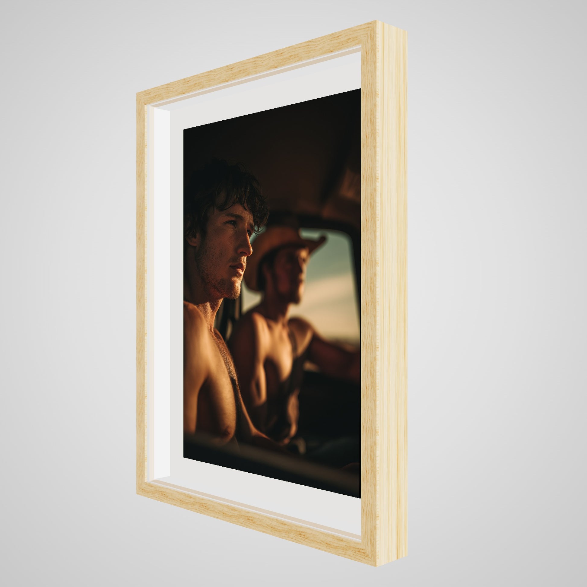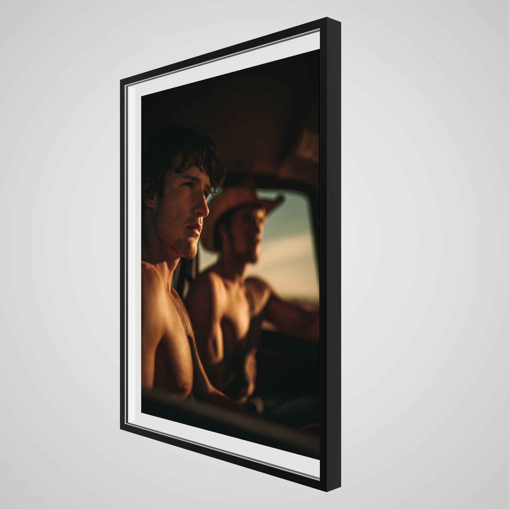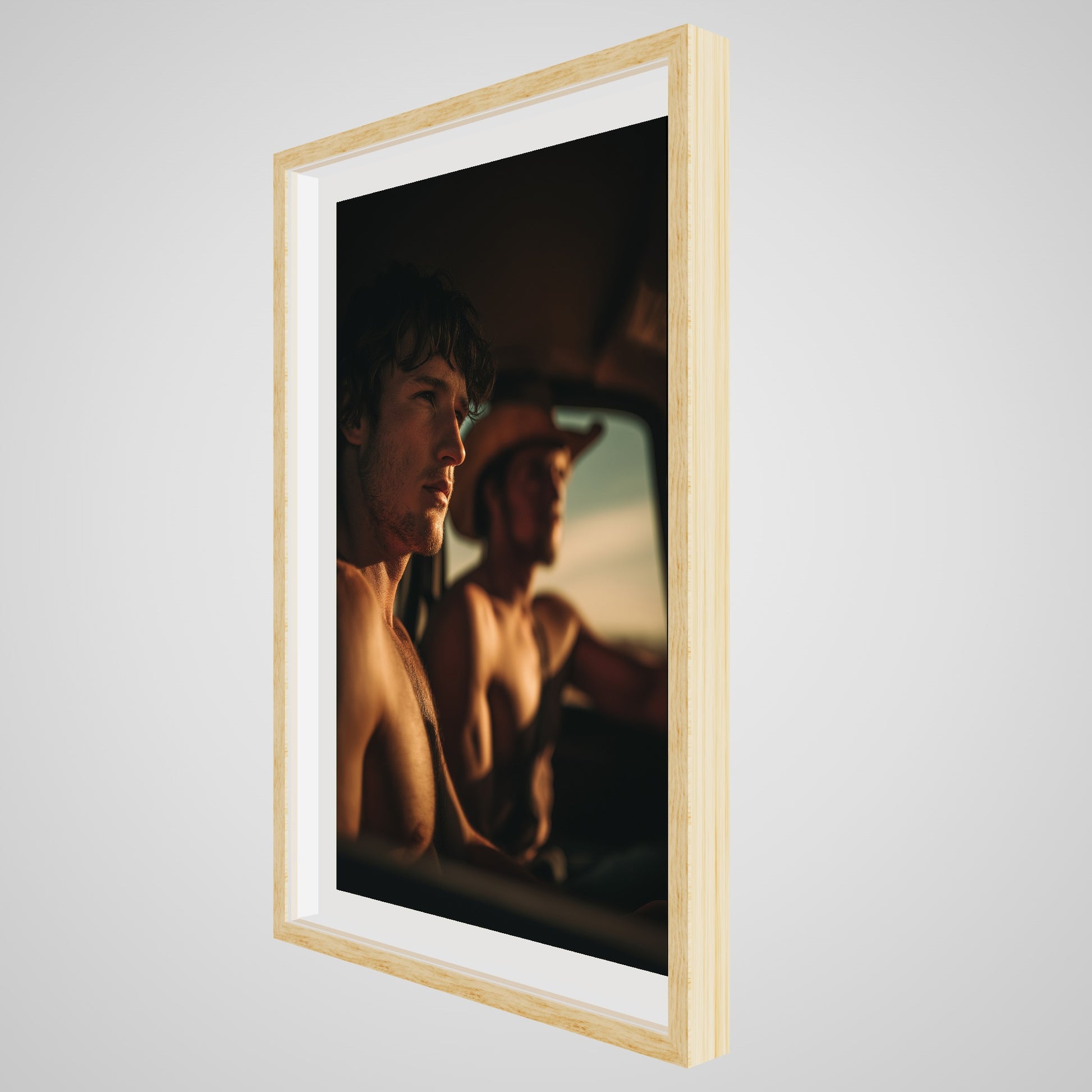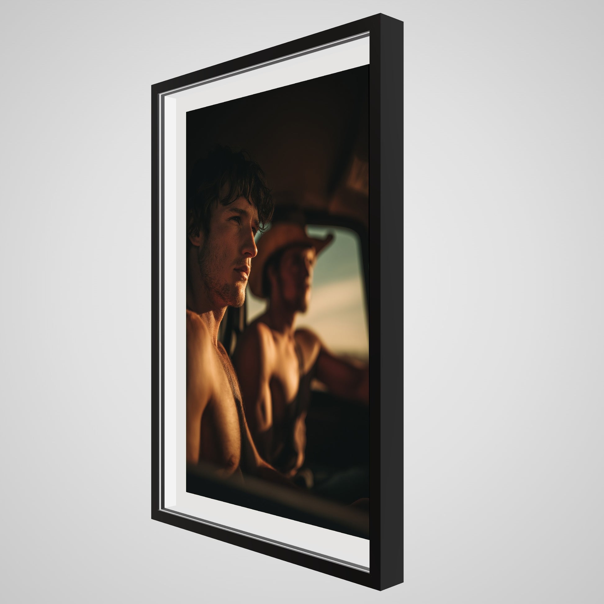 This framed artwork integrates seamlessly into interiors that value character-rich photography and understated emotional resonance. Its warm, tonal palette complements linen, oak, and matte black accents, making it well suited for a modern living room, reading nook, or study. In a hallway or bedroom, it functions as a contemplative focal point, subtly exploring themes of masculinity, companionship, and quiet transit.