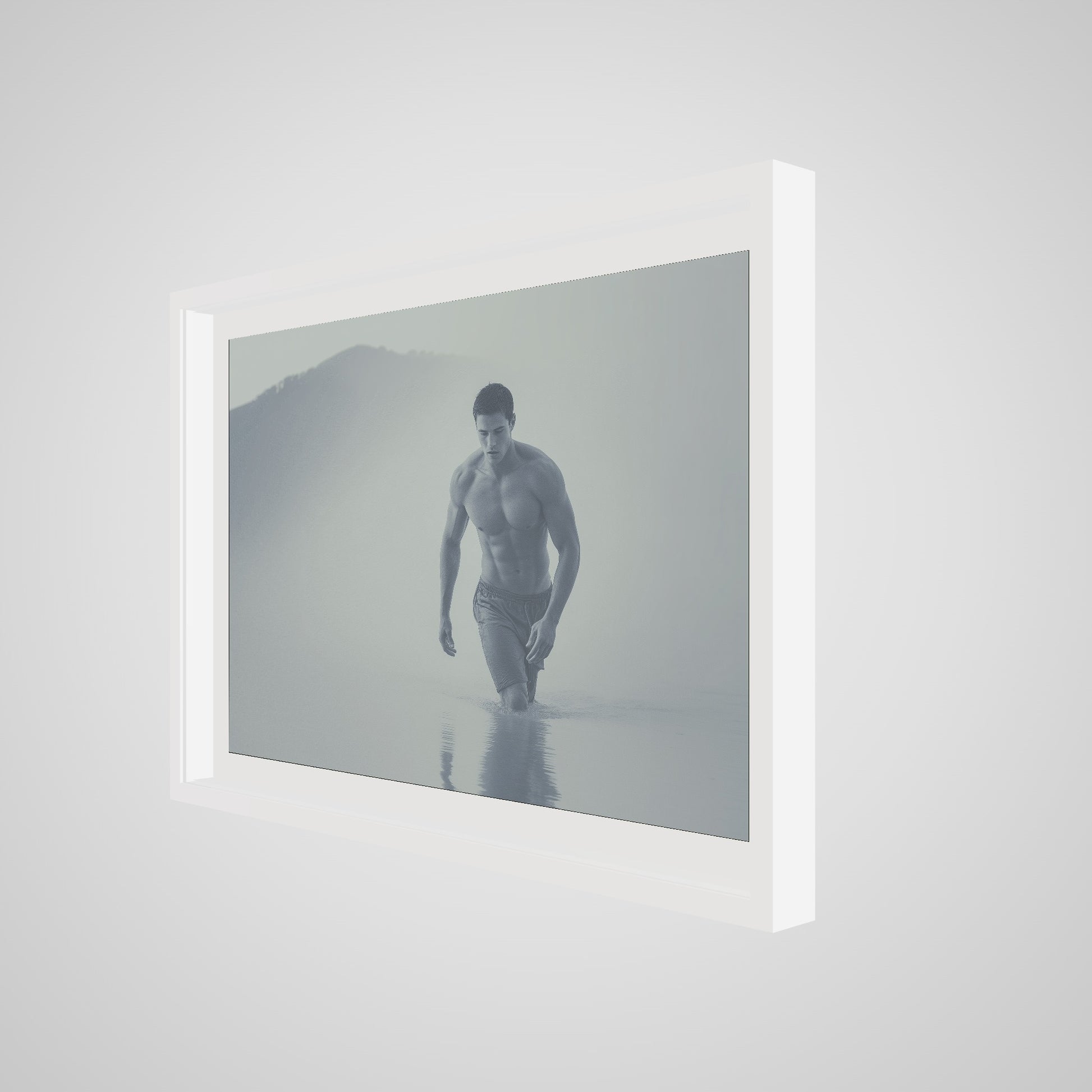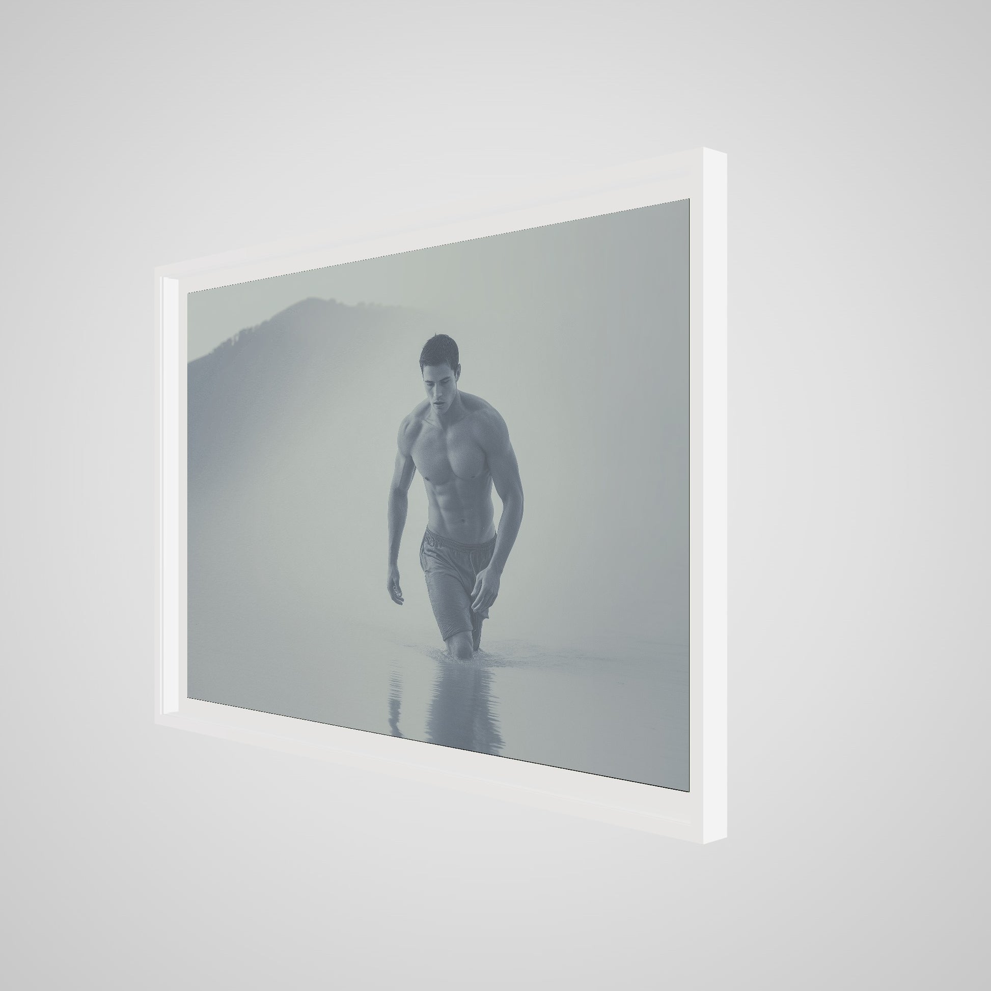 The composition centers the figure in mid-stride, allowing water, light, and body to interact with minimal distraction. Fabric clings lightly to the skin, offering subtle texture while the controlled palette enhances the sculptural reading of the torso. Balanced asymmetry and generous negative space guide the viewer’s eye from shoulder to spine, inviting a slow, lingering look. The understated contemplativeity and coastal stillness give the portrait a gentle queer-coded charge—never explicit, always intentional.