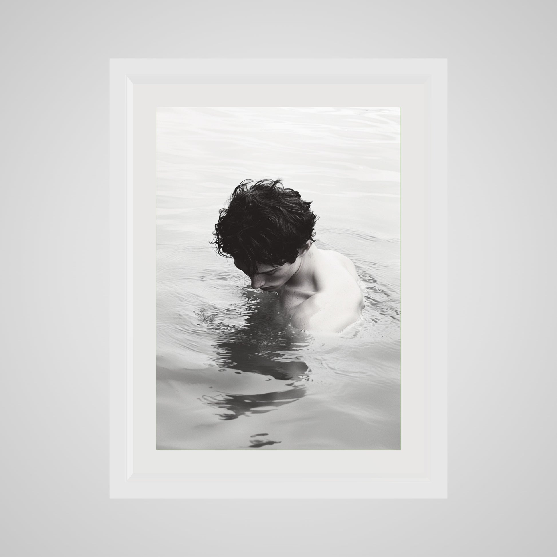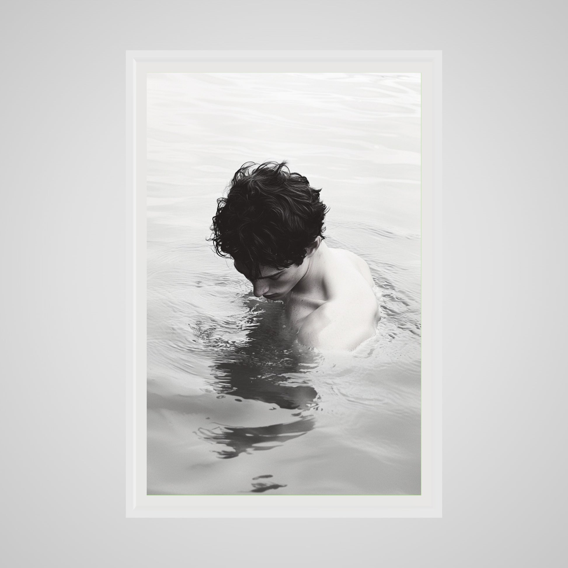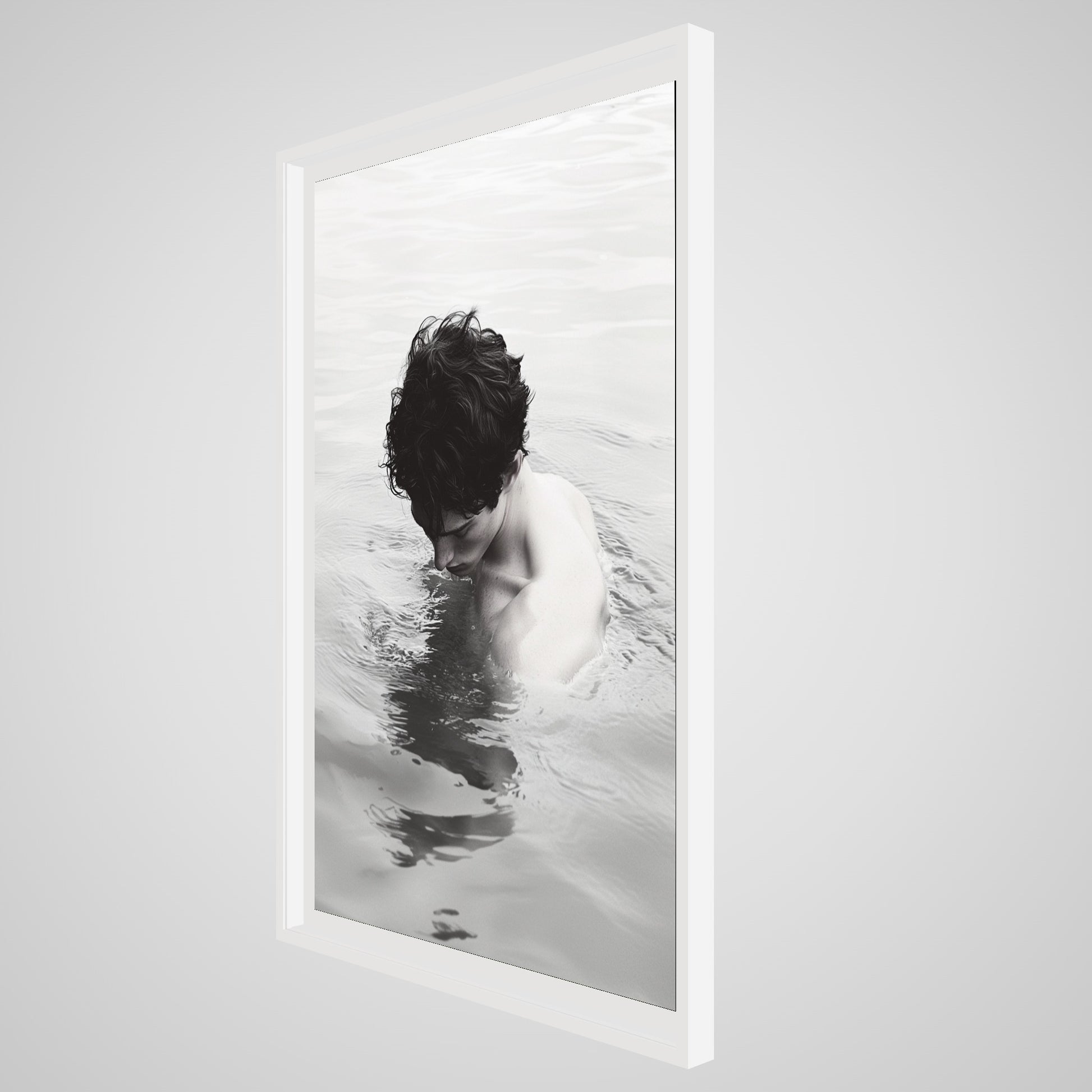 This portrait presents the back of a man standing waist-deep in still water, his body held in quiet suspension. The surface of the water softens the scene, blurring the boundary between body and environment. Muted tones and minimal contrast draw attention to posture, skin, and the line of the shoulders rather than facial detail. The image reads as intimate through distance, inviting a slow, deliberate gaze.