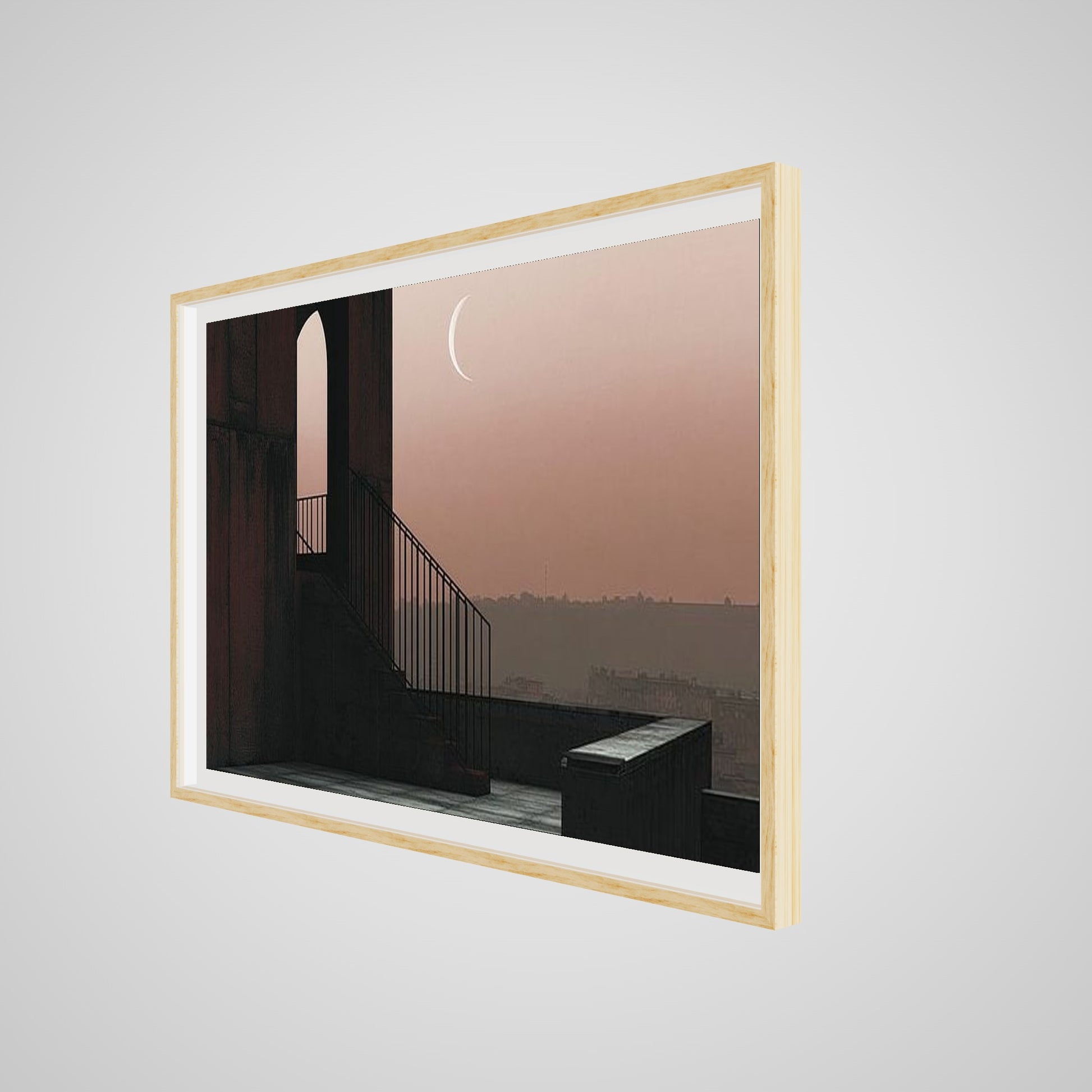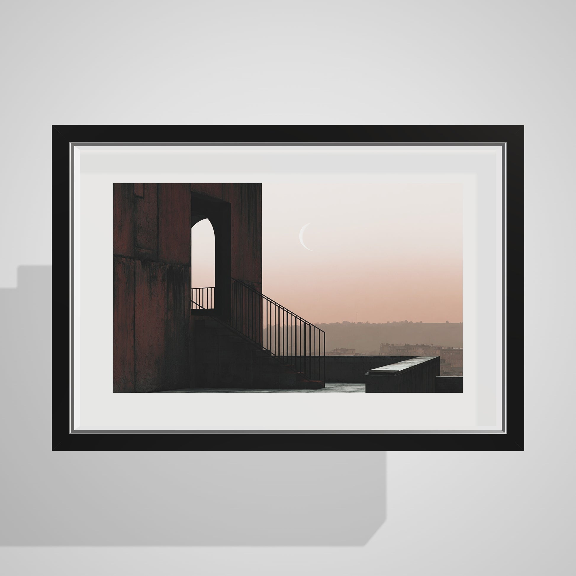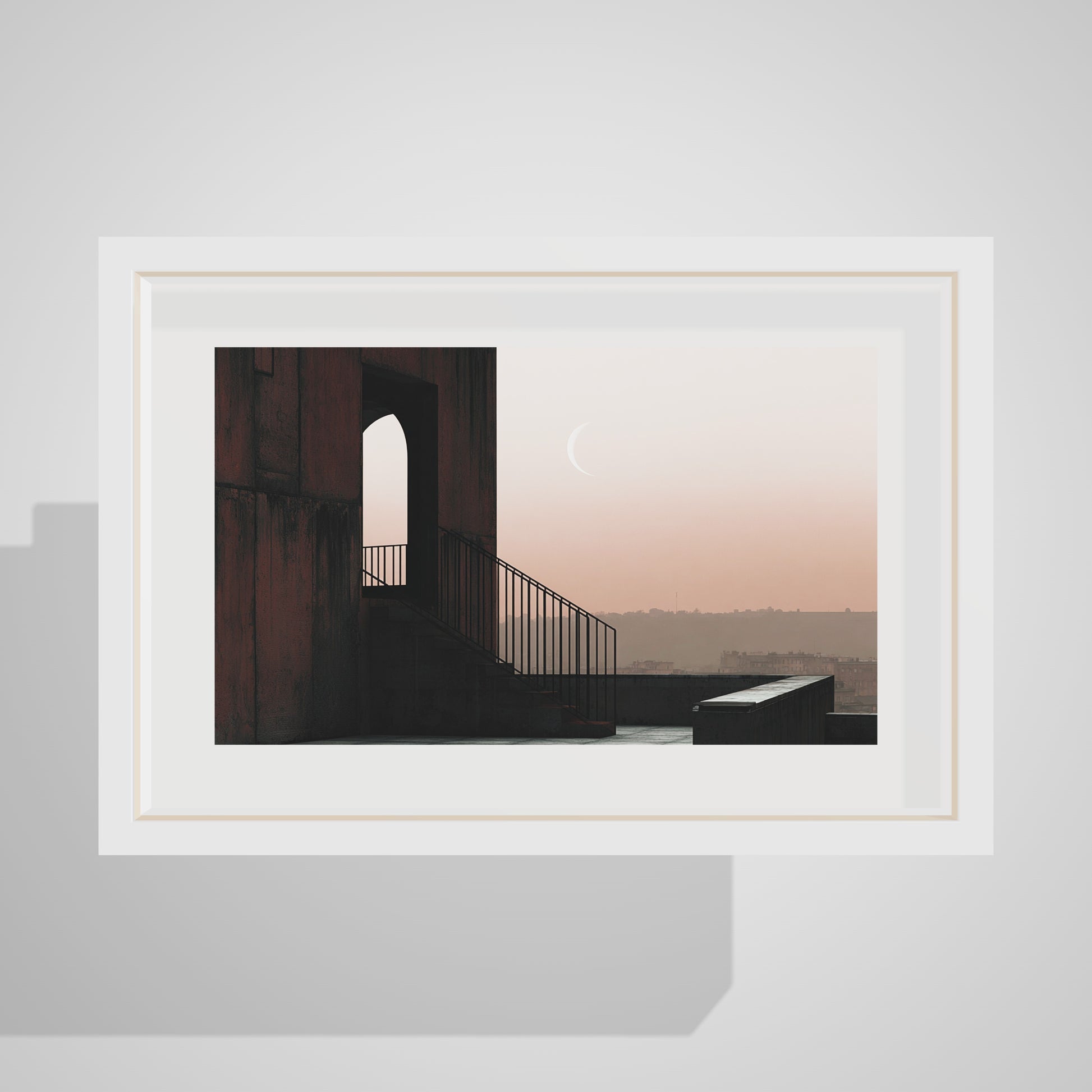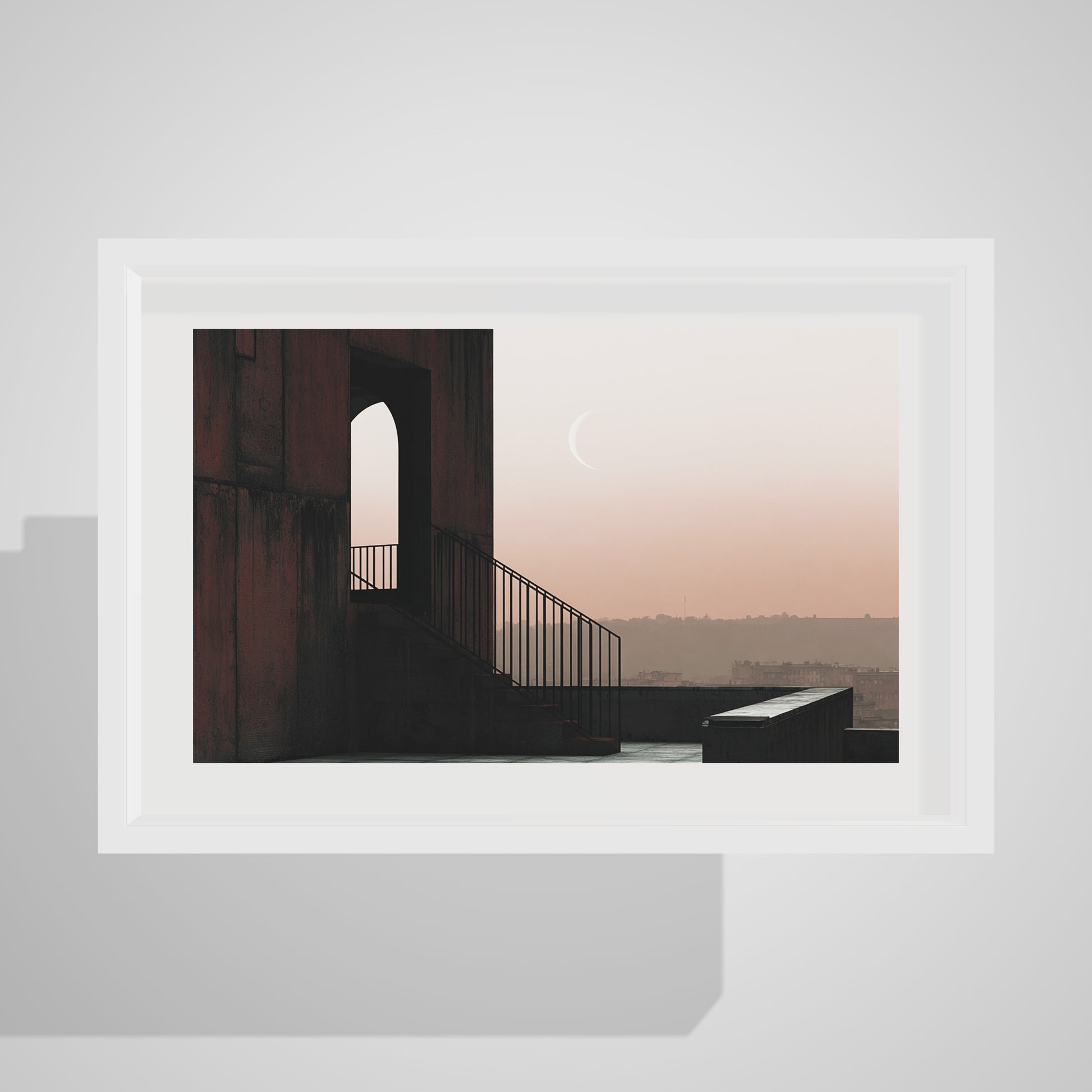 This minimalist architectural study captures a quiet rooftop moment suspended between day and night. A silhouetted exterior staircase and arched doorway rise against a muted, dusky pink sky, where a liminal crescent moon hovers at dusk—a fleeting astronomical moment rendered with quiet precision. While the alignment is rare, the image captures an authentic celestial phenomenon distilled into an idealized stillness. Soft, atmospheric light shapes the composition, grounding the scene in contemplative calm and making it a striking focal point for sophisticated interiors.