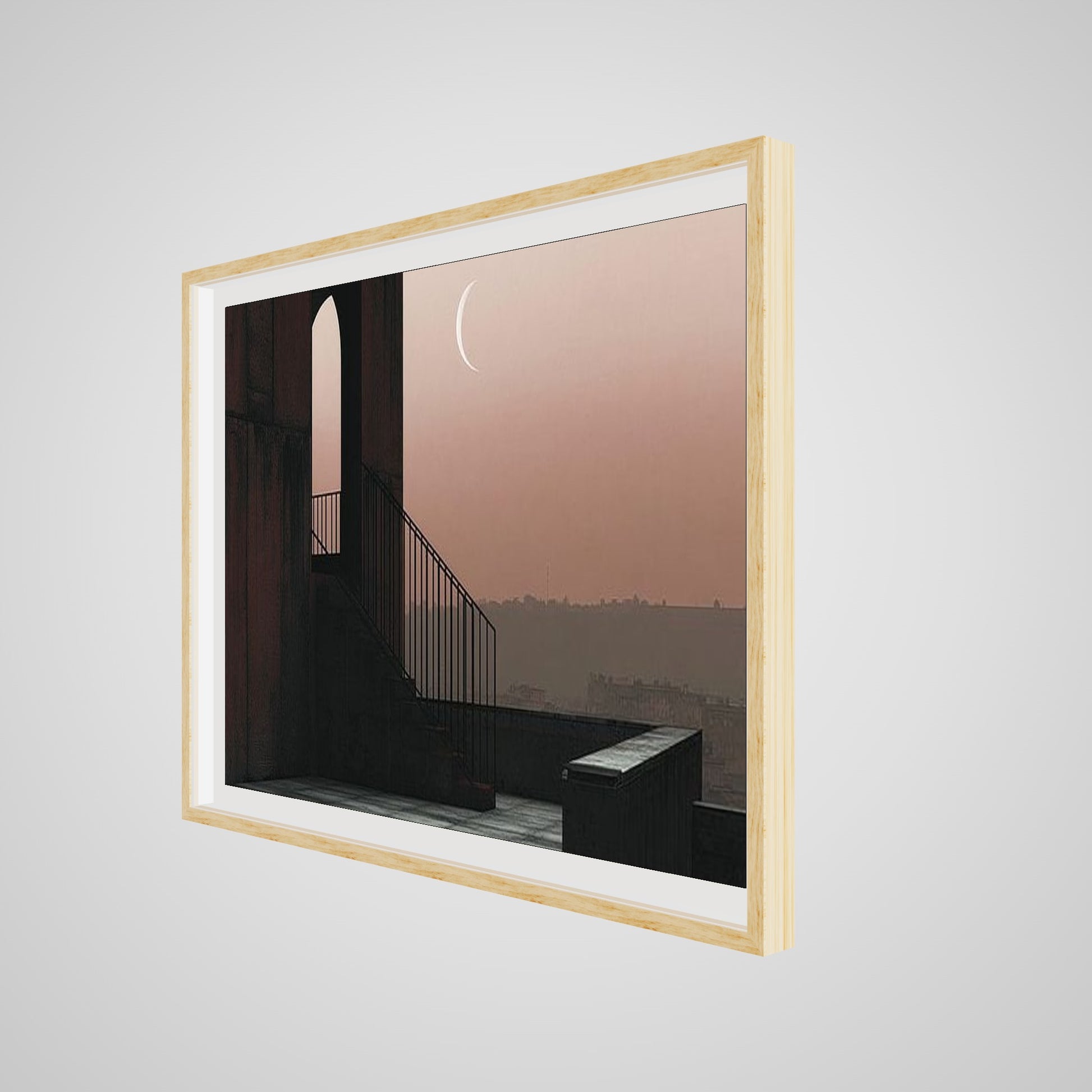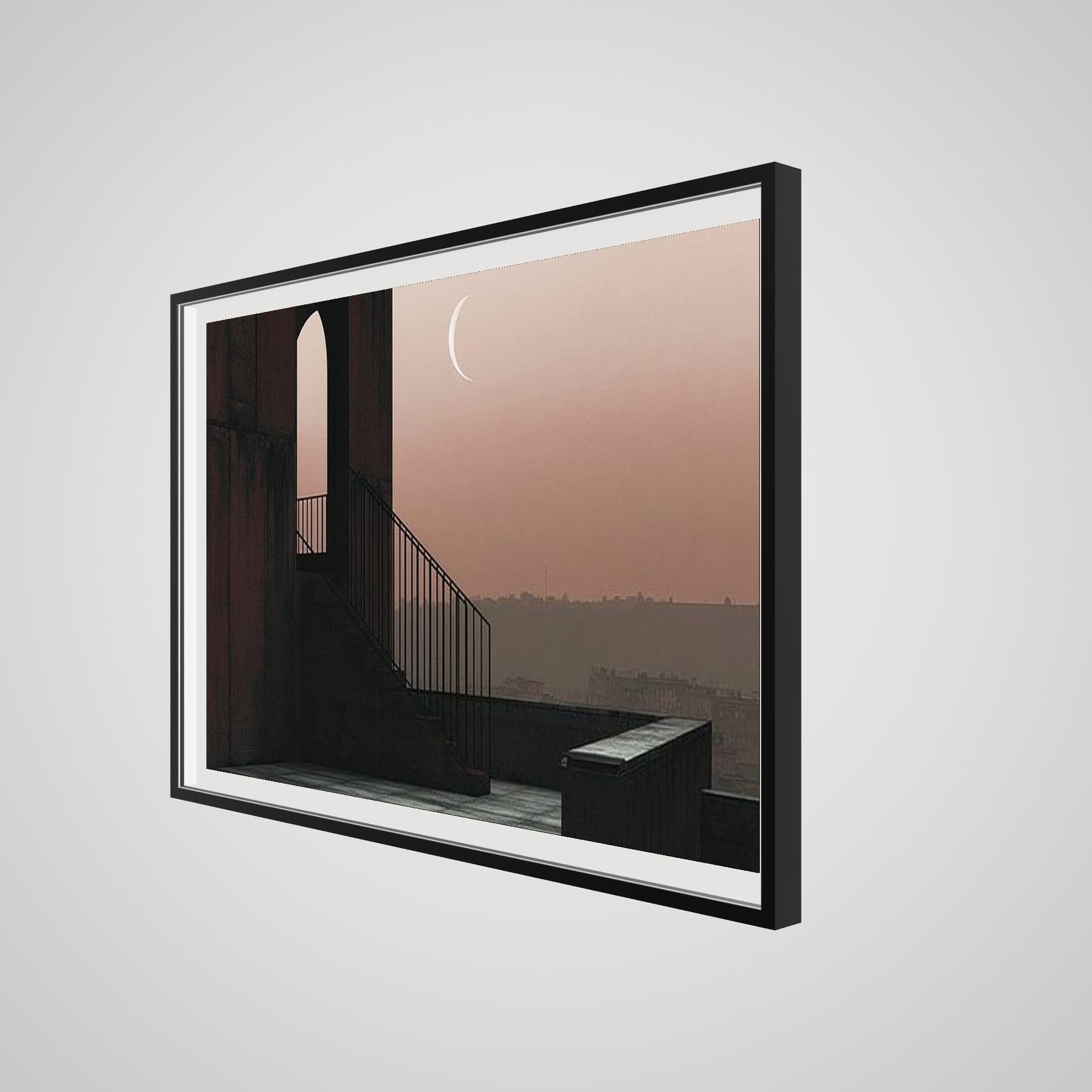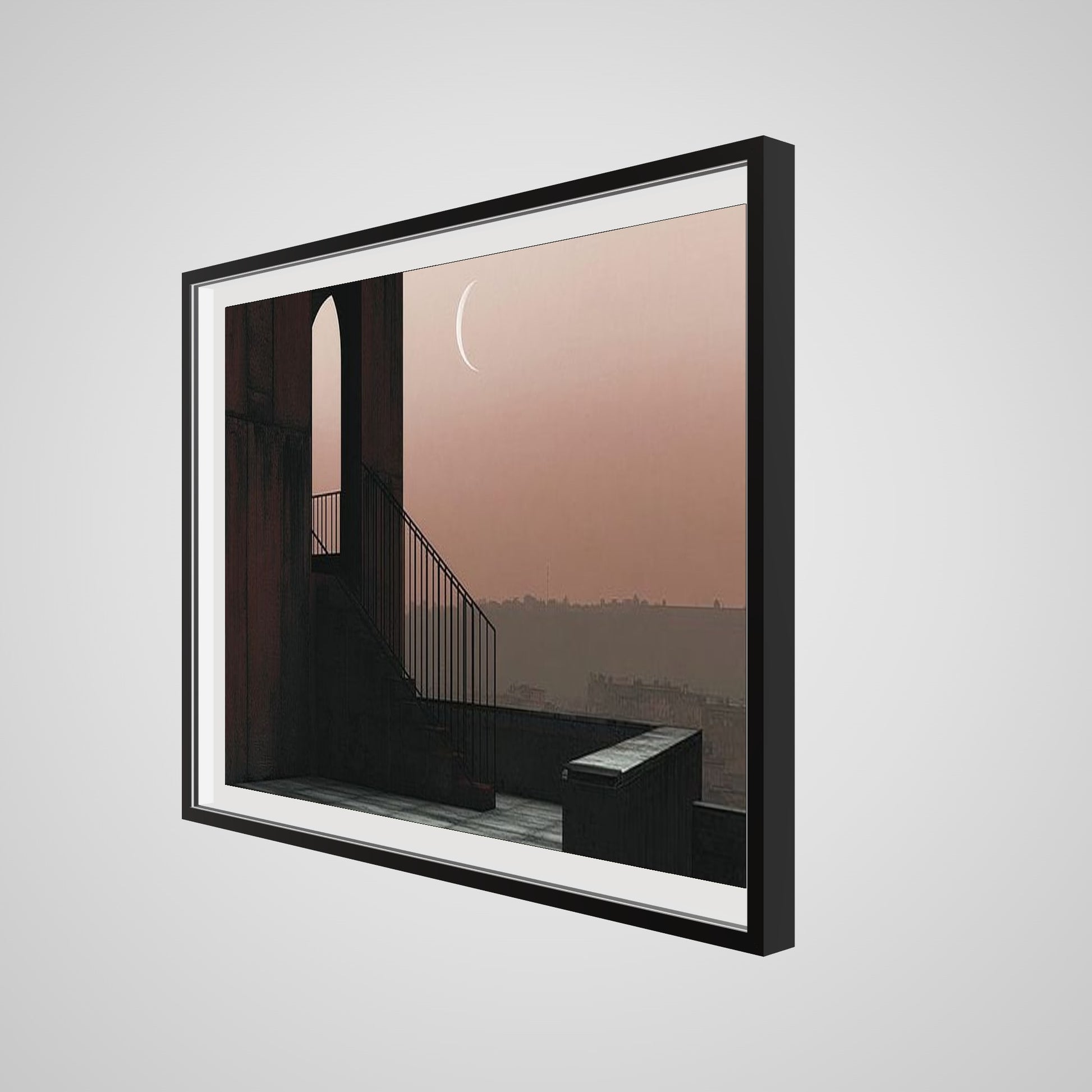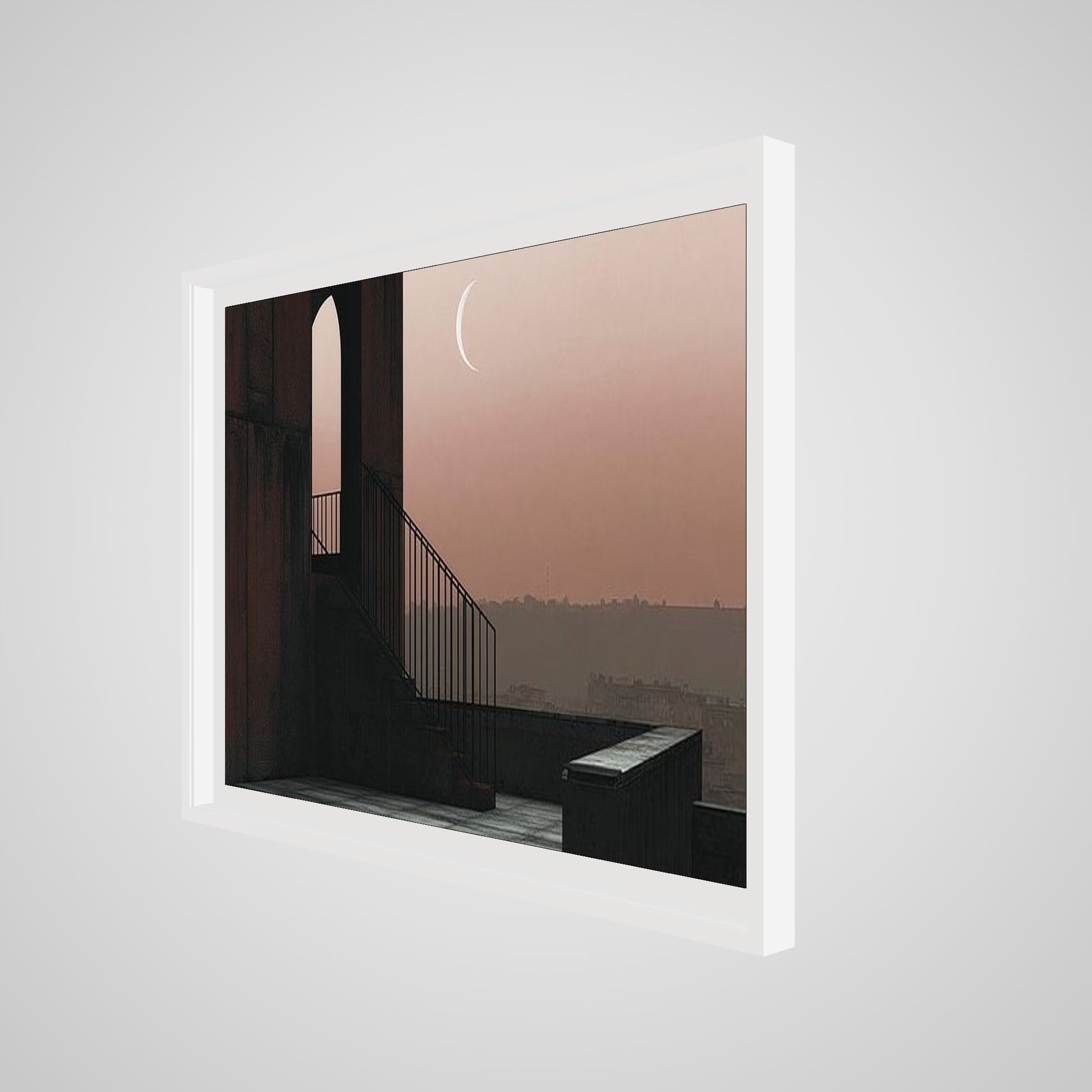 This minimalist architectural study captures a quiet rooftop moment suspended between day and night. A silhouetted exterior staircase and arched doorway rise against a muted, dusky pink sky, where a liminal crescent moon hovers at dusk—a fleeting astronomical moment rendered with quiet precision. While the alignment is rare, the image captures an authentic celestial phenomenon distilled into an idealized stillness. Soft, atmospheric light shapes the composition, grounding the scene in contemplative calm and making it a striking focal point for sophisticated interiors.