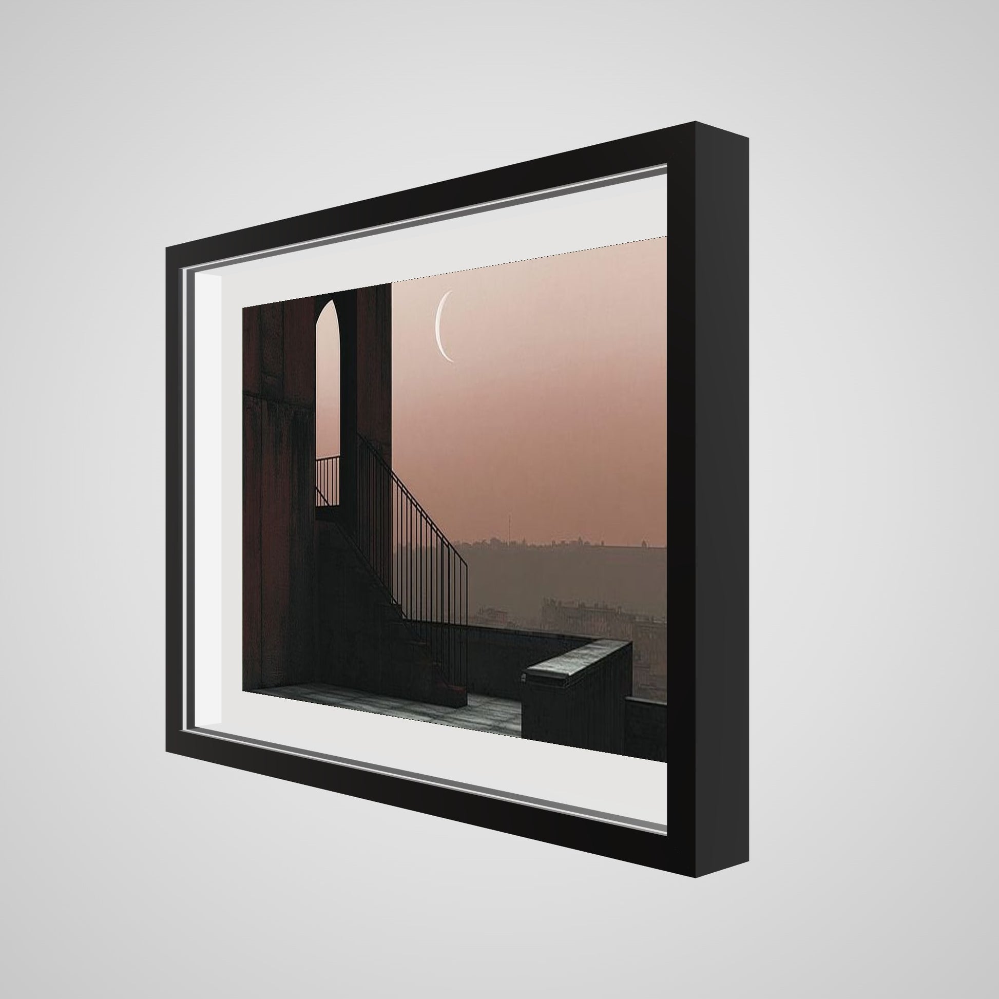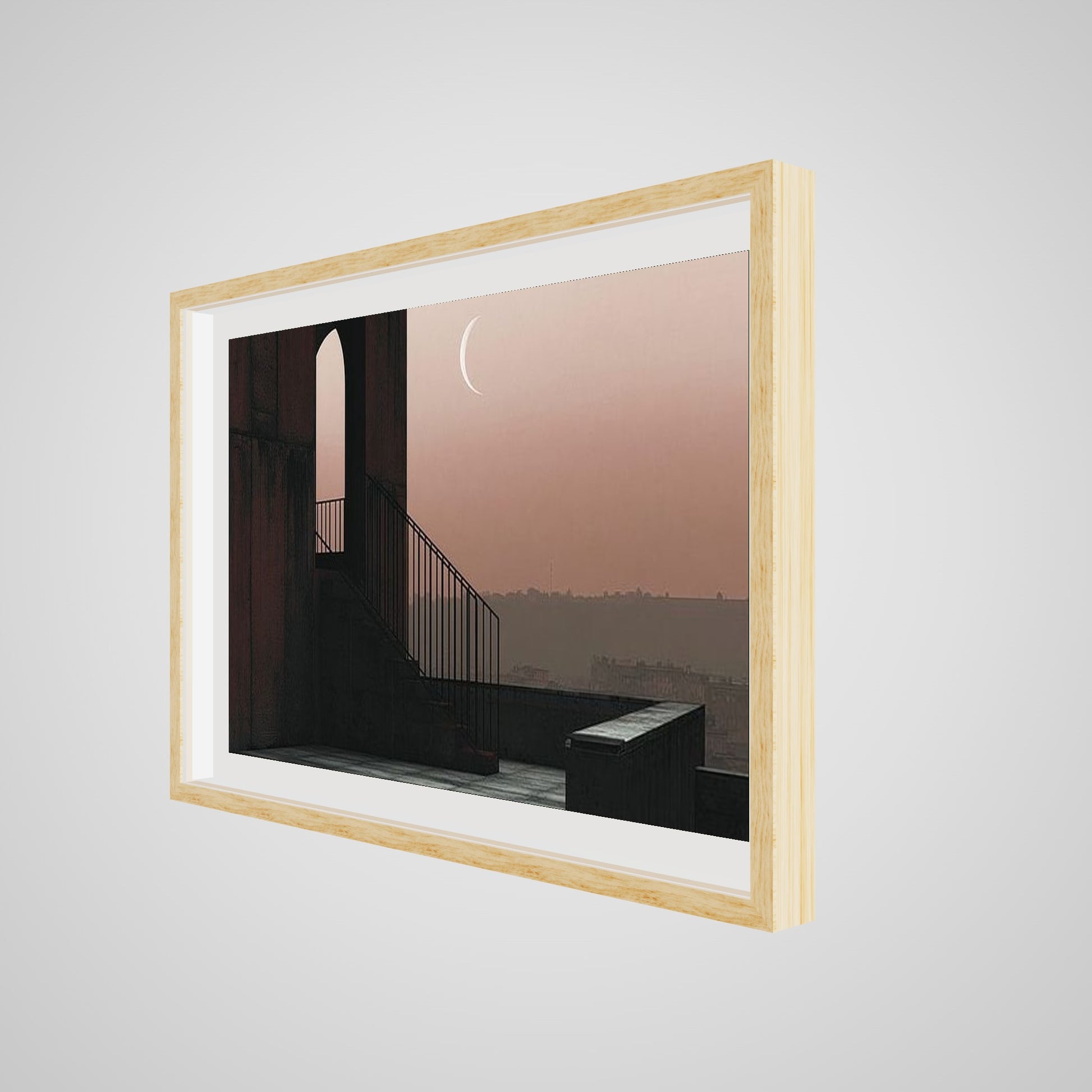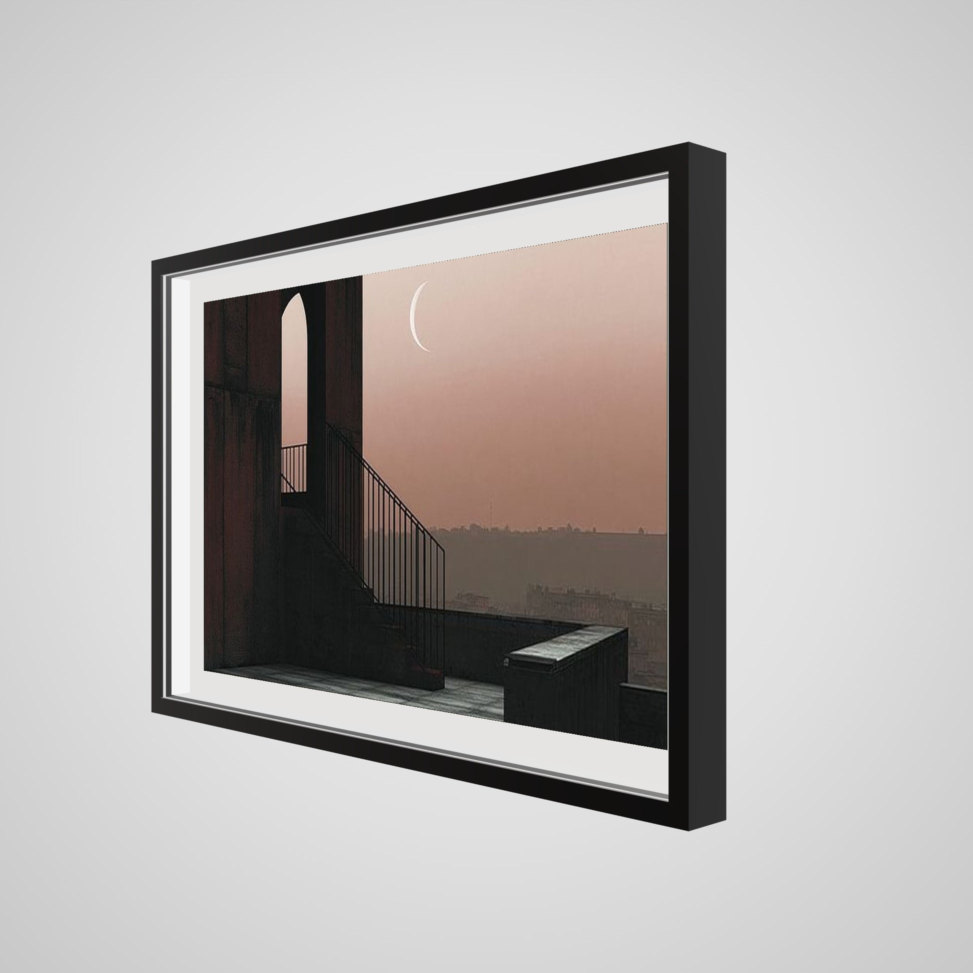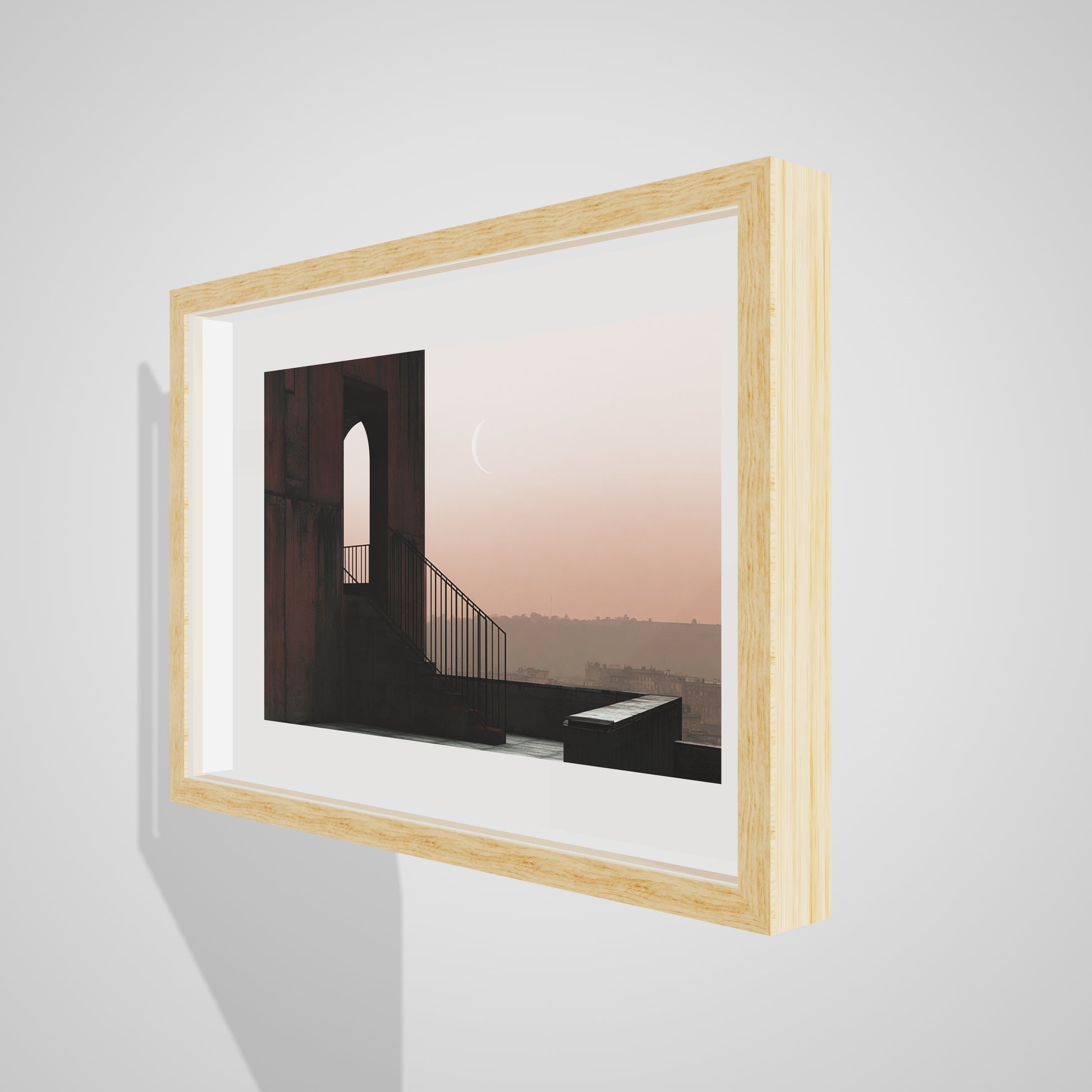This minimalist architectural study captures a quiet rooftop moment suspended between day and night. A silhouetted exterior staircase and arched doorway rise against a muted, dusky pink sky, where a liminal crescent moon hovers at dusk—a fleeting astronomical moment rendered with quiet precision. While the alignment is rare, the image captures an authentic celestial phenomenon distilled into an idealized stillness. Soft, atmospheric light shapes the composition, grounding the scene in contemplative calm and making it a striking focal point for sophisticated interiors.