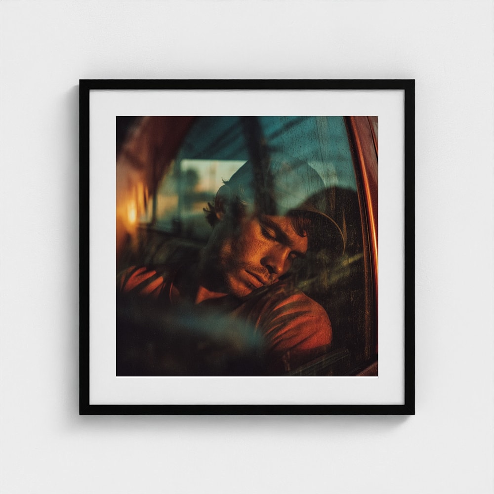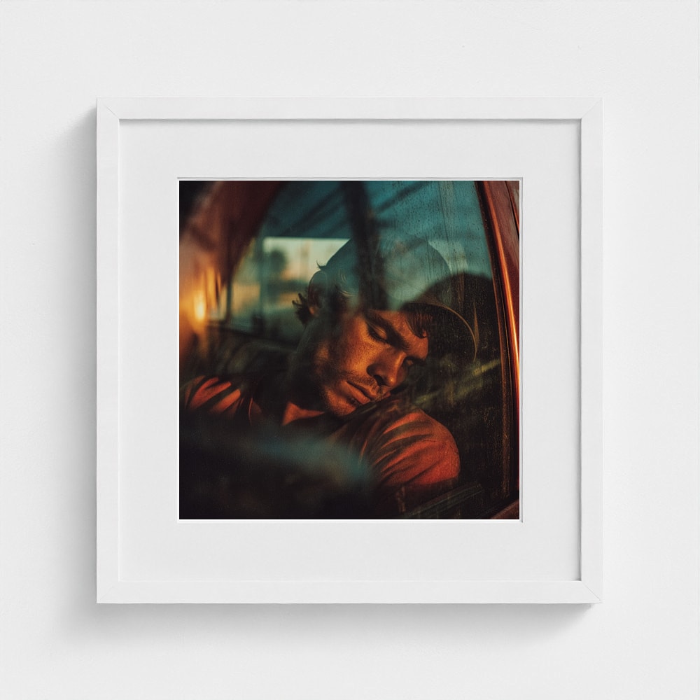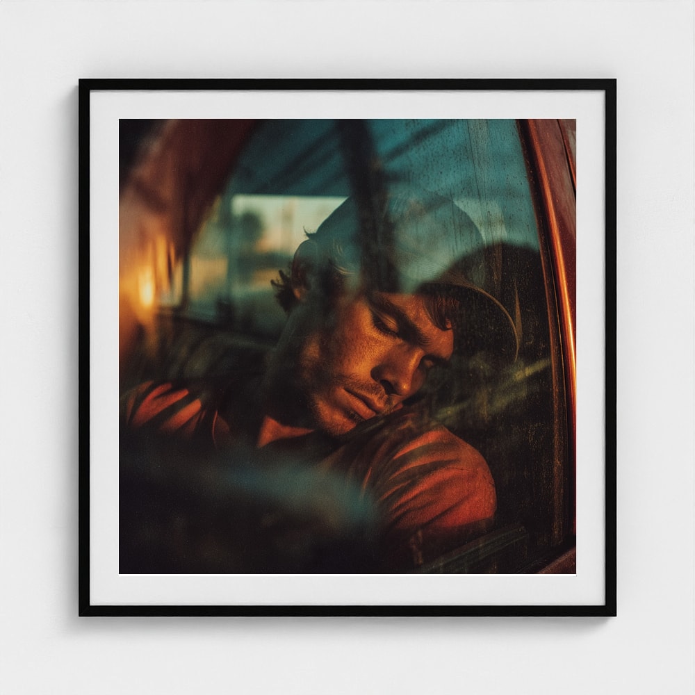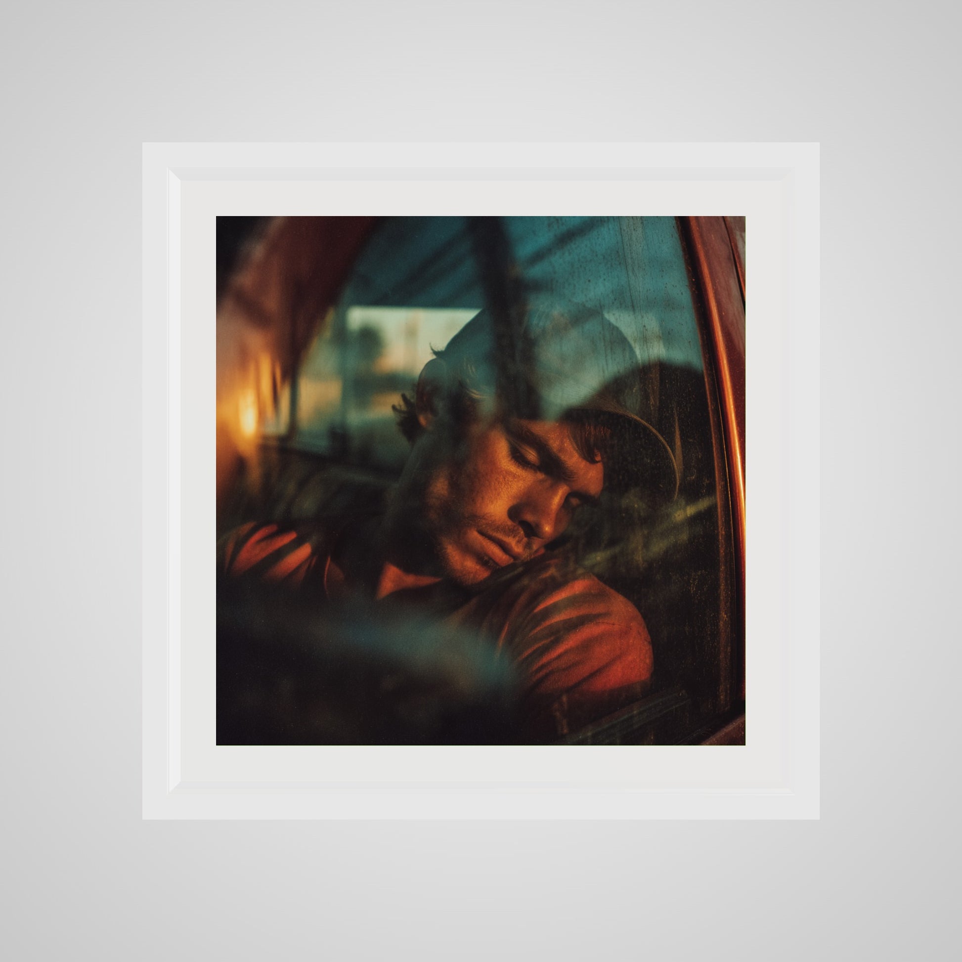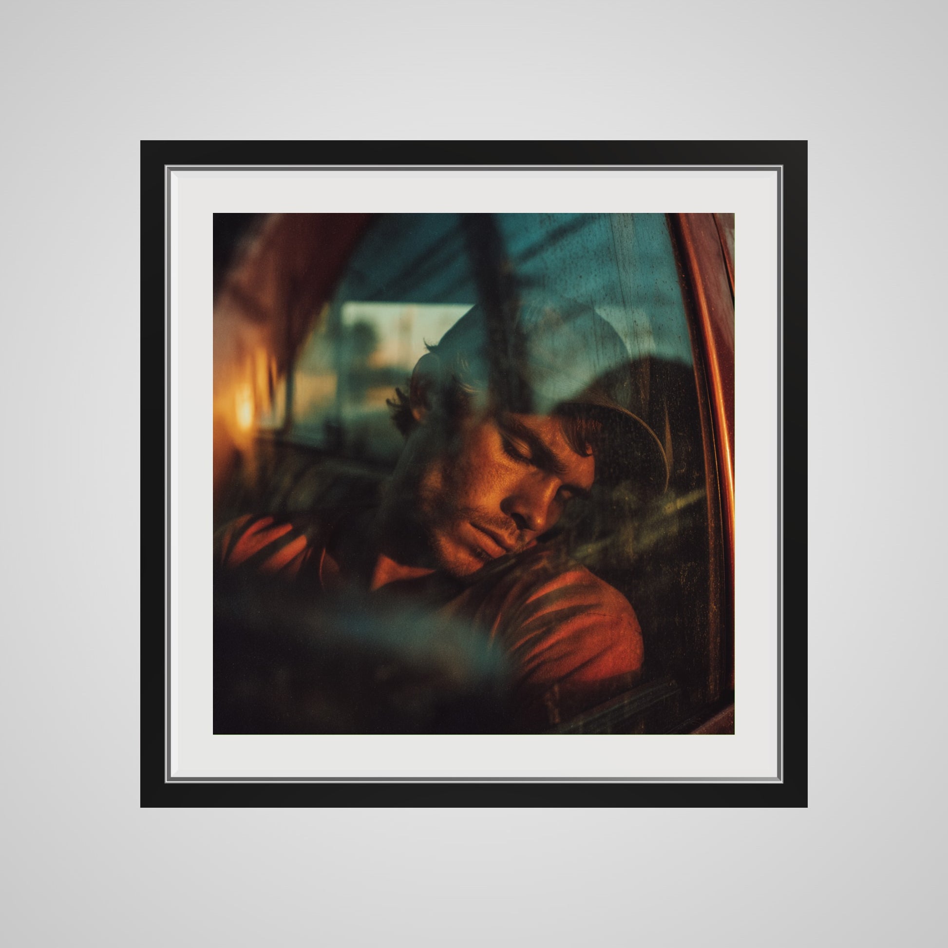 This framed portrait captures a young man at rest inside a vehicle, his head tilted and eyes closed, seen through the soft distortion of glass. Warm, fading light settles across his face and shoulder, filtered by reflections and subtle streaks on the window. The image feels suspended in time—private, introspective, and quietly cinematic—inviting the viewer into a moment that feels both intimate and unreachable.