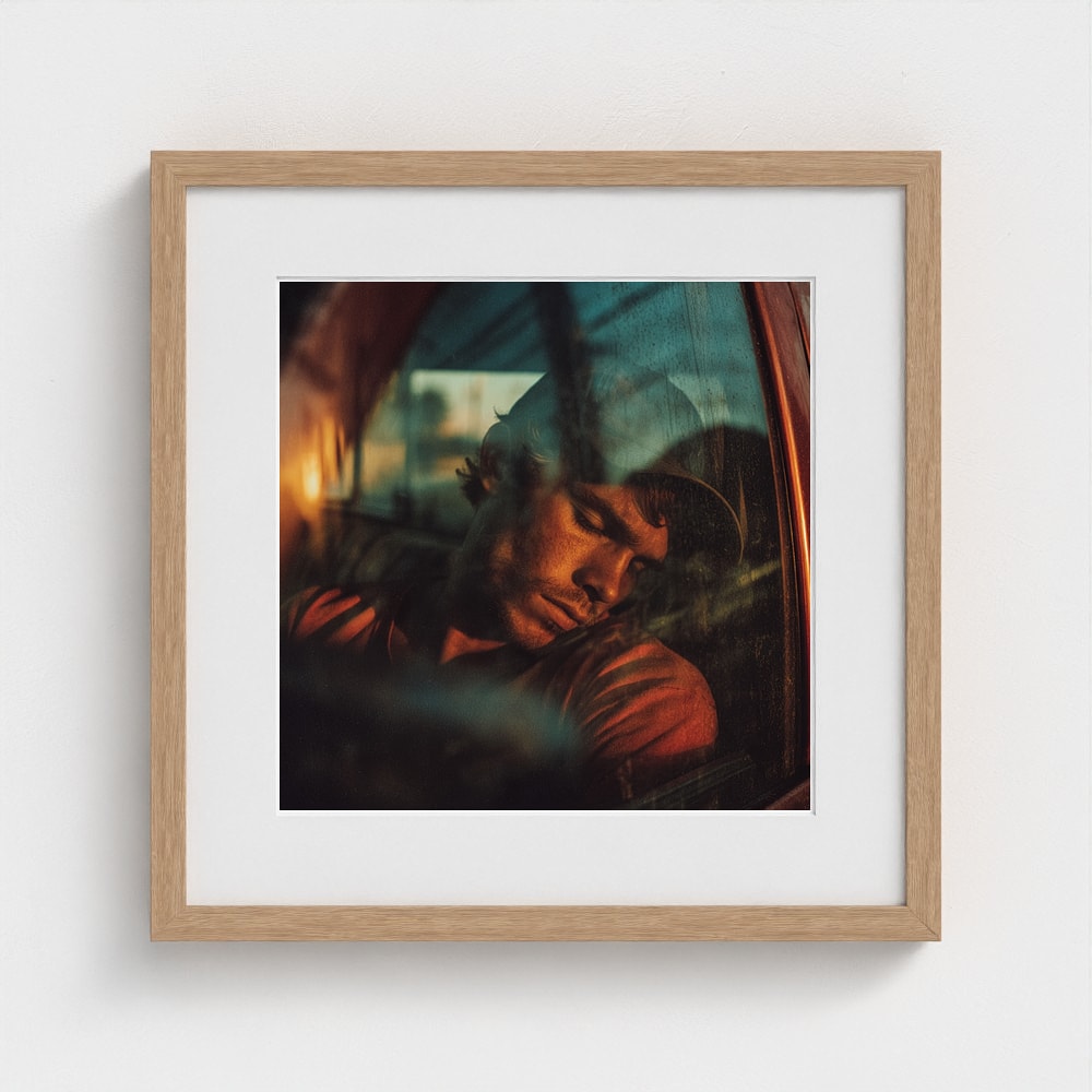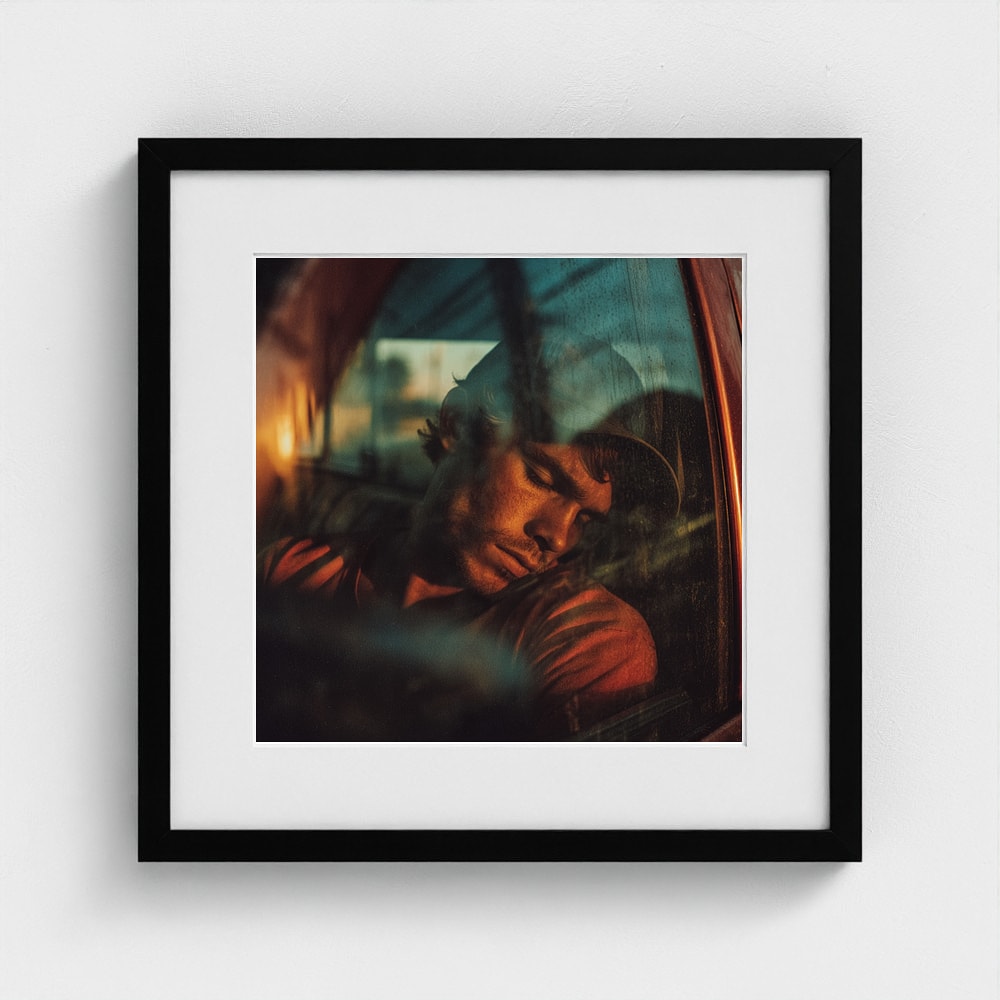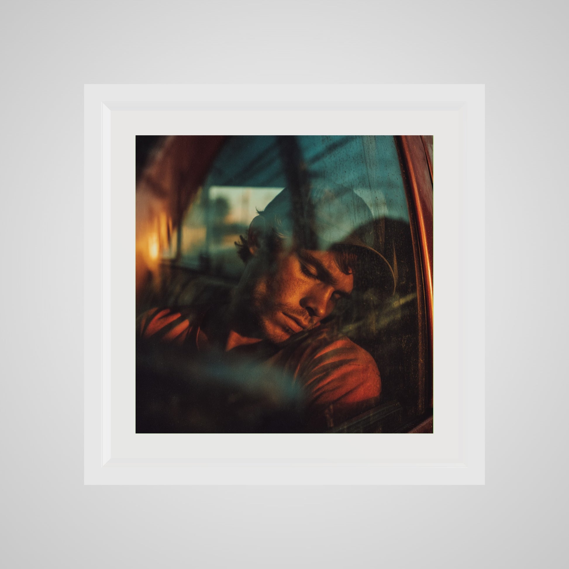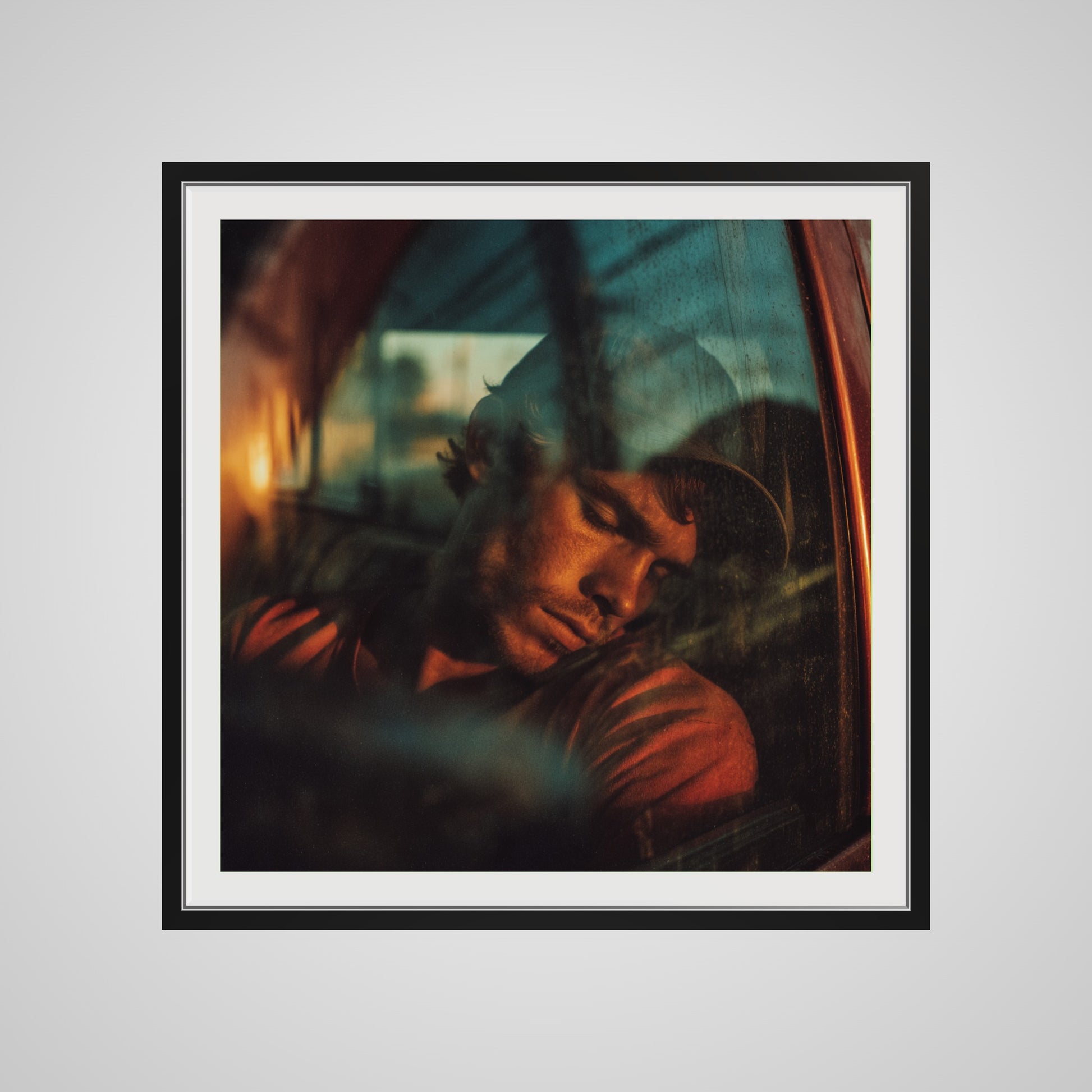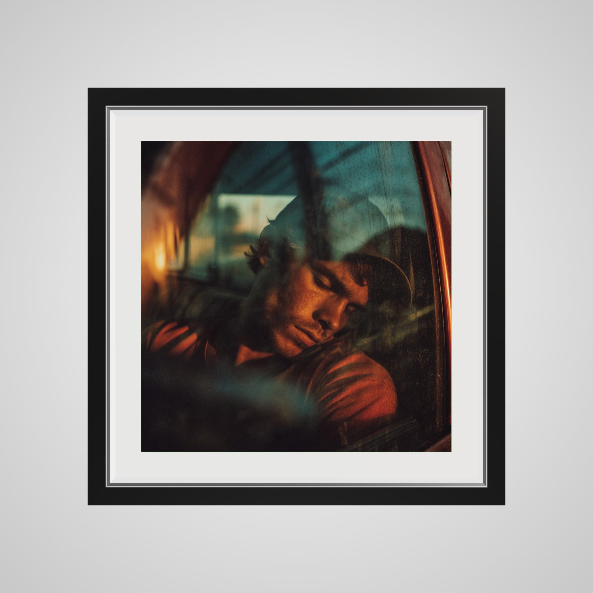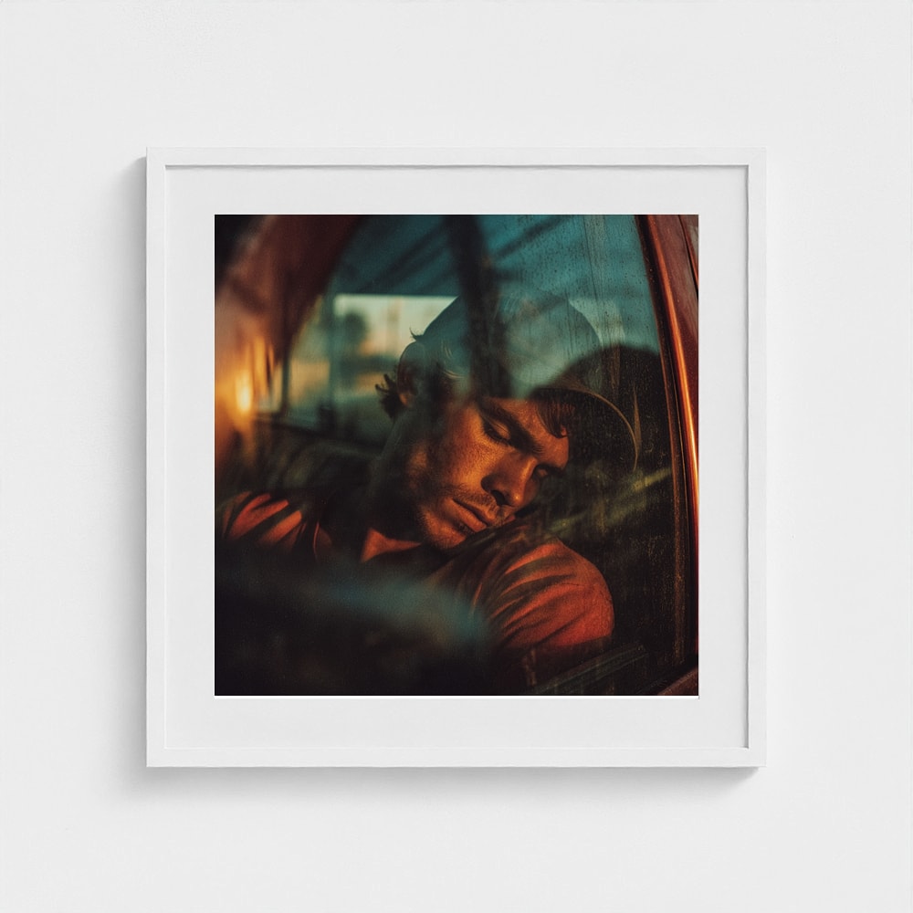 This framed portrait captures a young man at rest inside a vehicle, his head tilted and eyes closed, seen through the soft distortion of glass. Warm, fading light settles across his face and shoulder, filtered by reflections and subtle streaks on the window. The image feels suspended in time—private, introspective, and quietly cinematic—inviting the viewer into a moment that feels both intimate and unreachable.