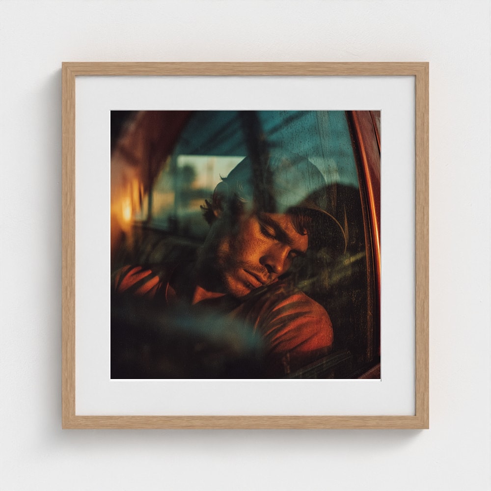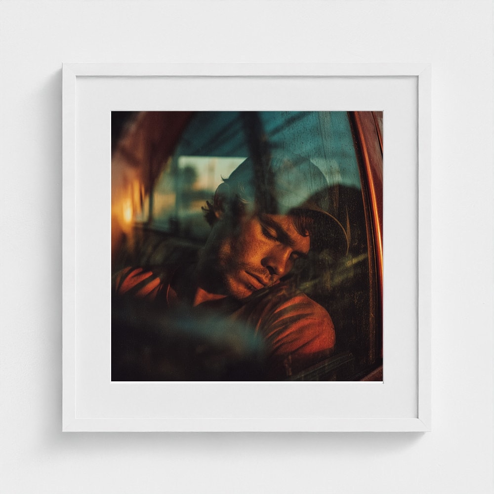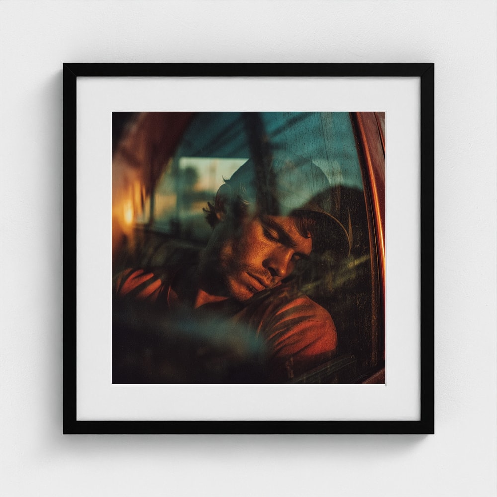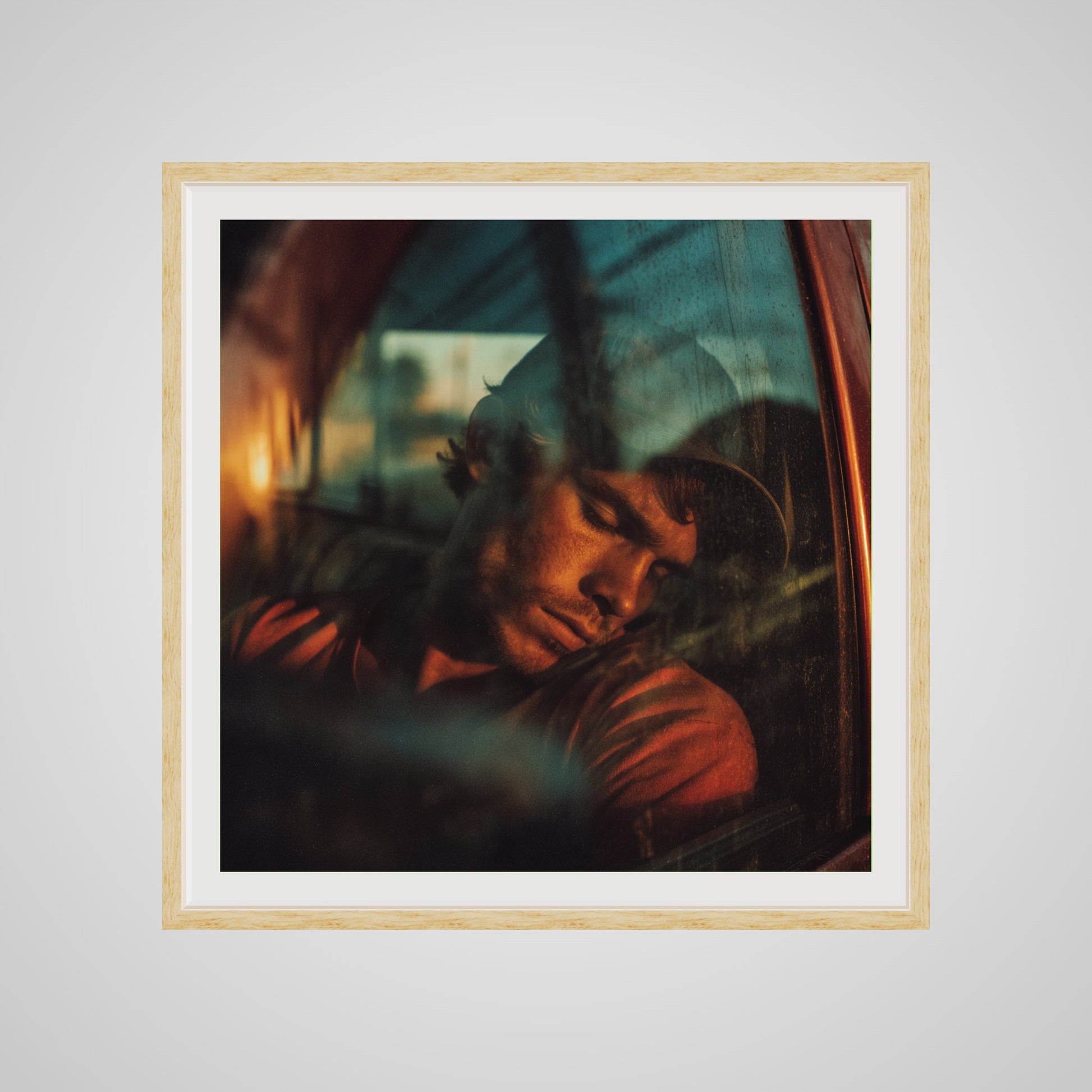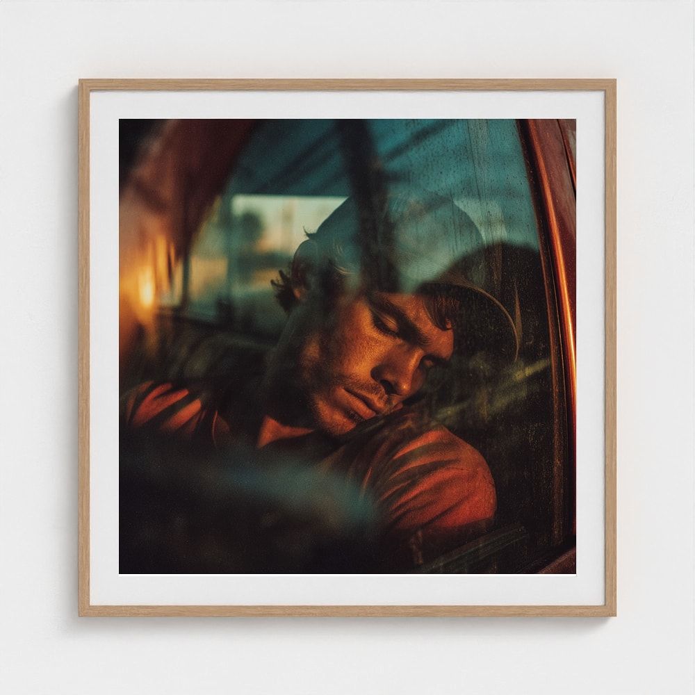 This framed portrait captures a young man at rest inside a vehicle, his head tilted and eyes closed, seen through the soft distortion of glass. Warm, fading light settles across his face and shoulder, filtered by reflections and subtle streaks on the window. The image feels suspended in time—private, introspective, and quietly cinematic—inviting the viewer into a moment that feels both intimate and unreachable.