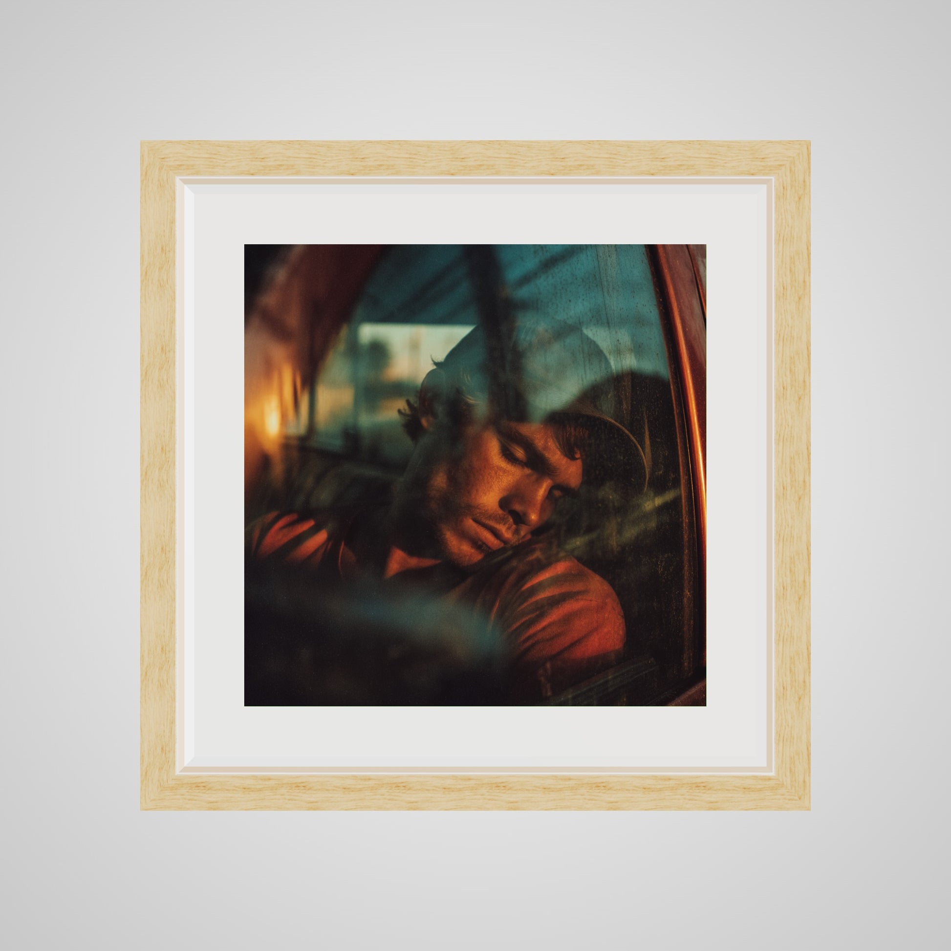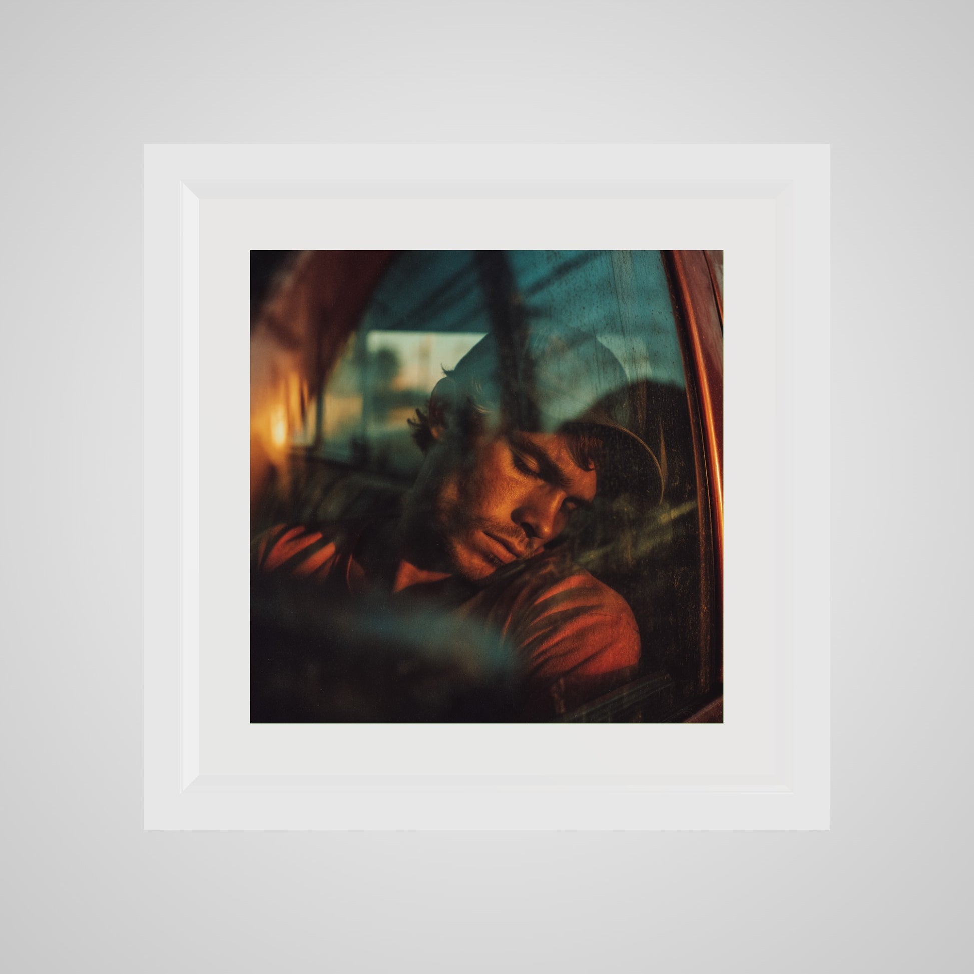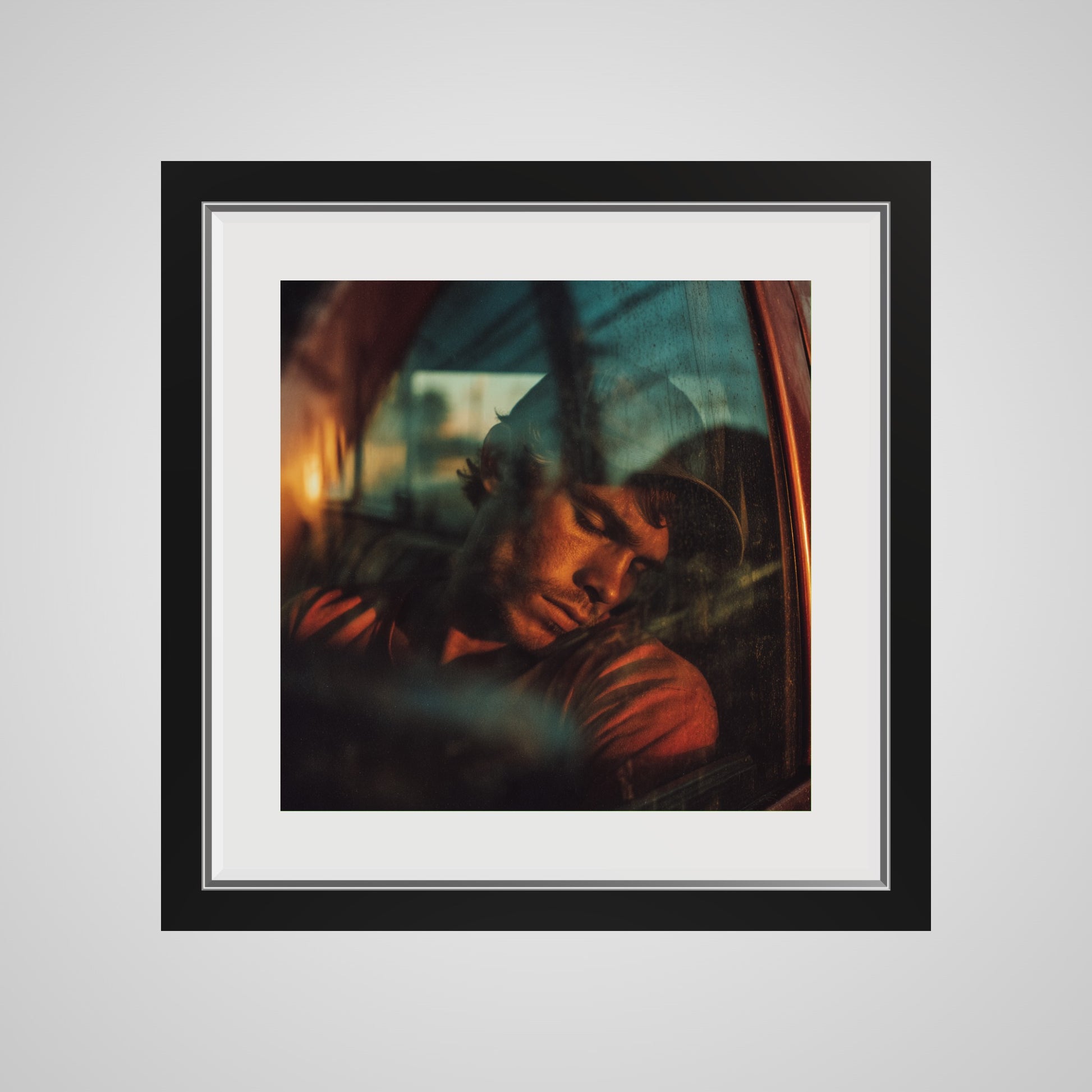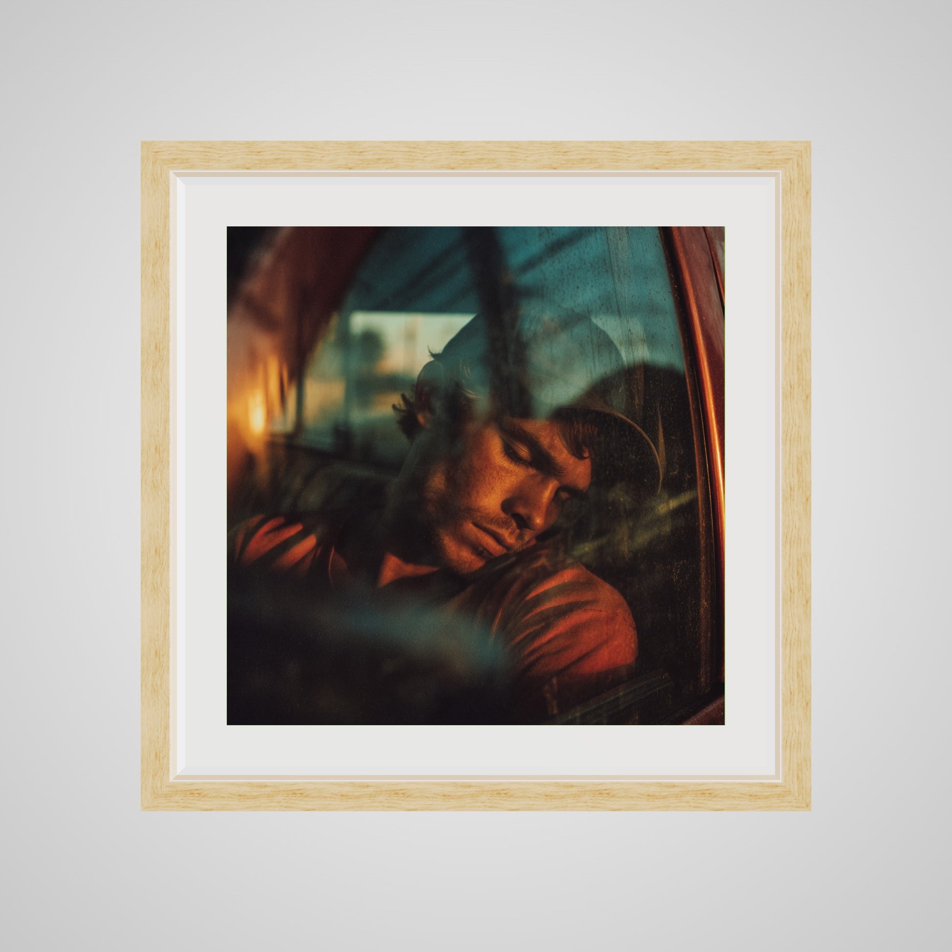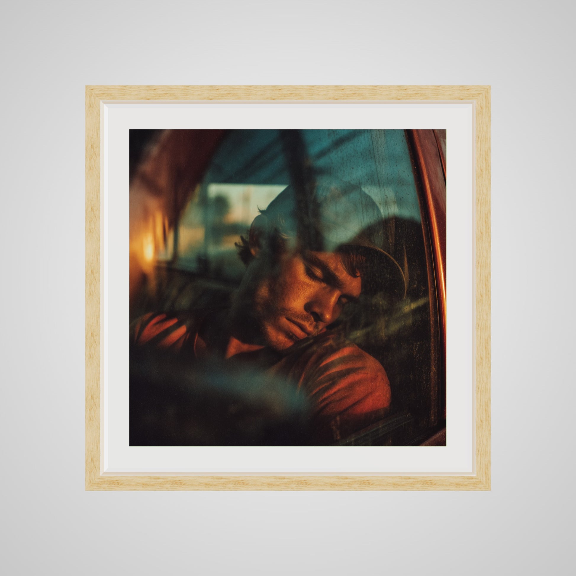 This framed portrait captures a young man at rest inside a vehicle, his head tilted and eyes closed, seen through the soft distortion of glass. Warm, fading light settles across his face and shoulder, filtered by reflections and subtle streaks on the window. The image feels suspended in time—private, introspective, and quietly cinematic—inviting the viewer into a moment that feels both intimate and unreachable.