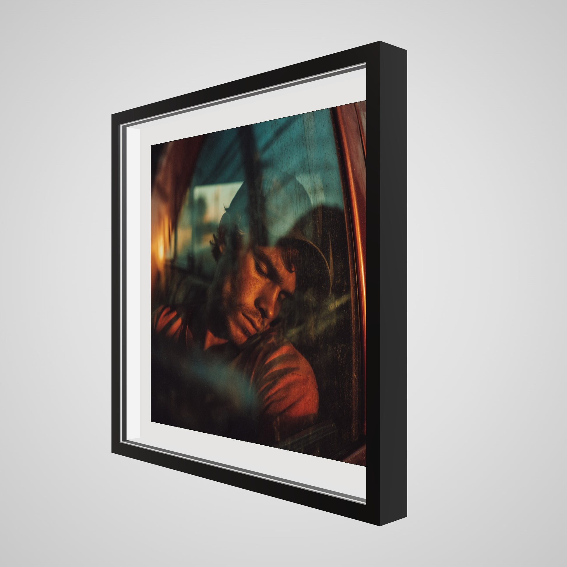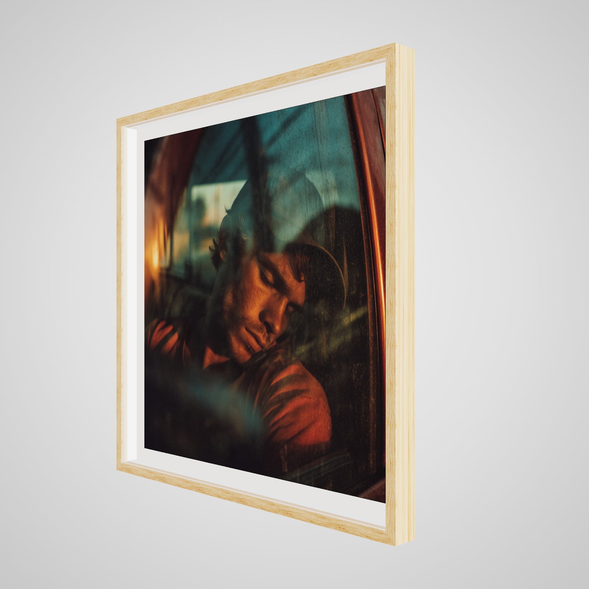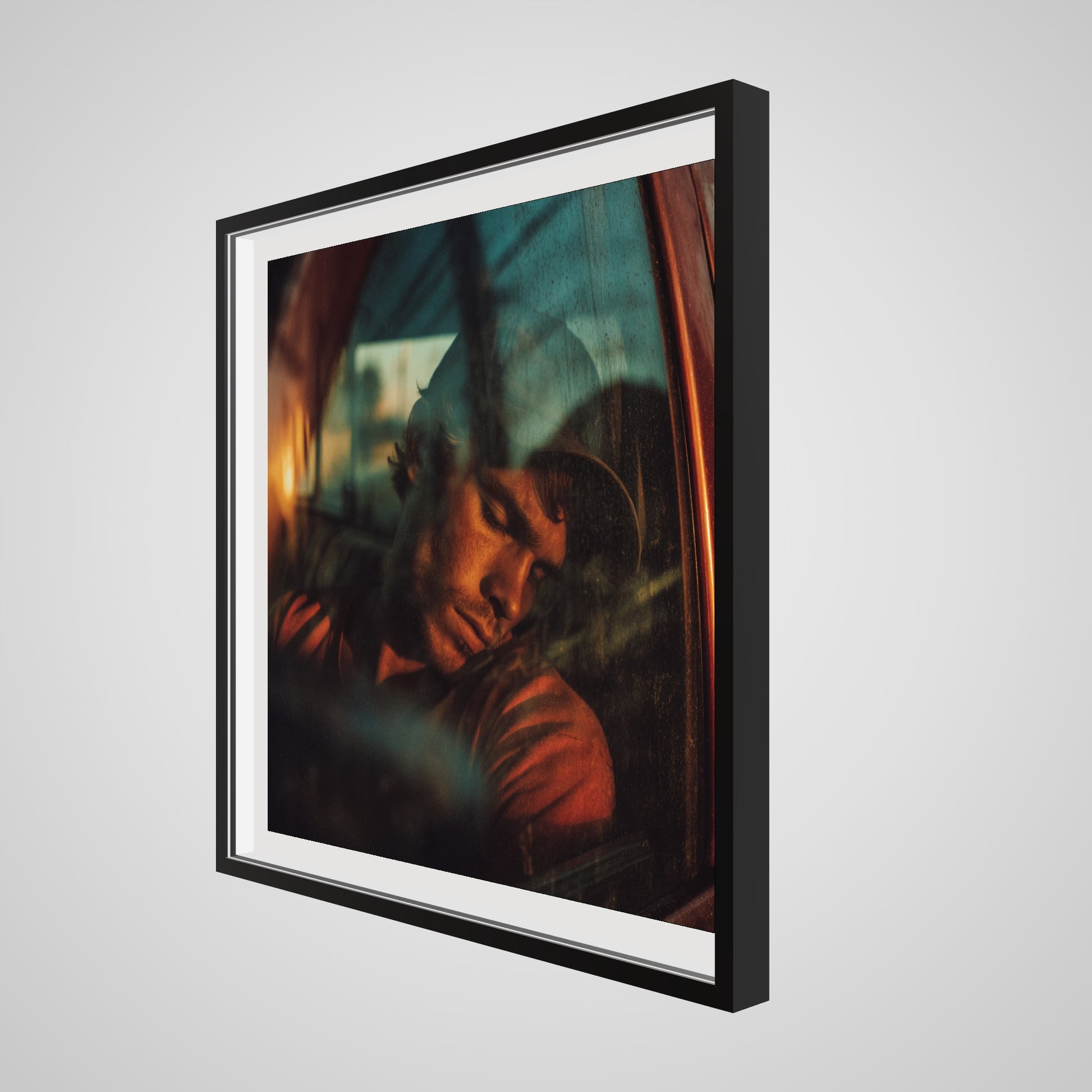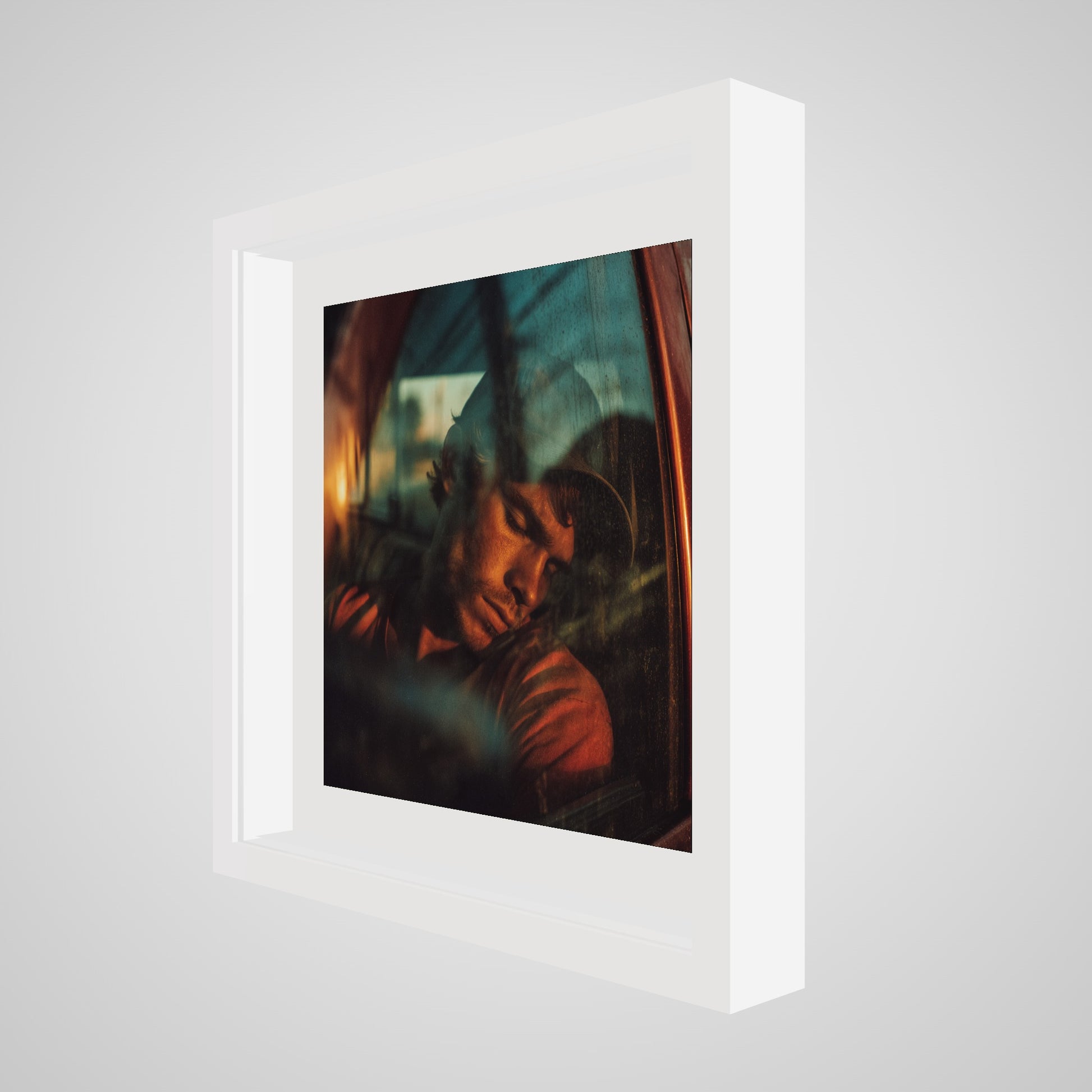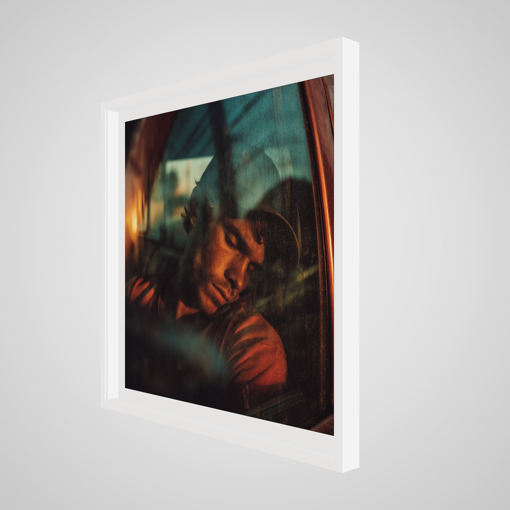 This framed portrait captures a young man at rest inside a vehicle, his head tilted and eyes closed, seen through the soft distortion of glass. Warm, fading light settles across his face and shoulder, filtered by reflections and subtle streaks on the window. The image feels suspended in time—private, introspective, and quietly cinematic—inviting the viewer into a moment that feels both intimate and unreachable.