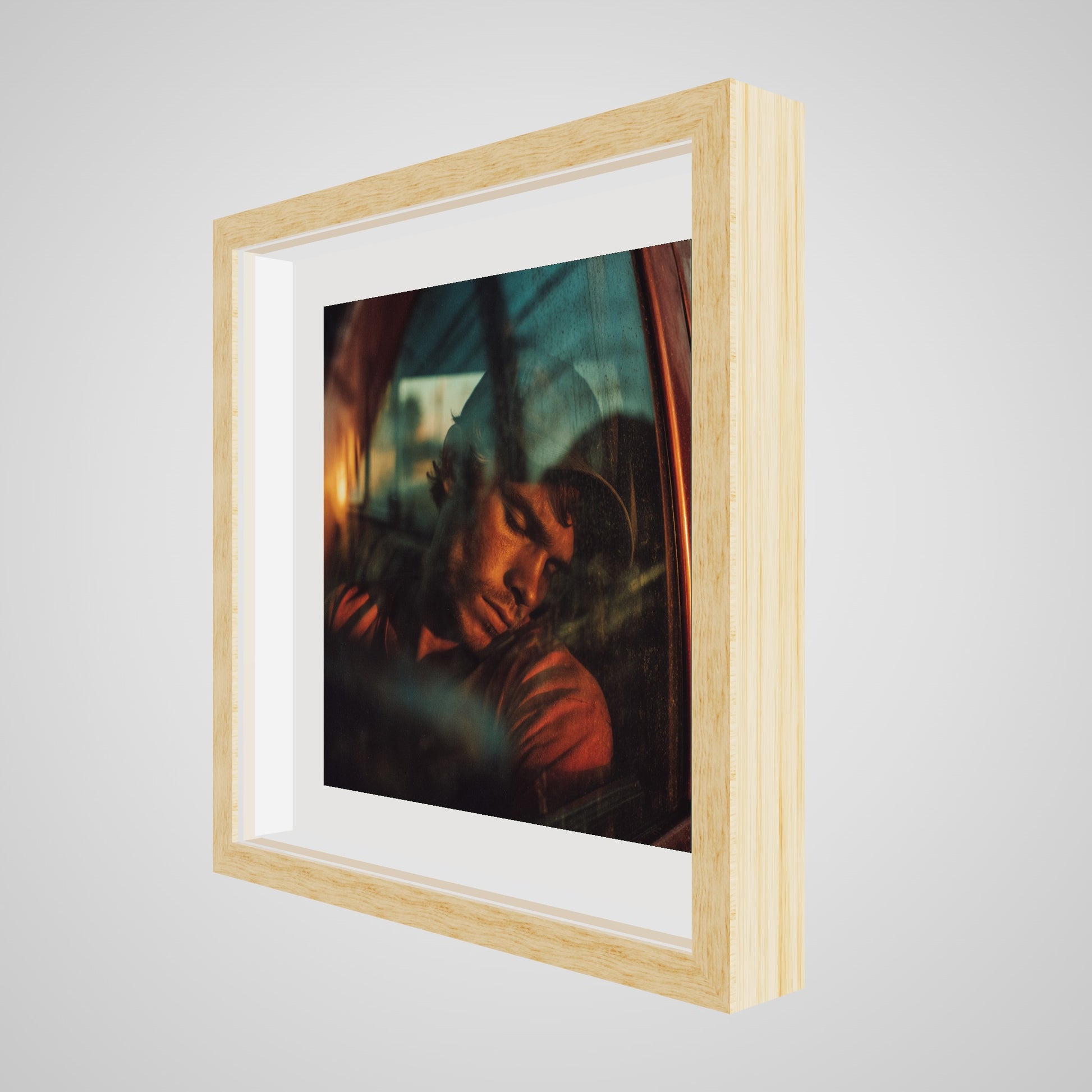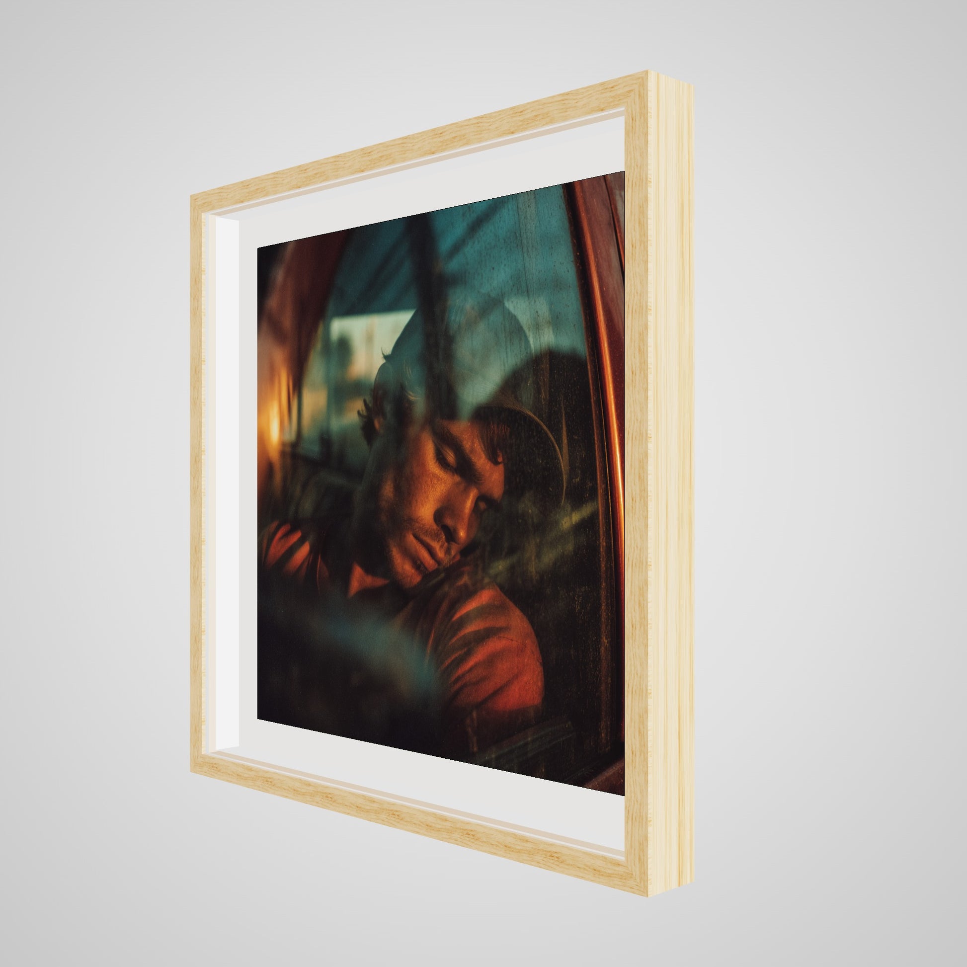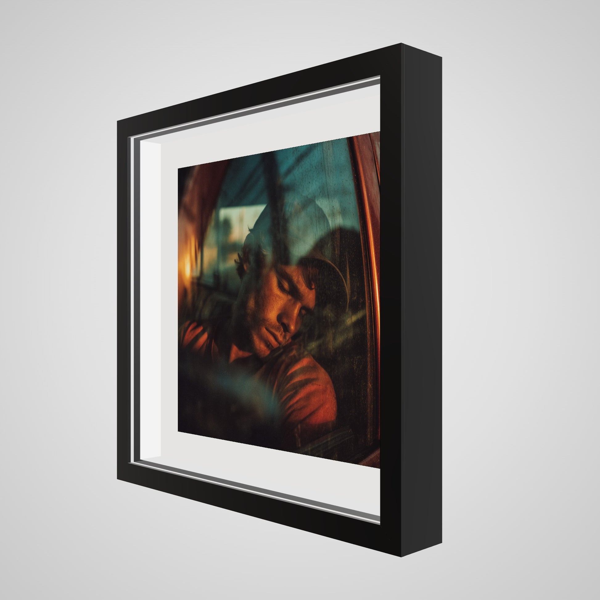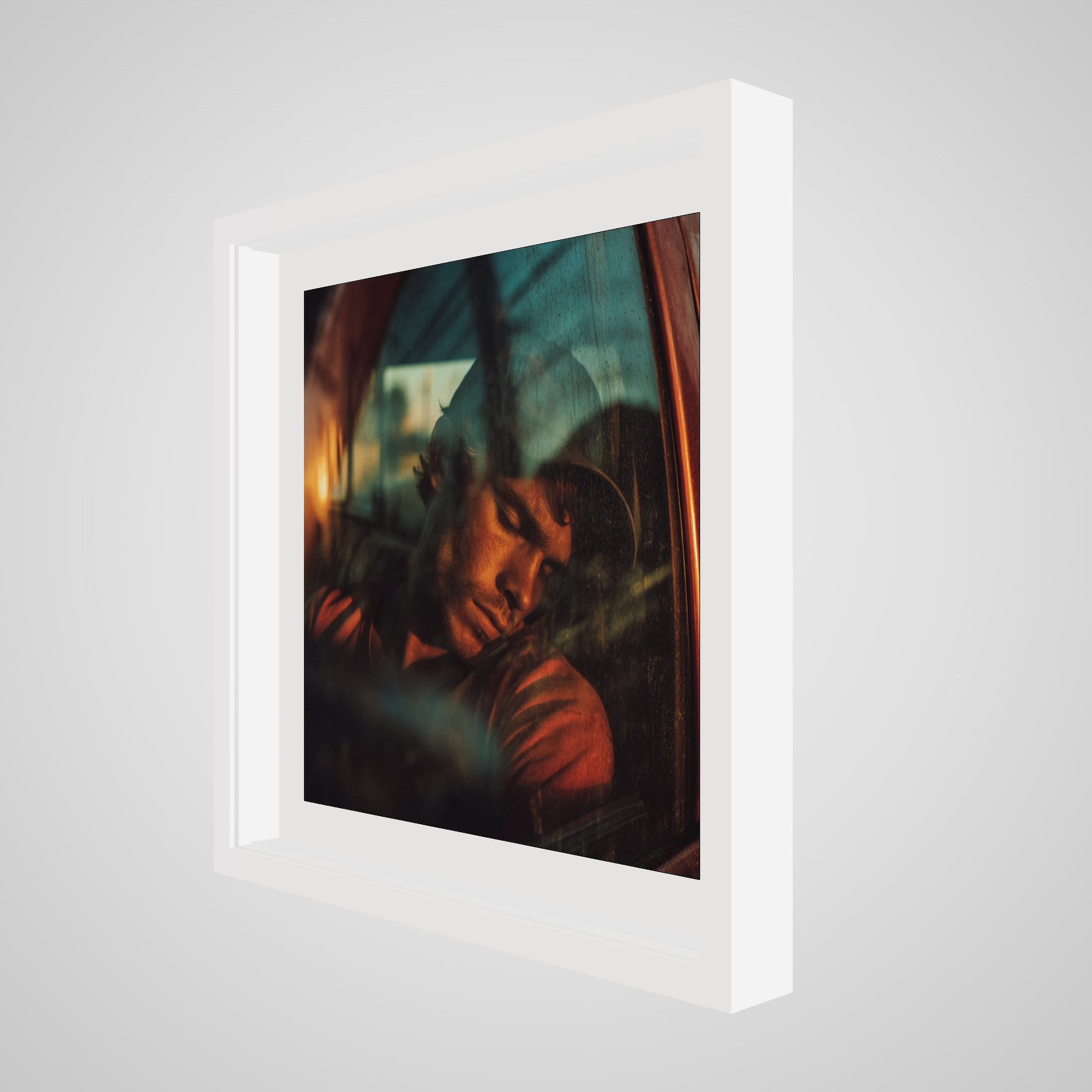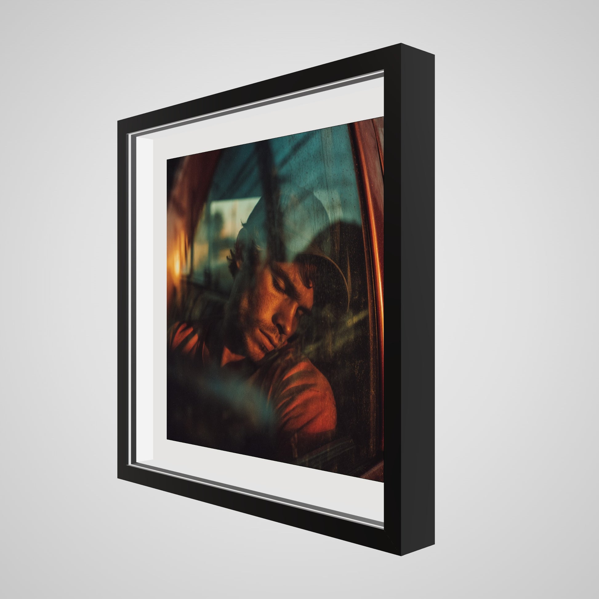 This framed portrait captures a young man at rest inside a vehicle, his head tilted and eyes closed, seen through the soft distortion of glass. Warm, fading light settles across his face and shoulder, filtered by reflections and subtle streaks on the window. The image feels suspended in time—private, introspective, and quietly cinematic—inviting the viewer into a moment that feels both intimate and unreachable.